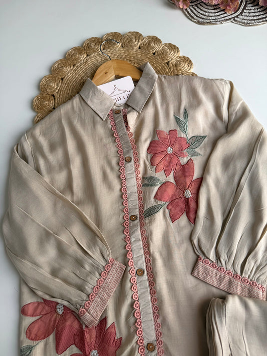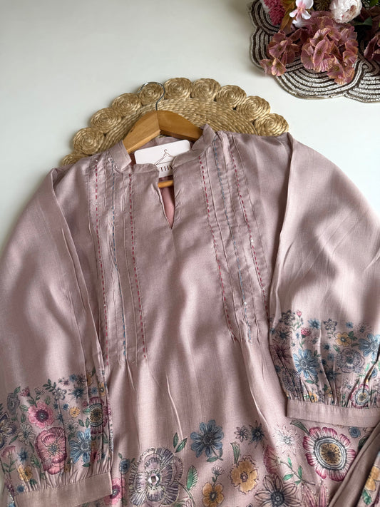 K229 - Muslin silk embroidered Aline Kurti with pants and dupatta