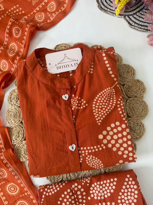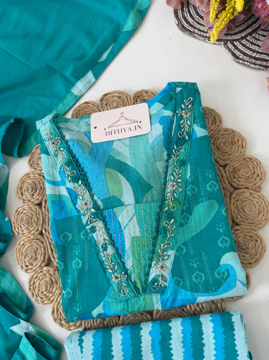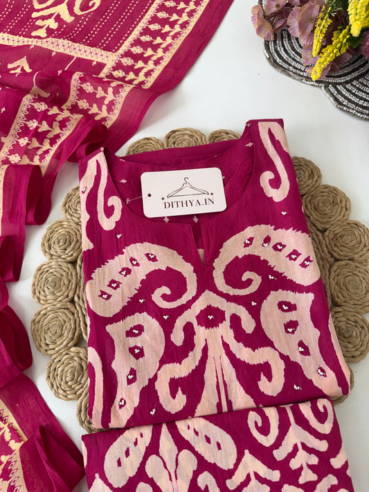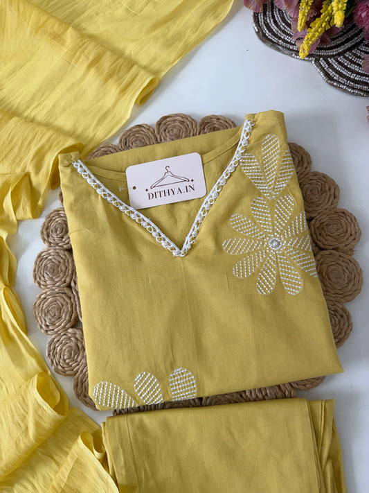 K251 - Mul chanderi appliqué work aline Kurti with pants and dupatta