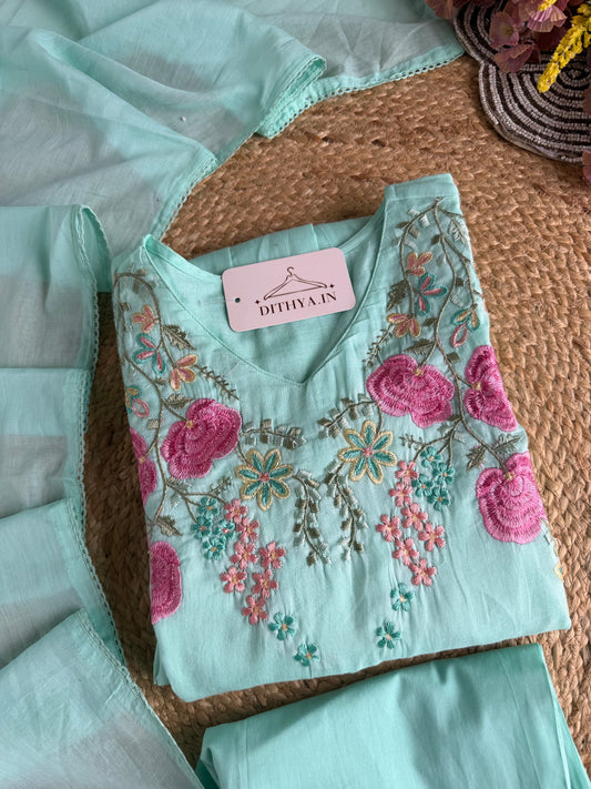 K083 - Muslin silk embroidered straight Kurti with pants and dupatta