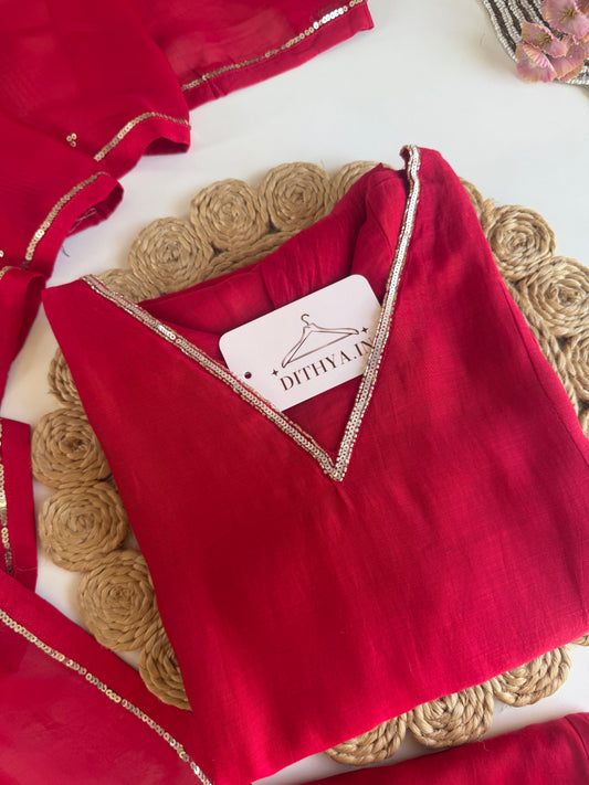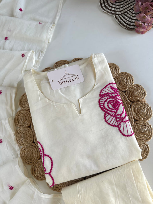 K457 - Mul chanderi handwork aline Kurti with pants and dupatta