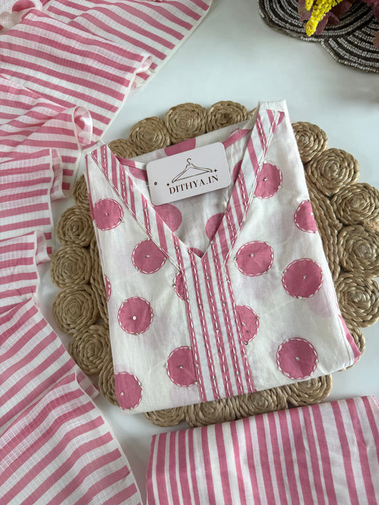K449 - Mul cotton embroidered Aline Kurti with pants and dupatta