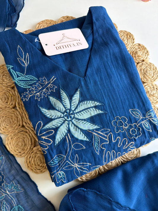 K108 - Mul chanderi embroidered Aline Kurti with pants and dupatta
