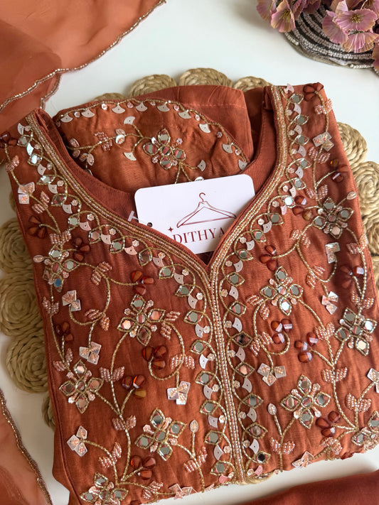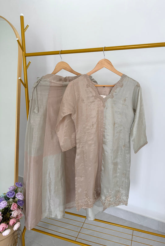 K442 - Glass tissue silk handwork short Kurti with skirt and dupatta