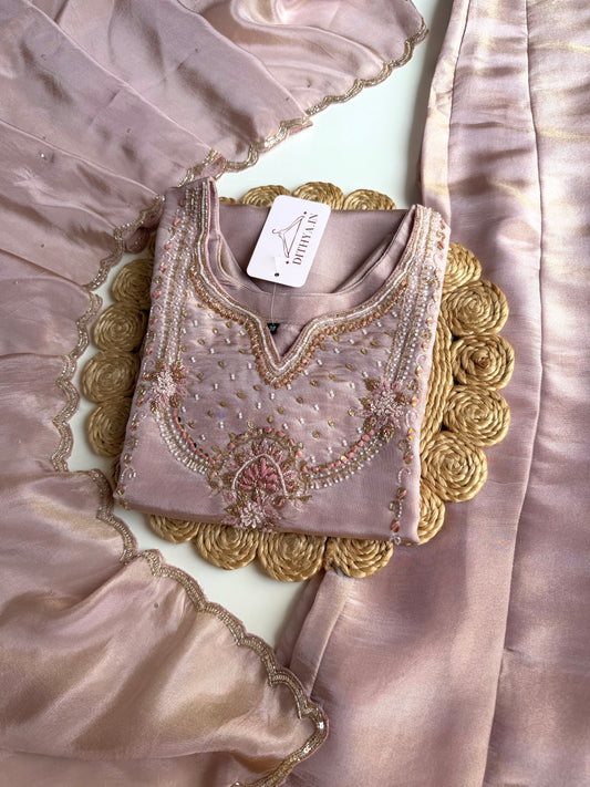 K553 - Tissue silk handwork short Kurti with divider pants and dupatta
