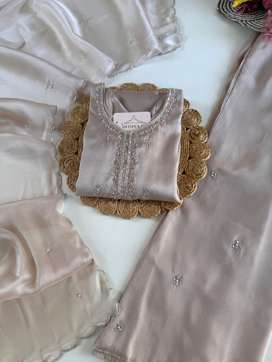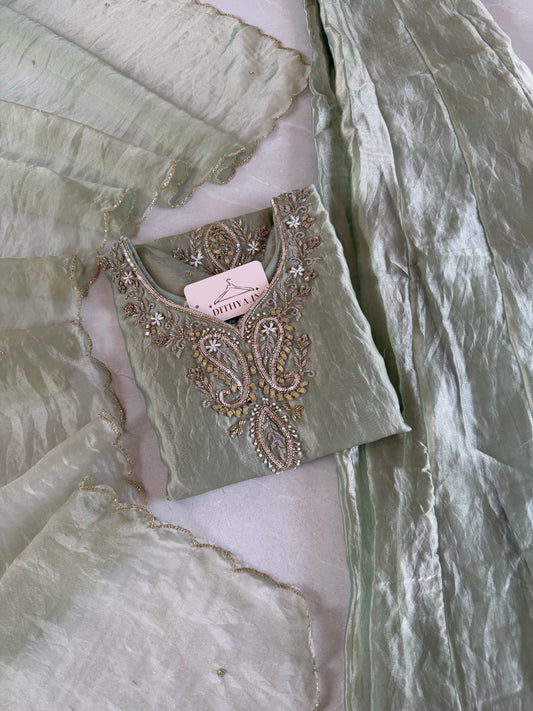 K020 - Glass tissue silk handwork short Kurti with divider pants and dupatta