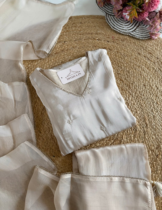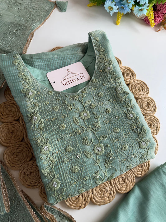 K628 - Chanderi silk knot appliqué work straight Kurti with pants and dupatta