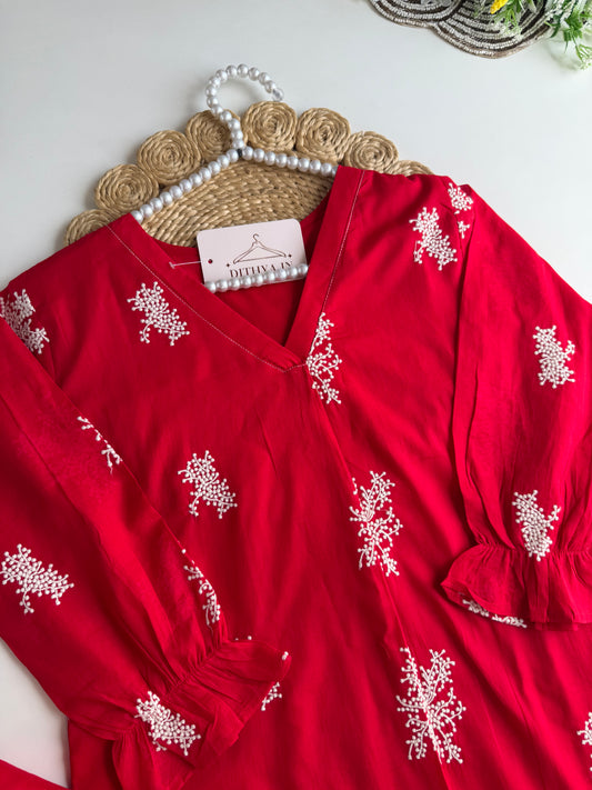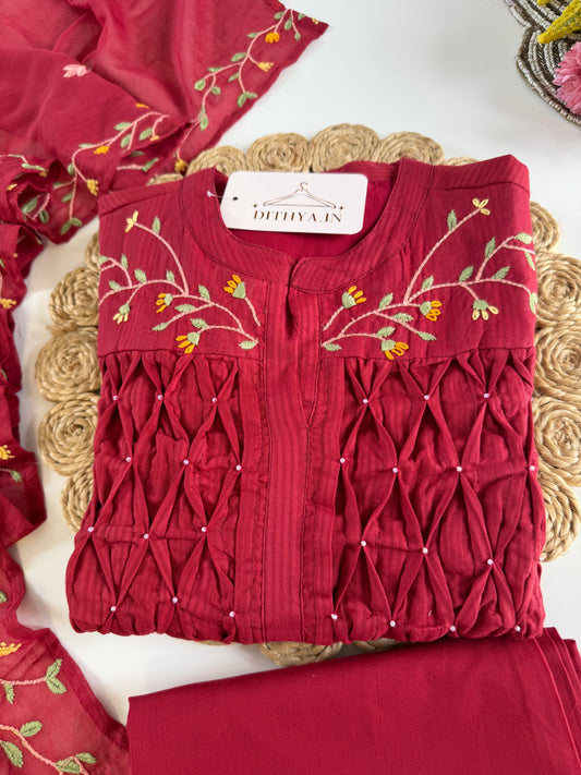 K620 - Mul cotton embroidered Aline Kurti with pants and dupatta