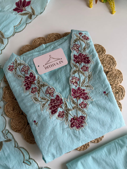 K391 - Mul chanderi handwork aline Kurti with pants and dupatta