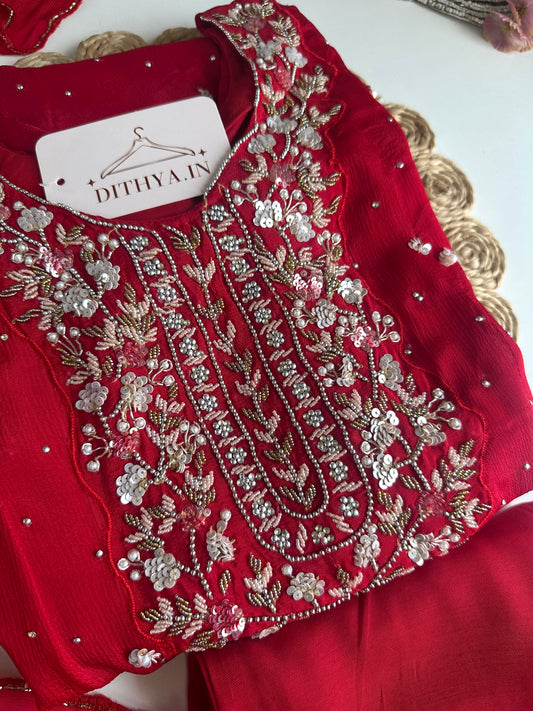 K484 - Mul Chanderi handwork Aline Kurti with pants and dupatta