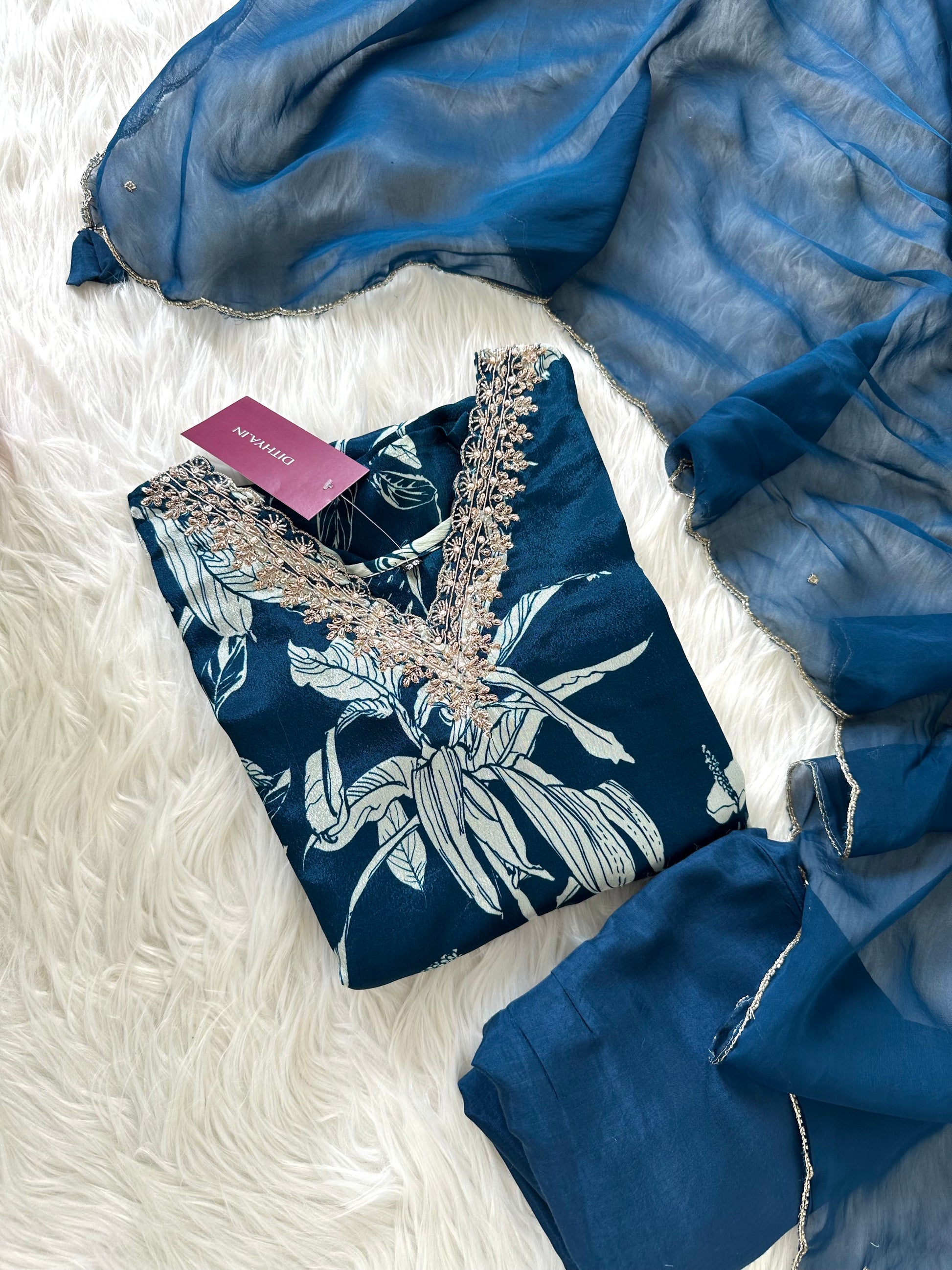 K431 - Chinnon floral straight Kurti with pants and dupatta in 2 colours
