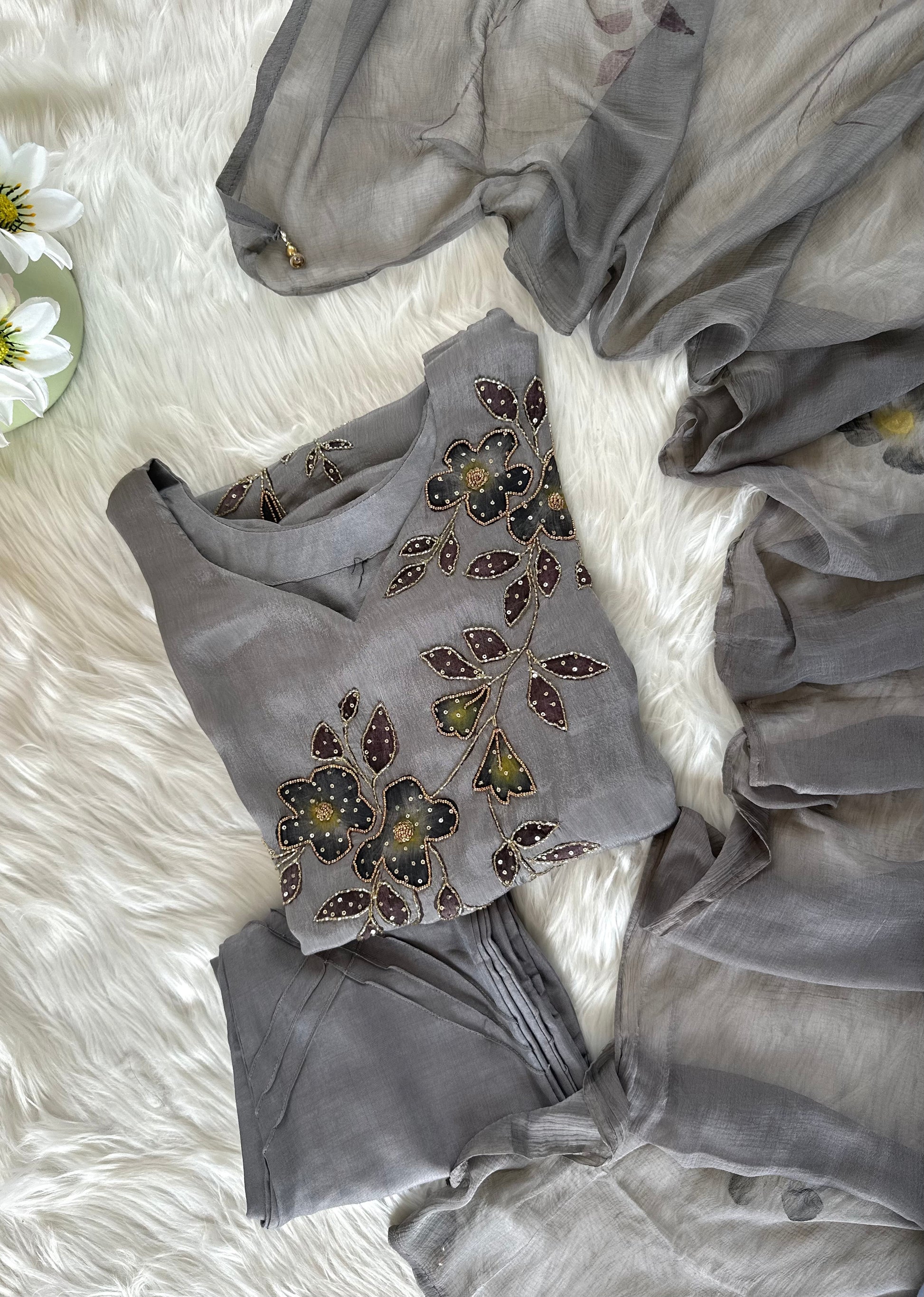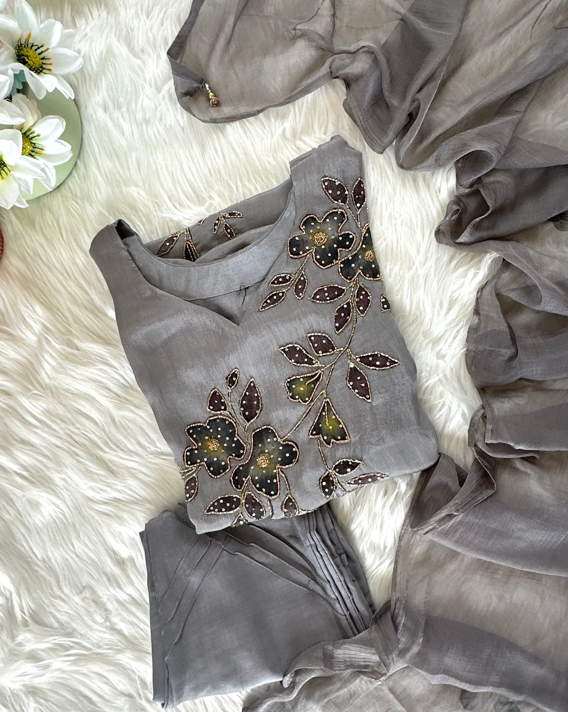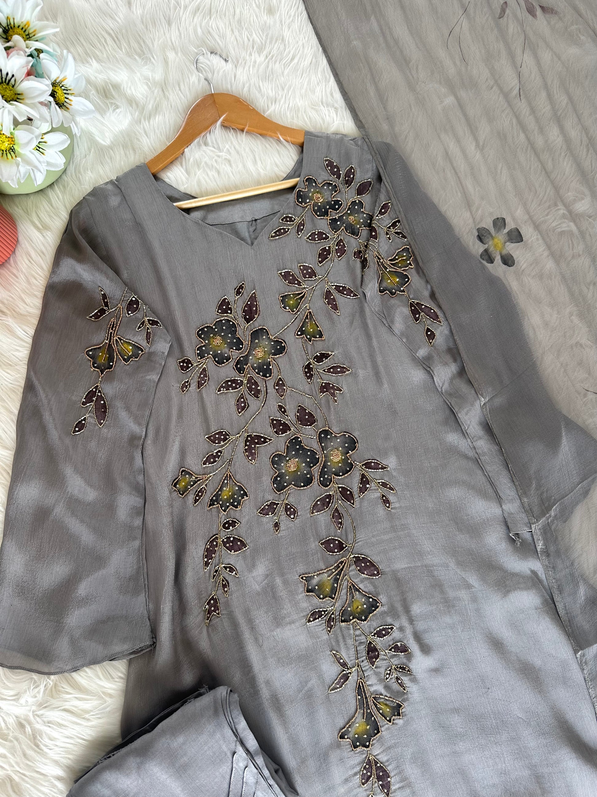 K380 - Chinnon handwork Aline Kurti with pants and chiffon dupatta