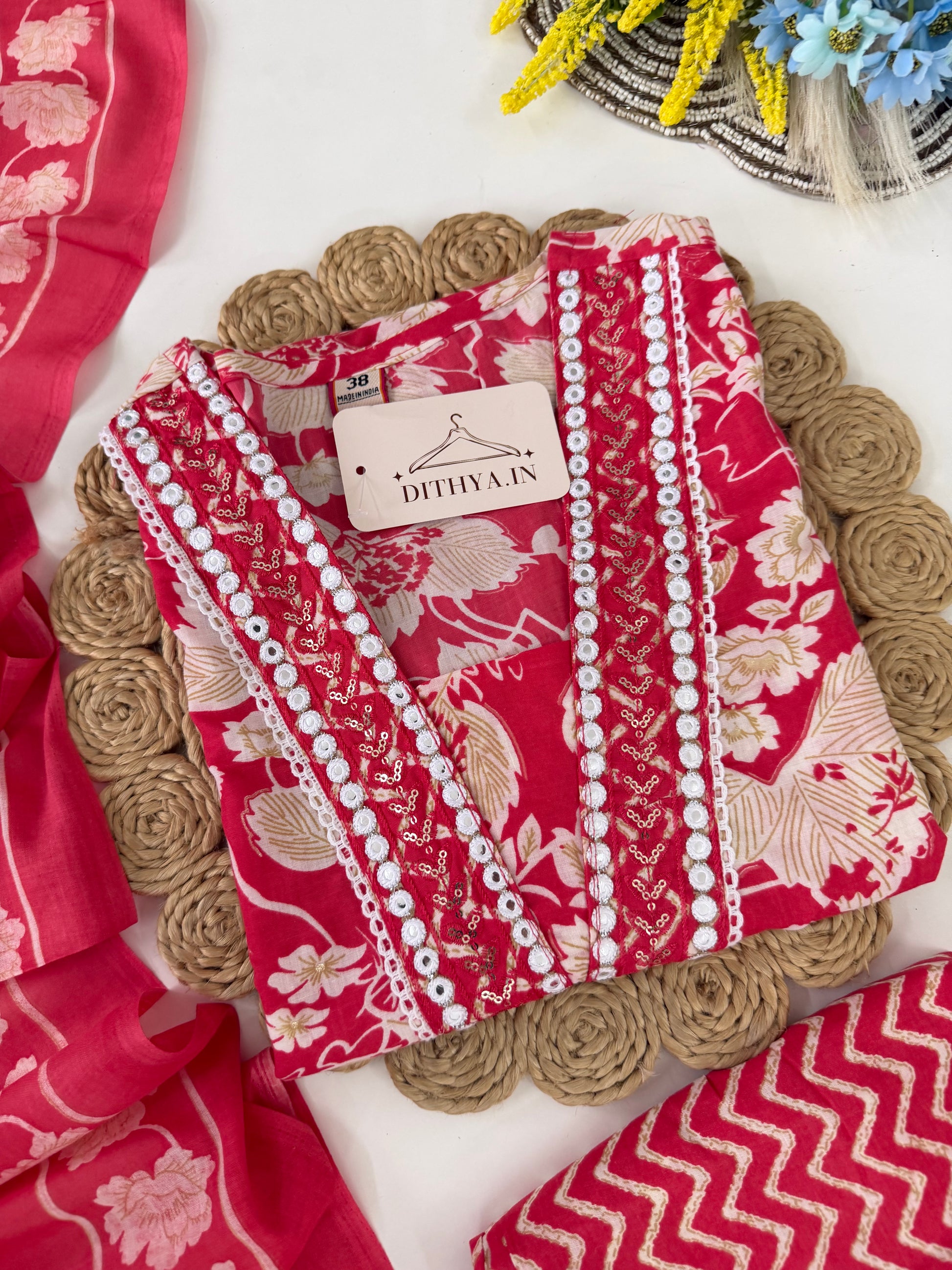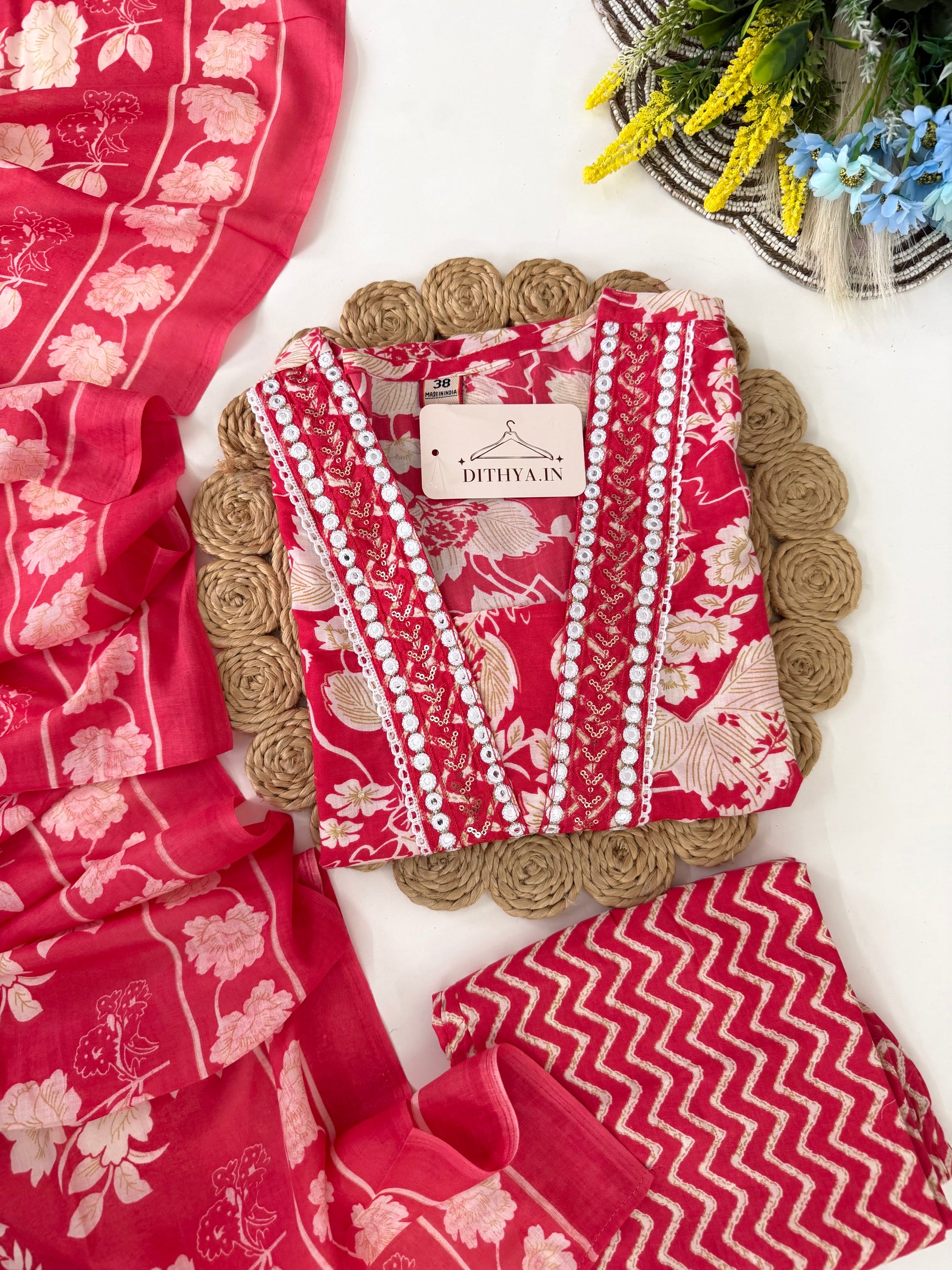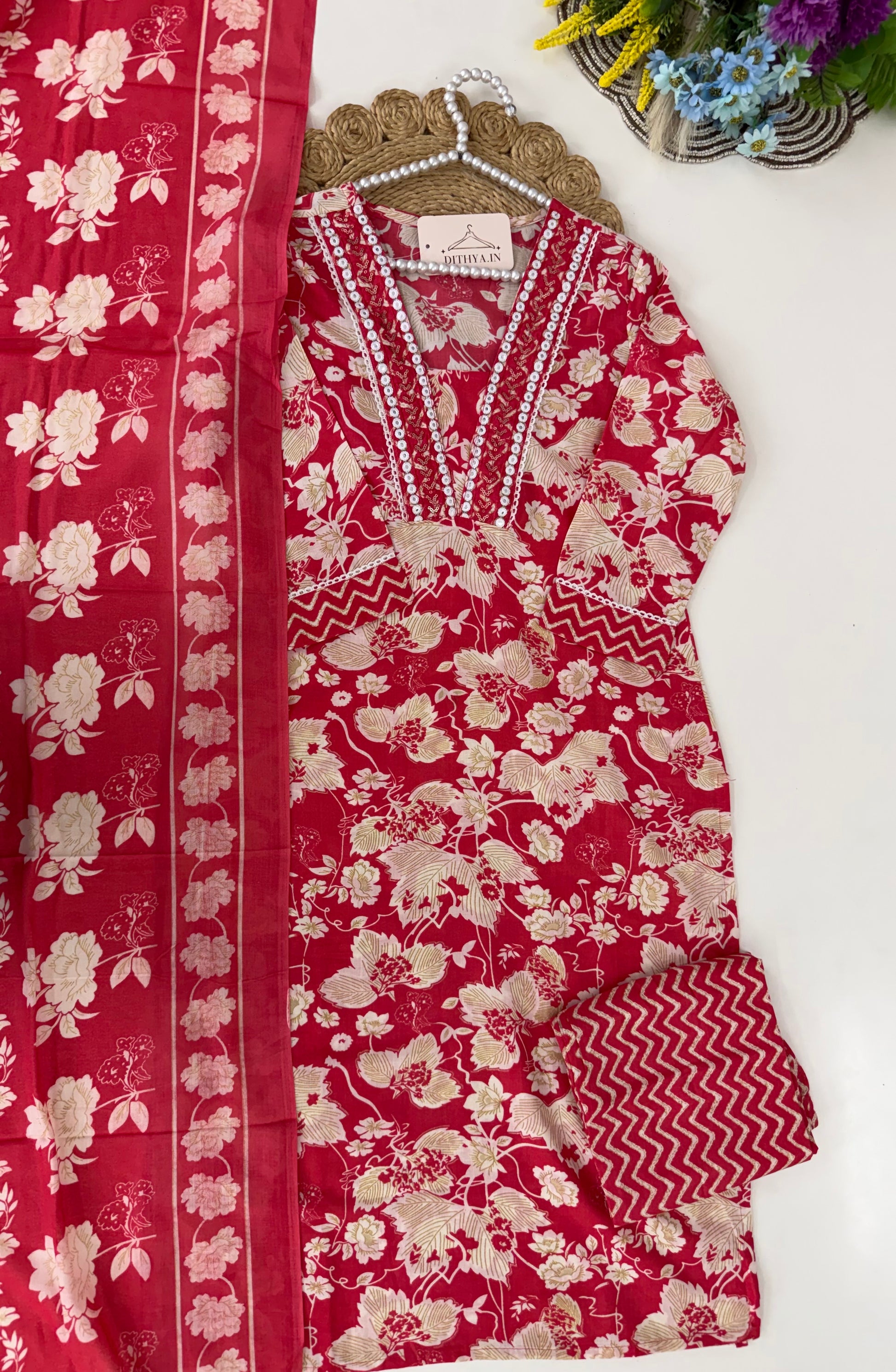 K444 - Cotton embroidered straight Kurti with pants and dupatta