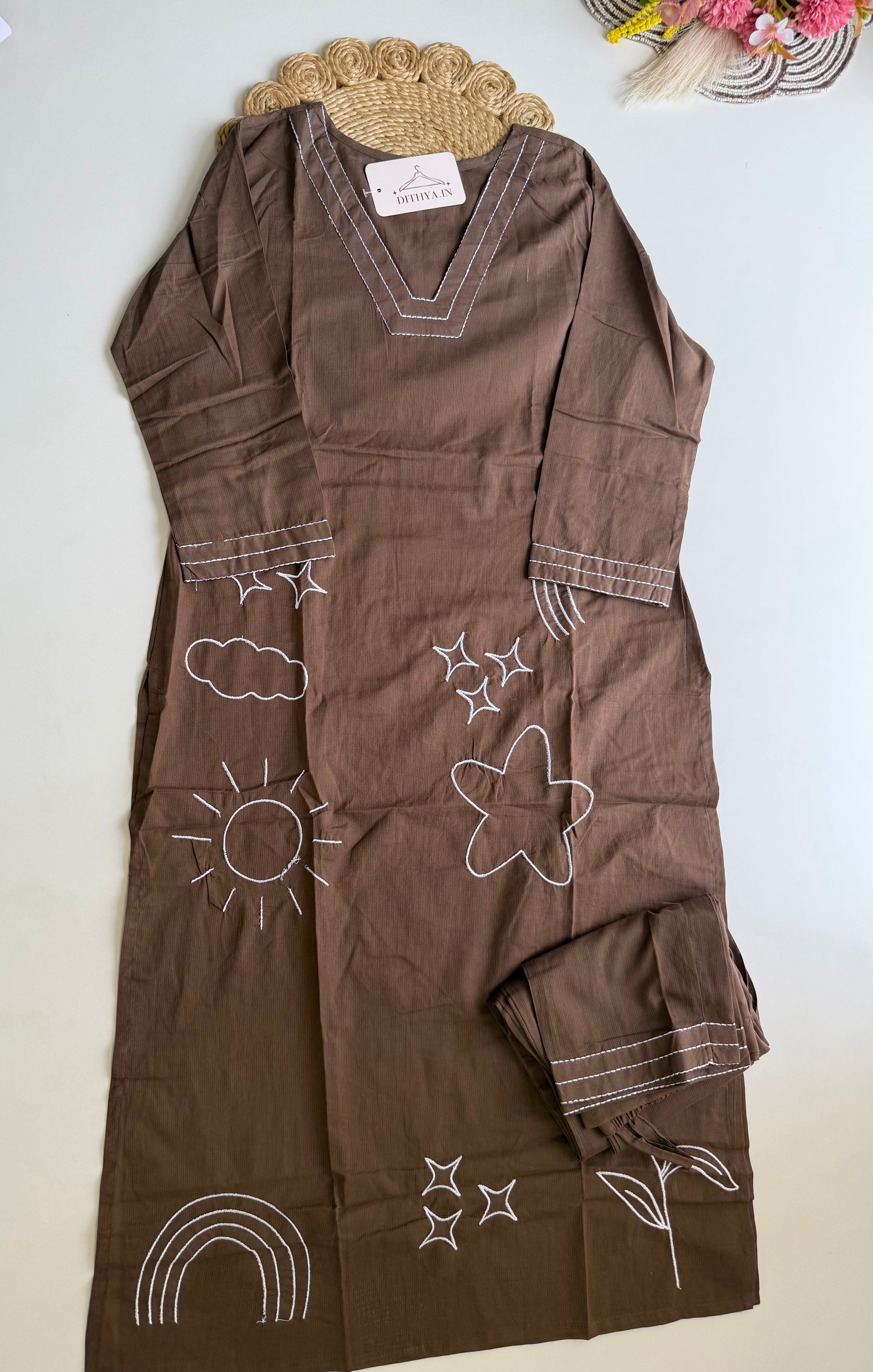 K460 - Cotton embroidered straight Kurti with pants in 2 colours