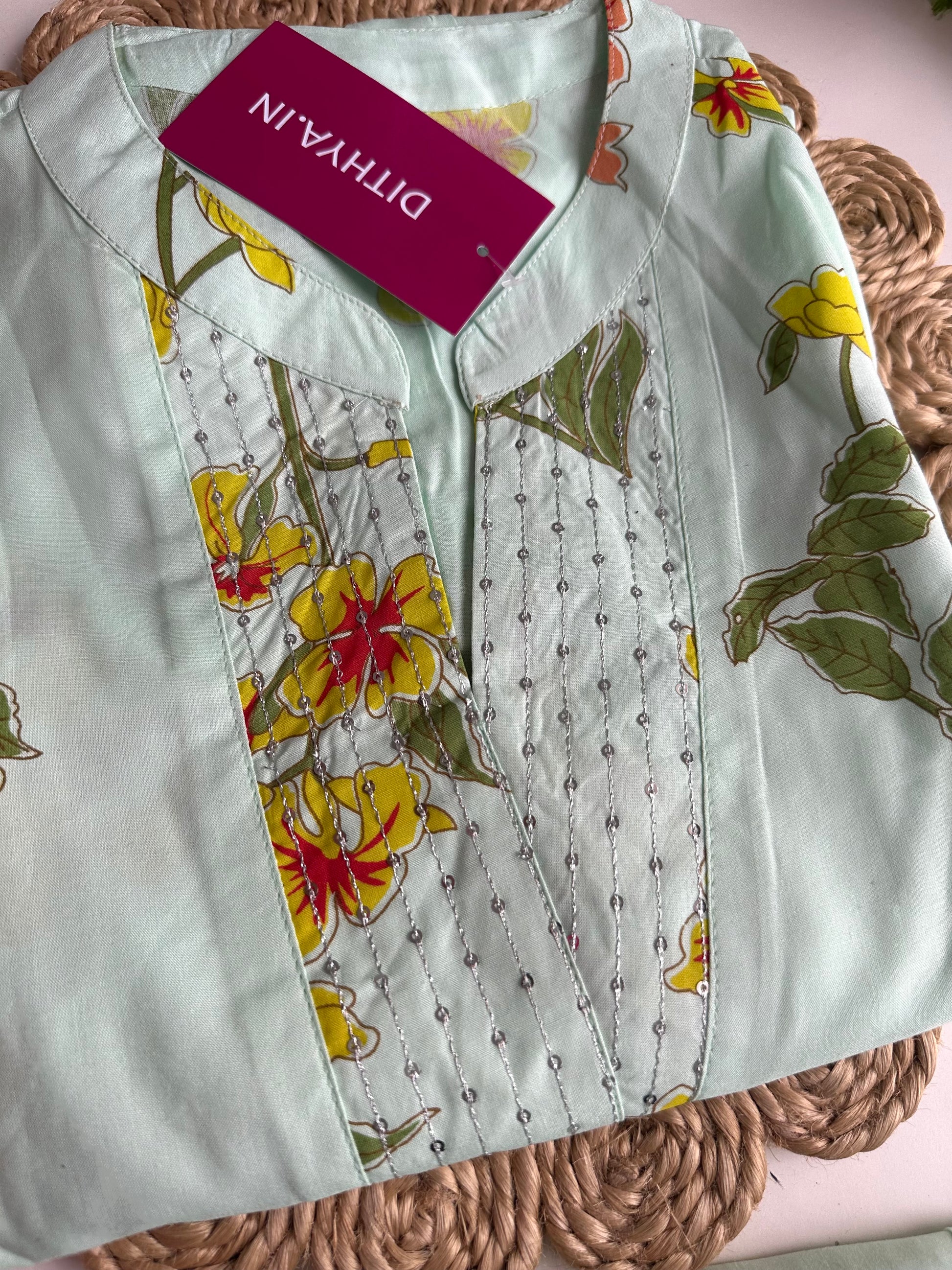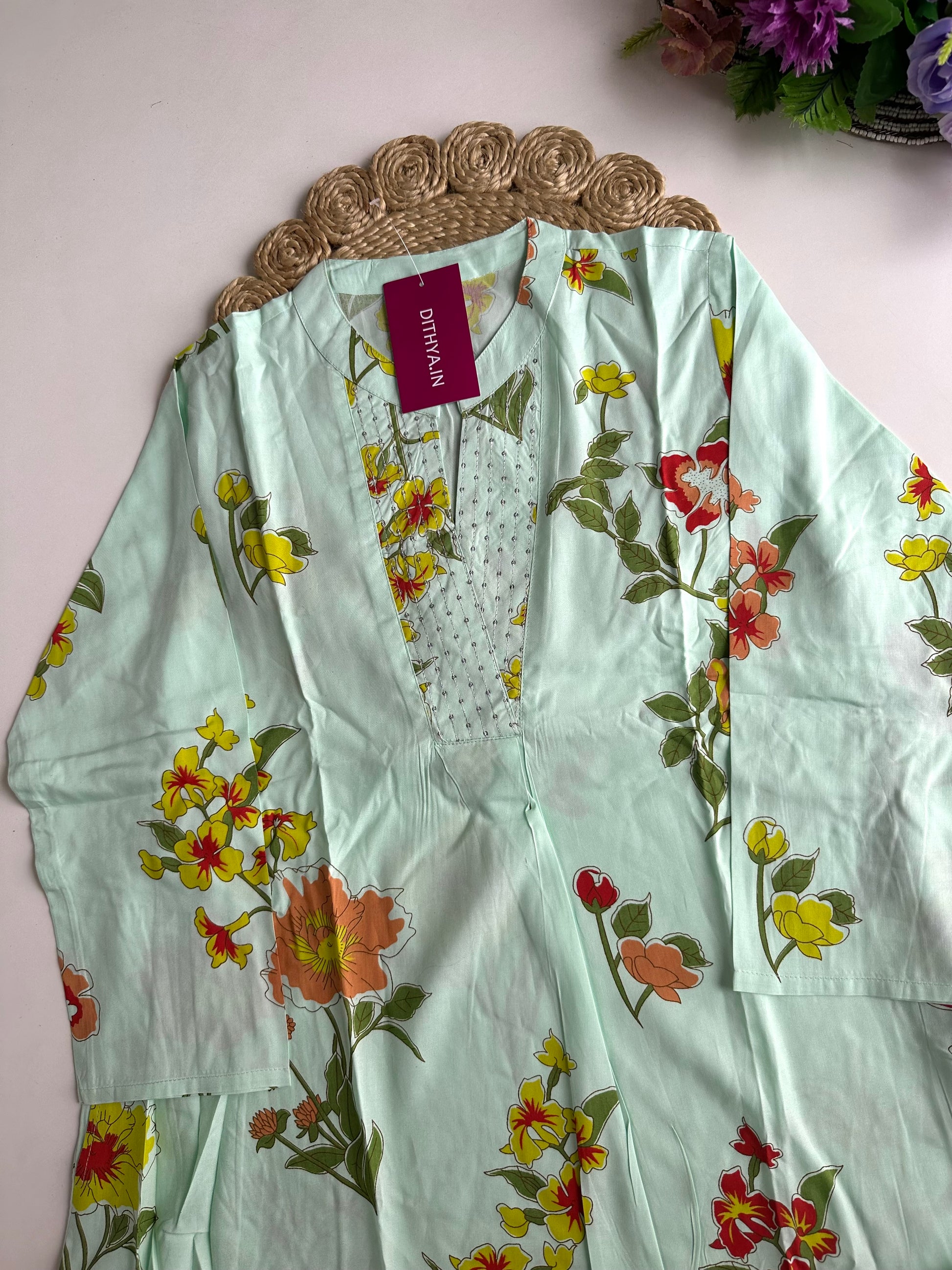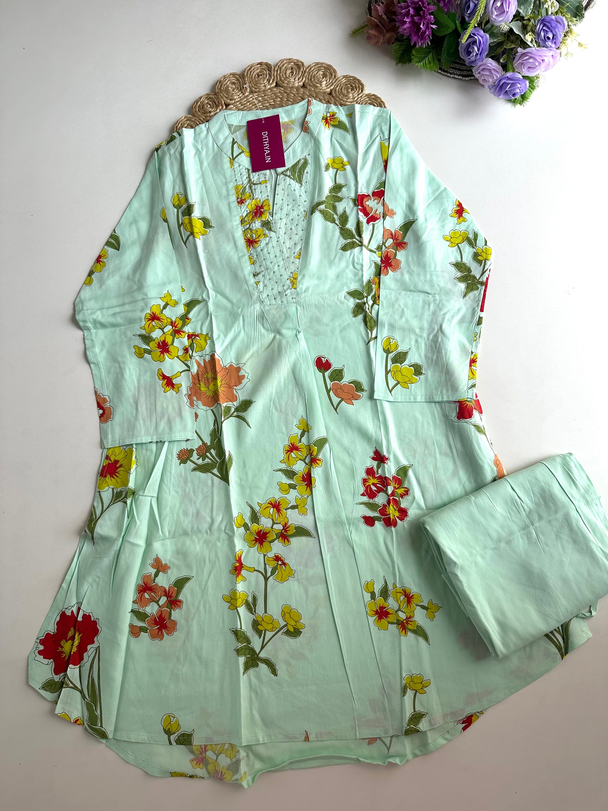 This cotton floral Aline Kurti with pants features a comfortable and breathable fabric, perfect for everyday wear. The Aline silhouette and floral design add a touch of elegance and style. Pair it with the included pants to create a complete and versatile outfit.