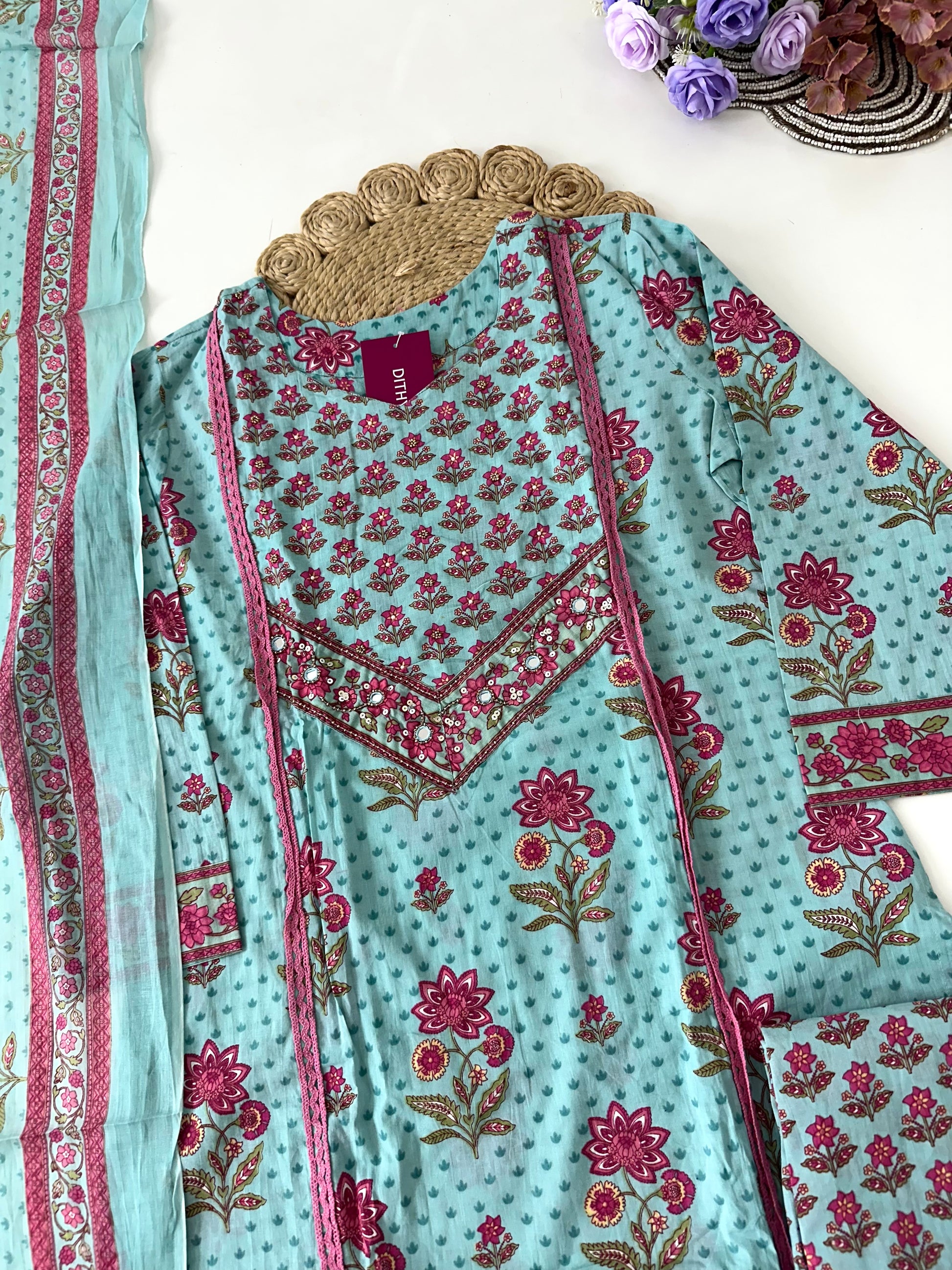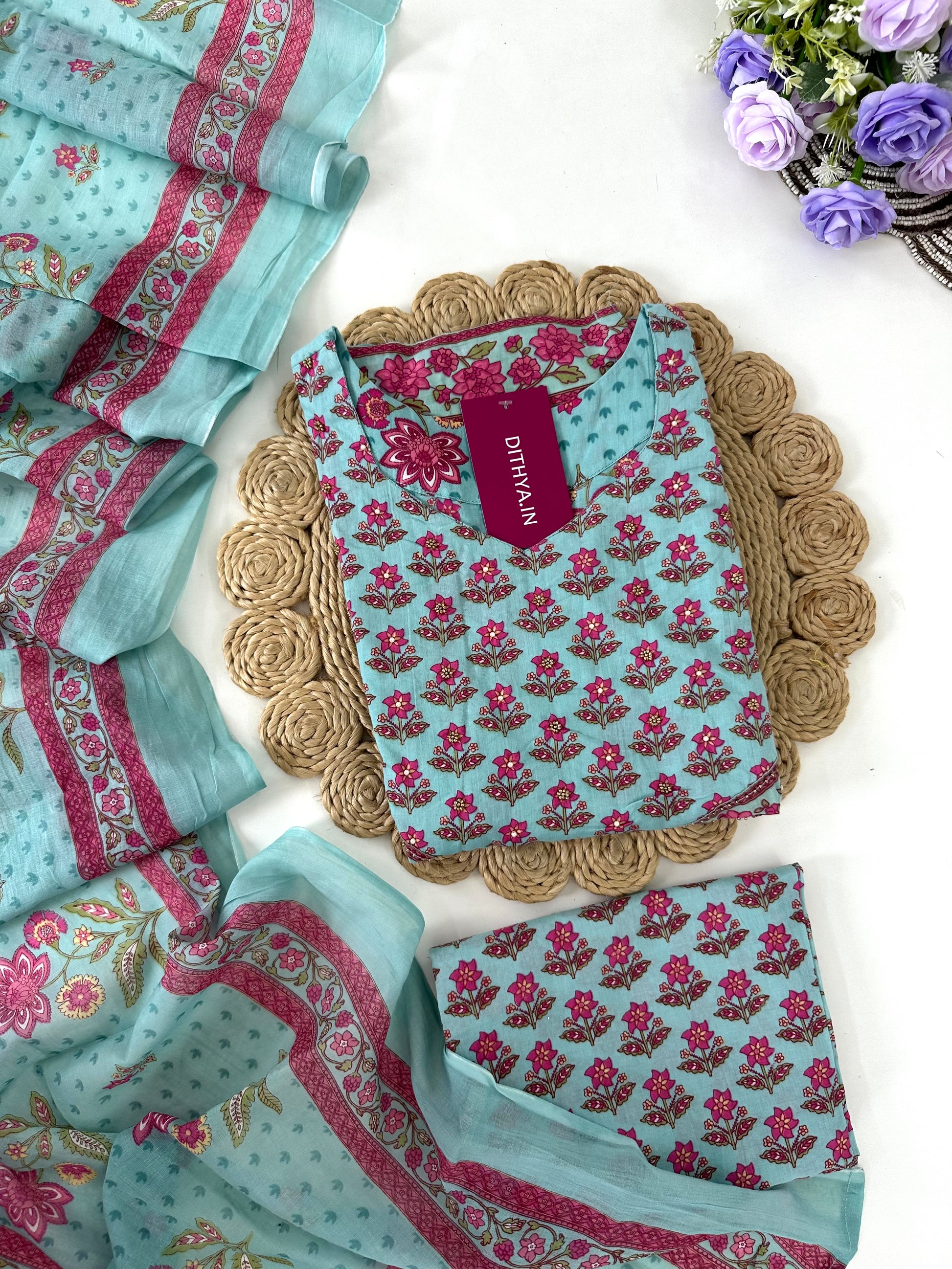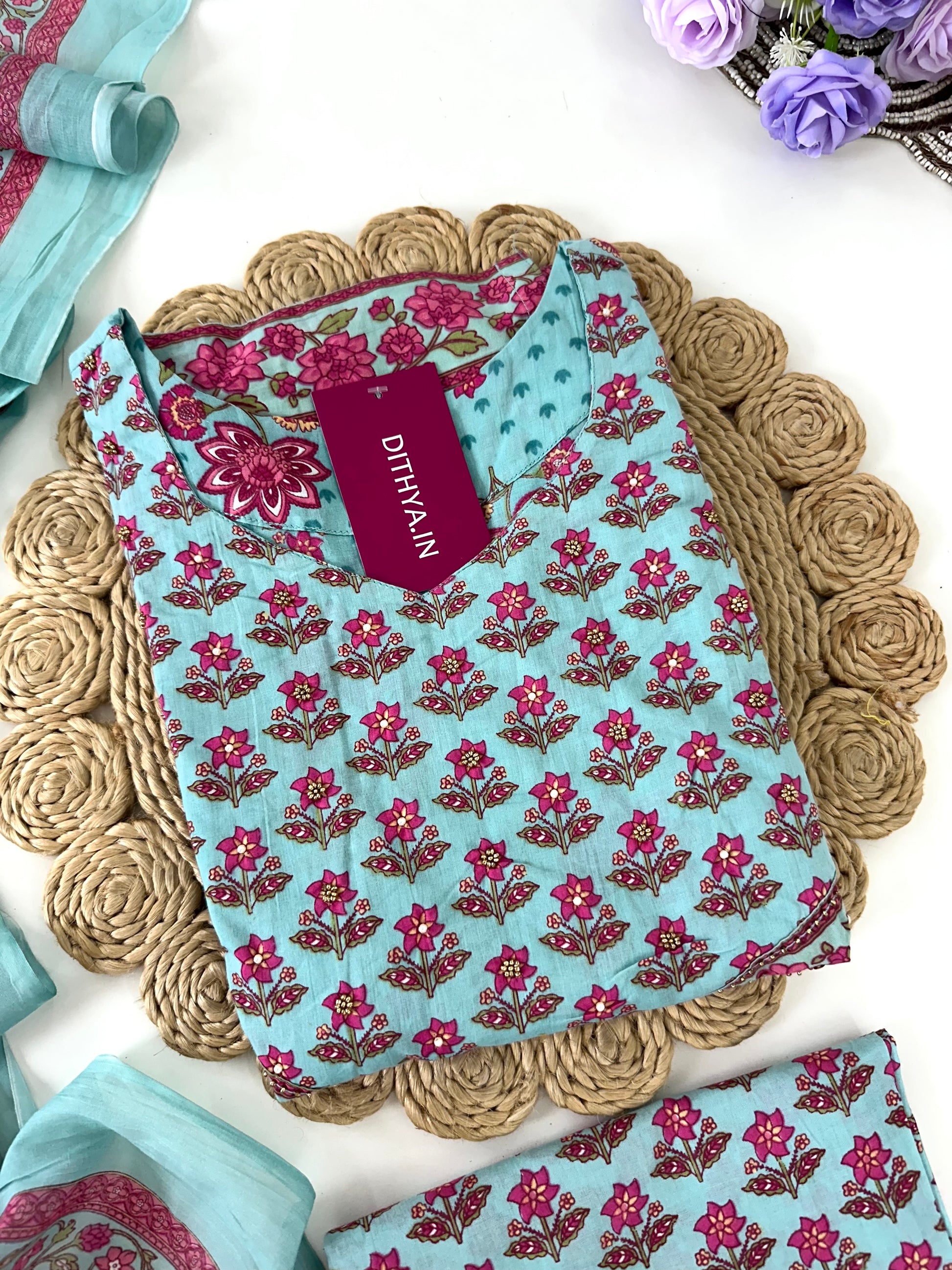 Enhance your ethnic wardrobe with our K348 - Cotton floral straight kurti with pants and dupatta. Made from high-quality cotton, this kurti features a beautiful floral design, and comes with matching pants and dupatta for a complete look. Perfect for any occasion, this ensemble combines comfort and style for a timeless ensemble.