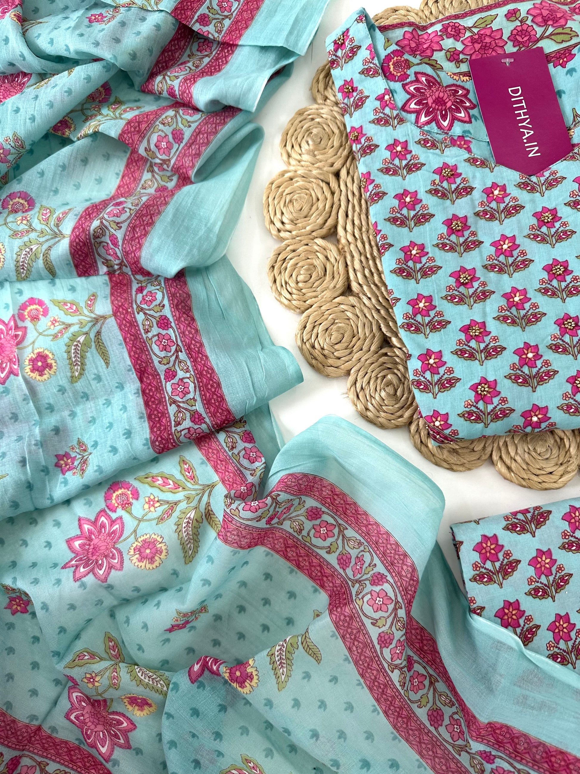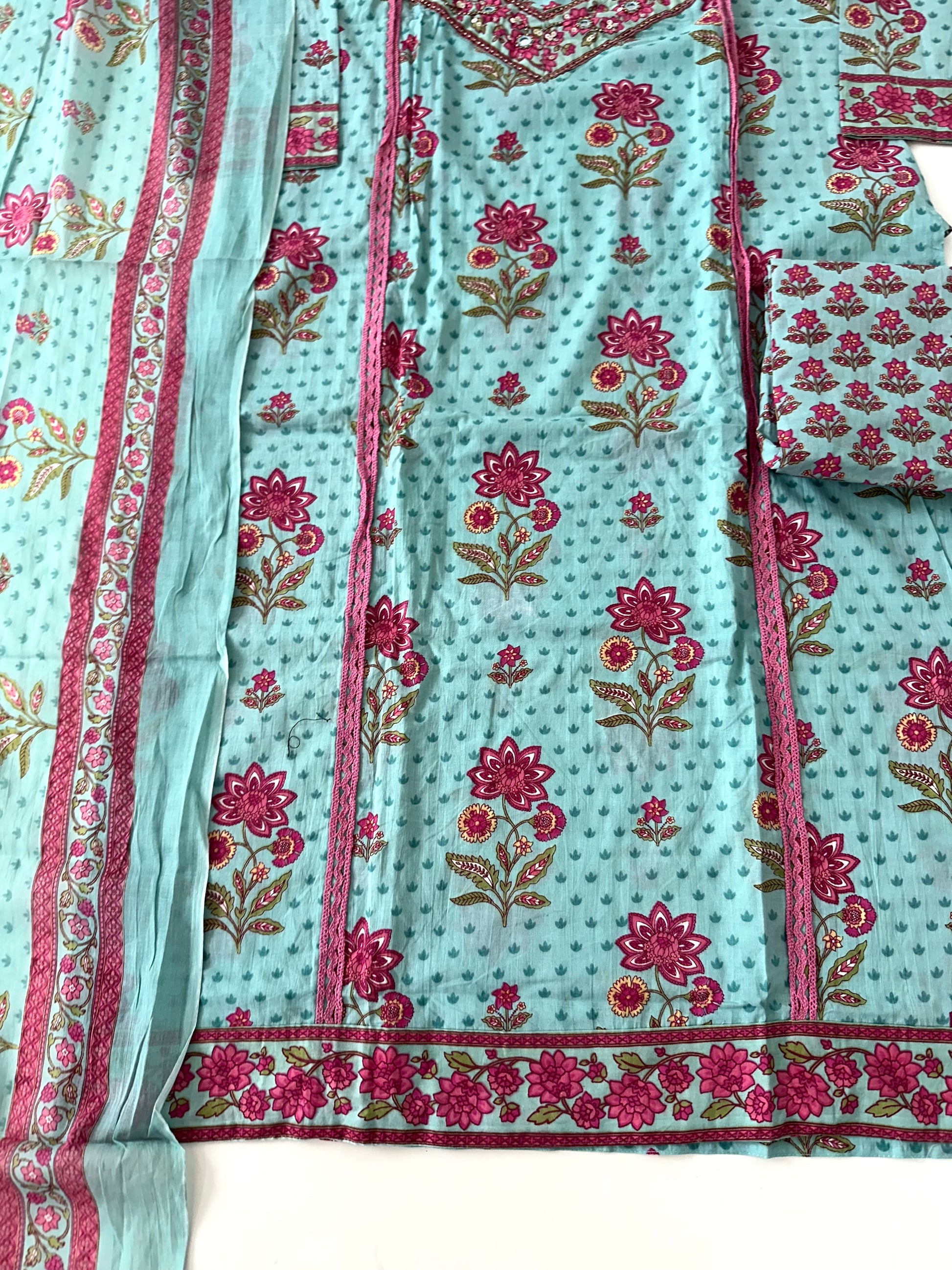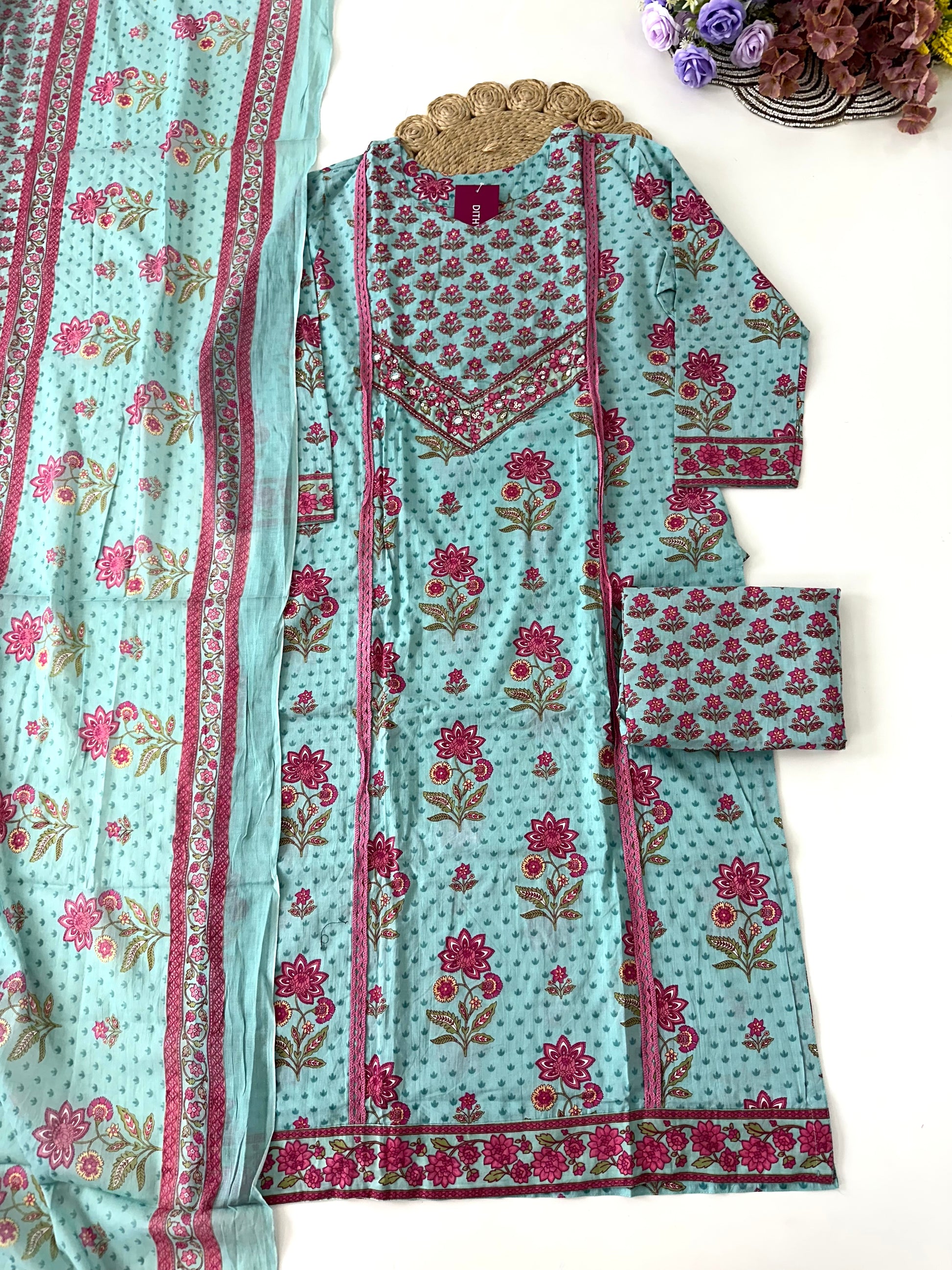 Enhance your ethnic wardrobe with our K348 - Cotton floral straight kurti with pants and dupatta. Made from high-quality cotton, this kurti features a beautiful floral design, and comes with matching pants and dupatta for a complete look. Perfect for any occasion, this ensemble combines comfort and style for a timeless ensemble.