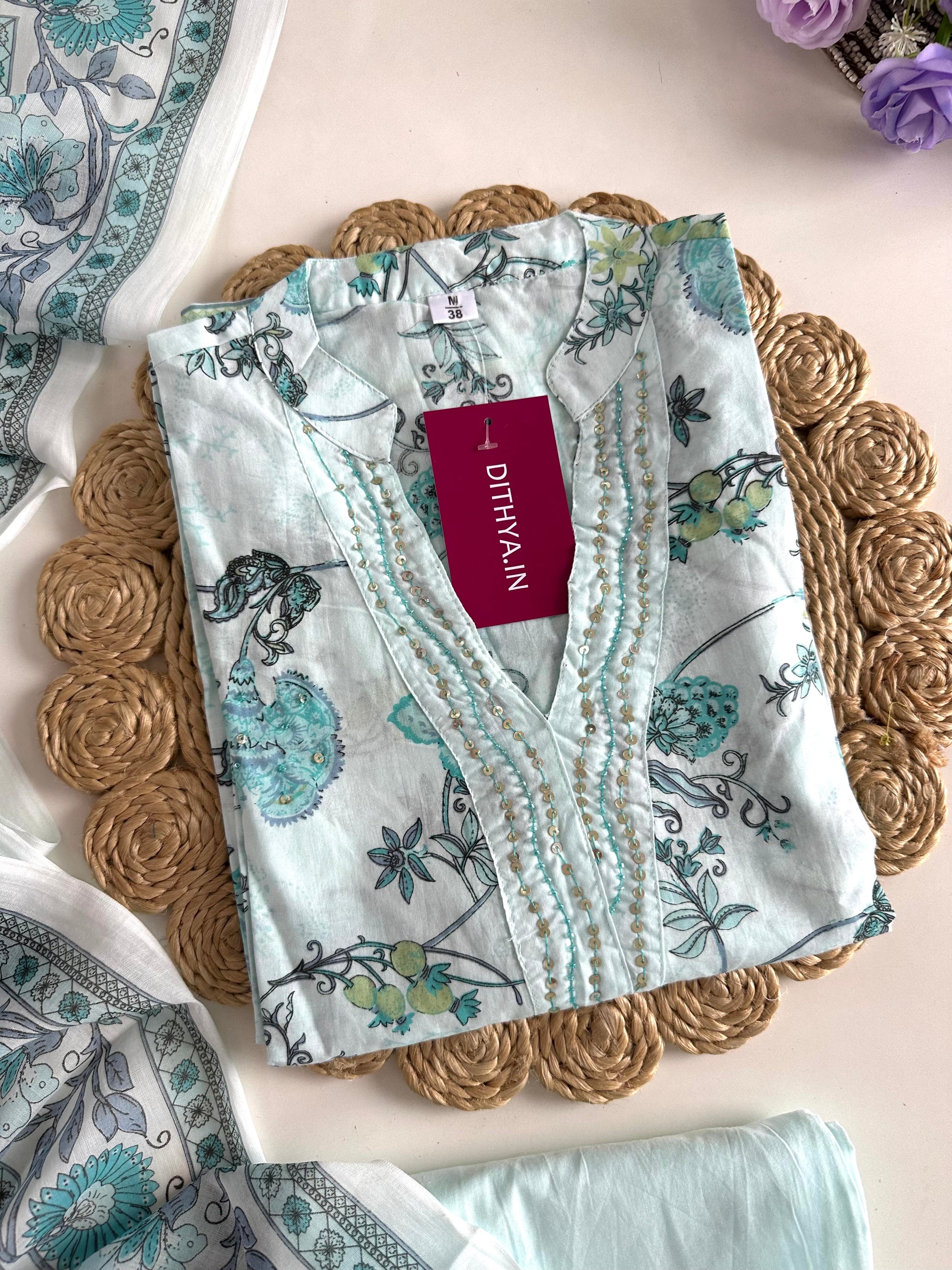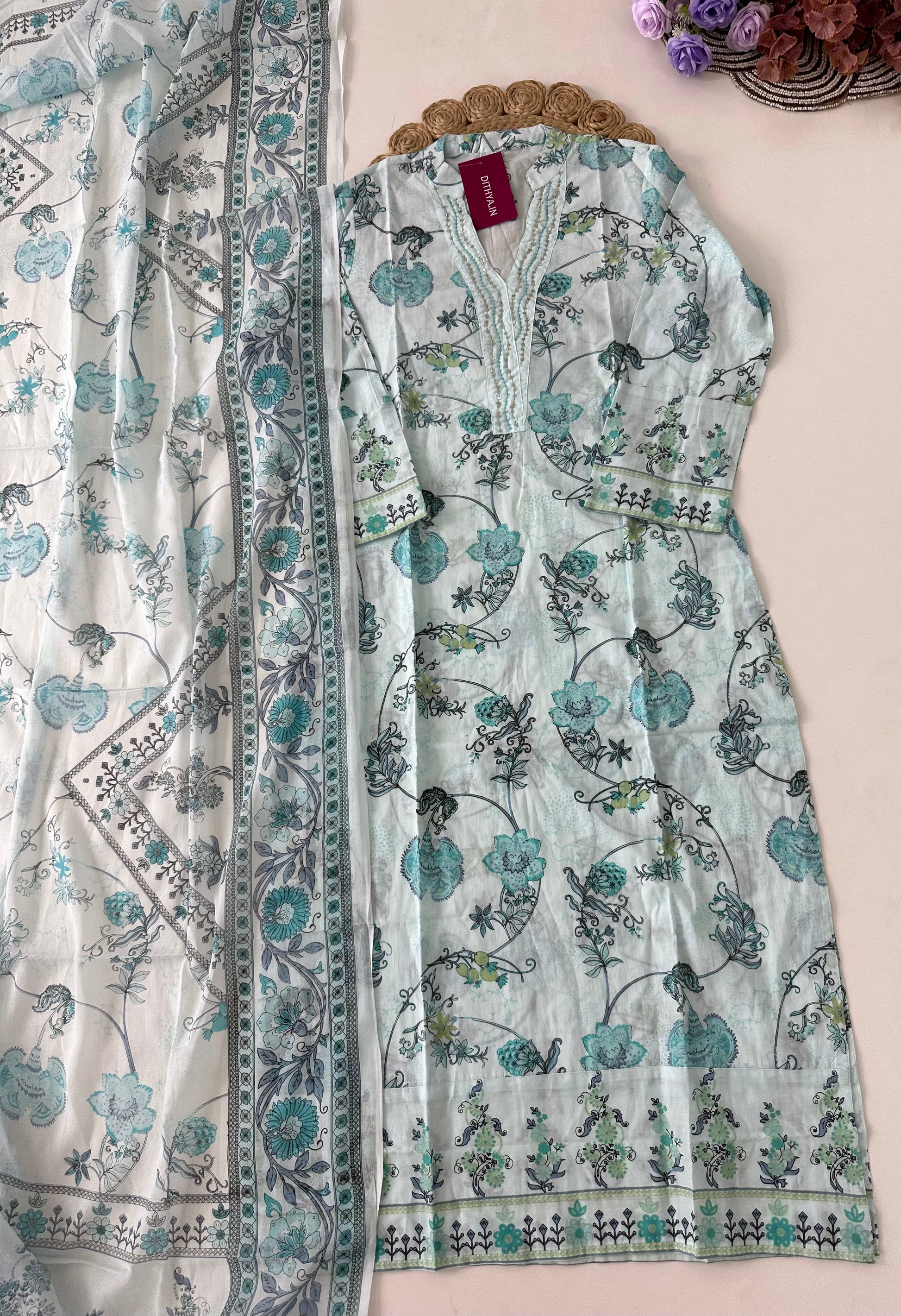 Step up your traditional wear game with the Cotton Floral Straight Kurti. Made with soft and breathable cotton fabric, this kurti features a beautiful floral print and a straight cut design. Accompanied by comfortable pants and a matching dupatta, this set offers both style and comfort. Elevate your ethnic look with this must-have outfit.