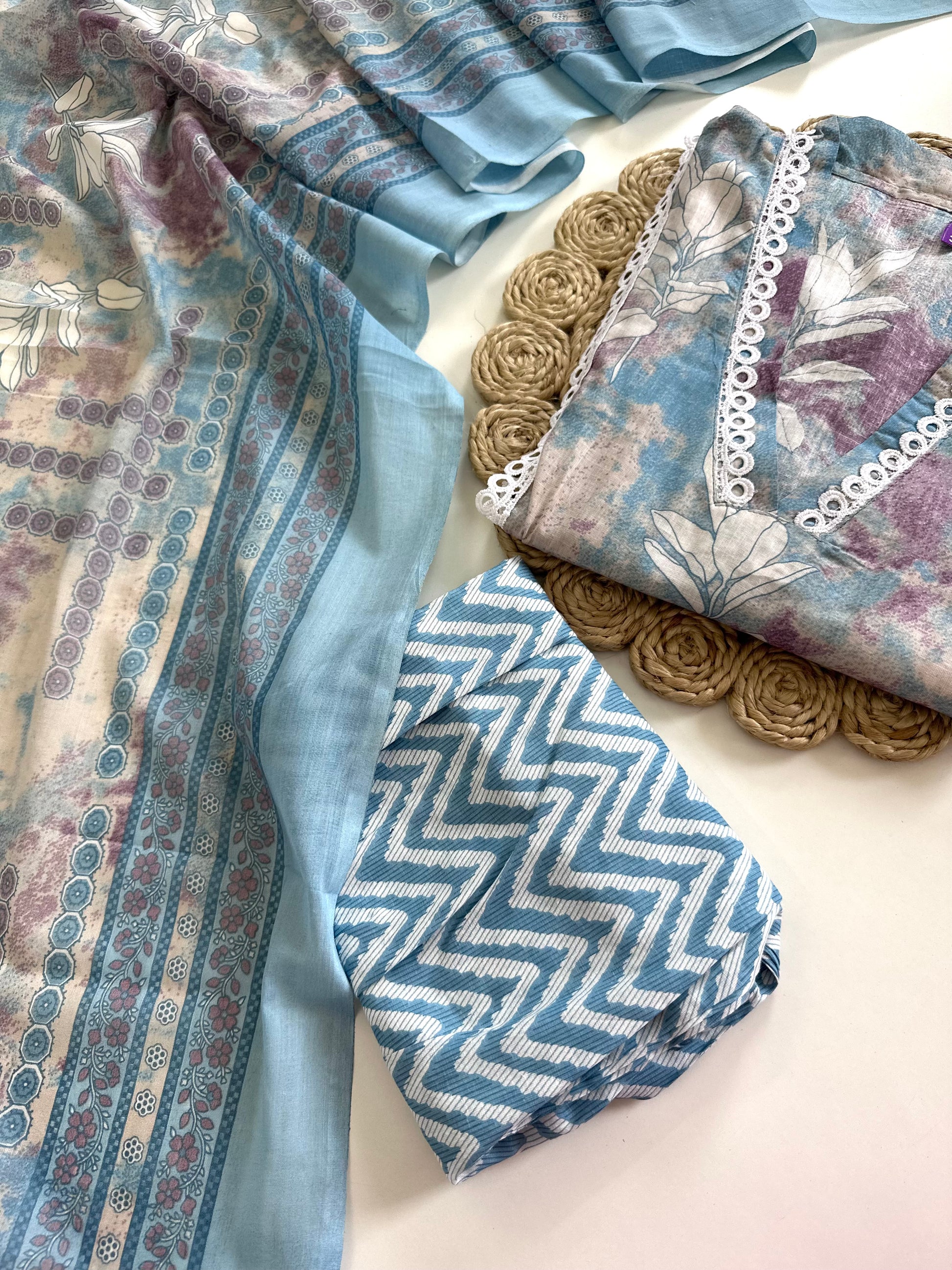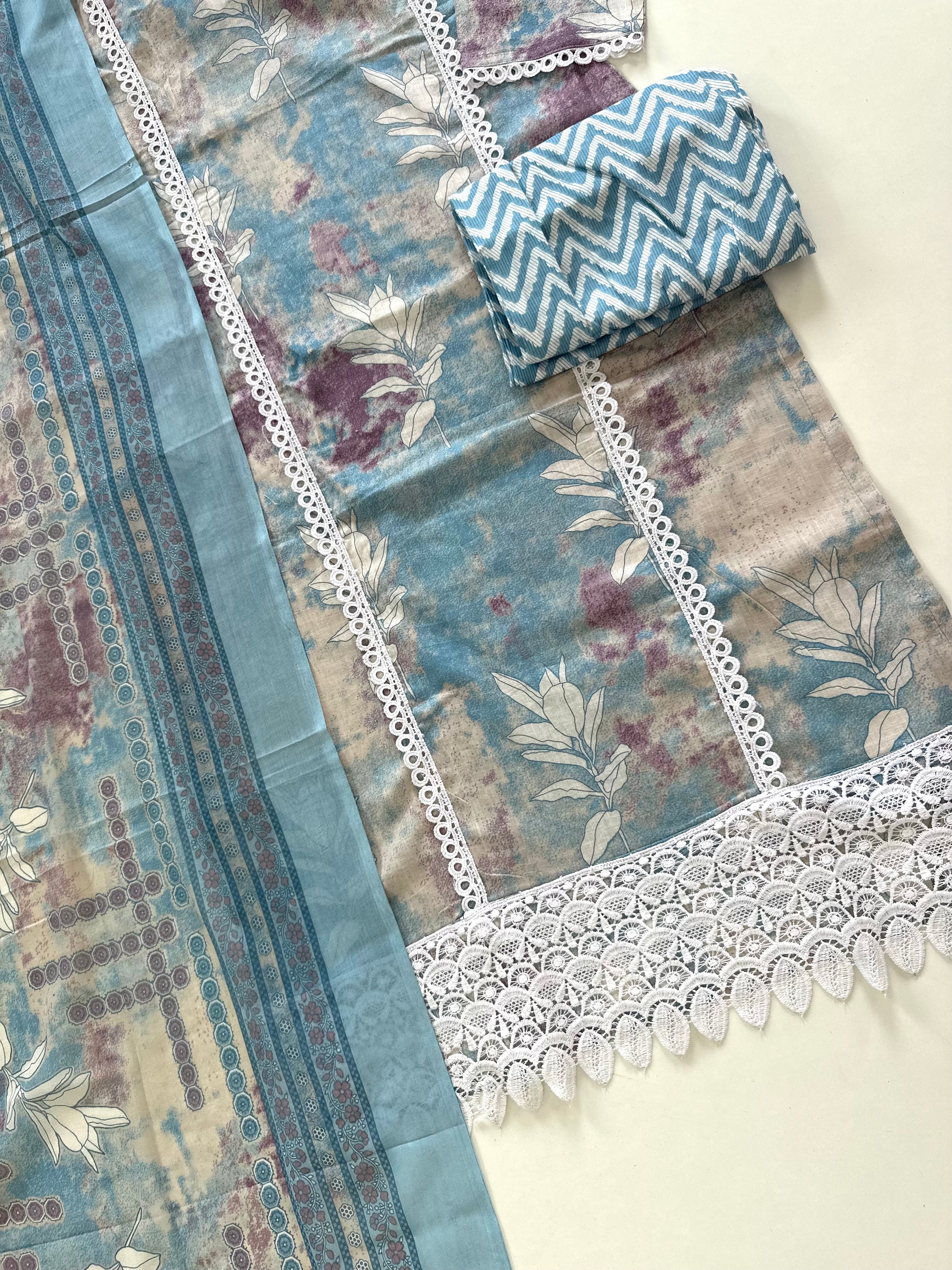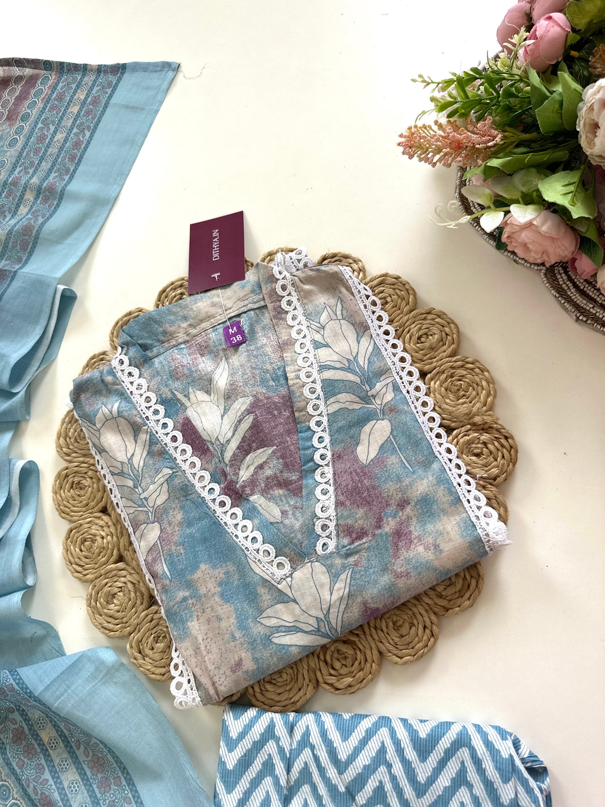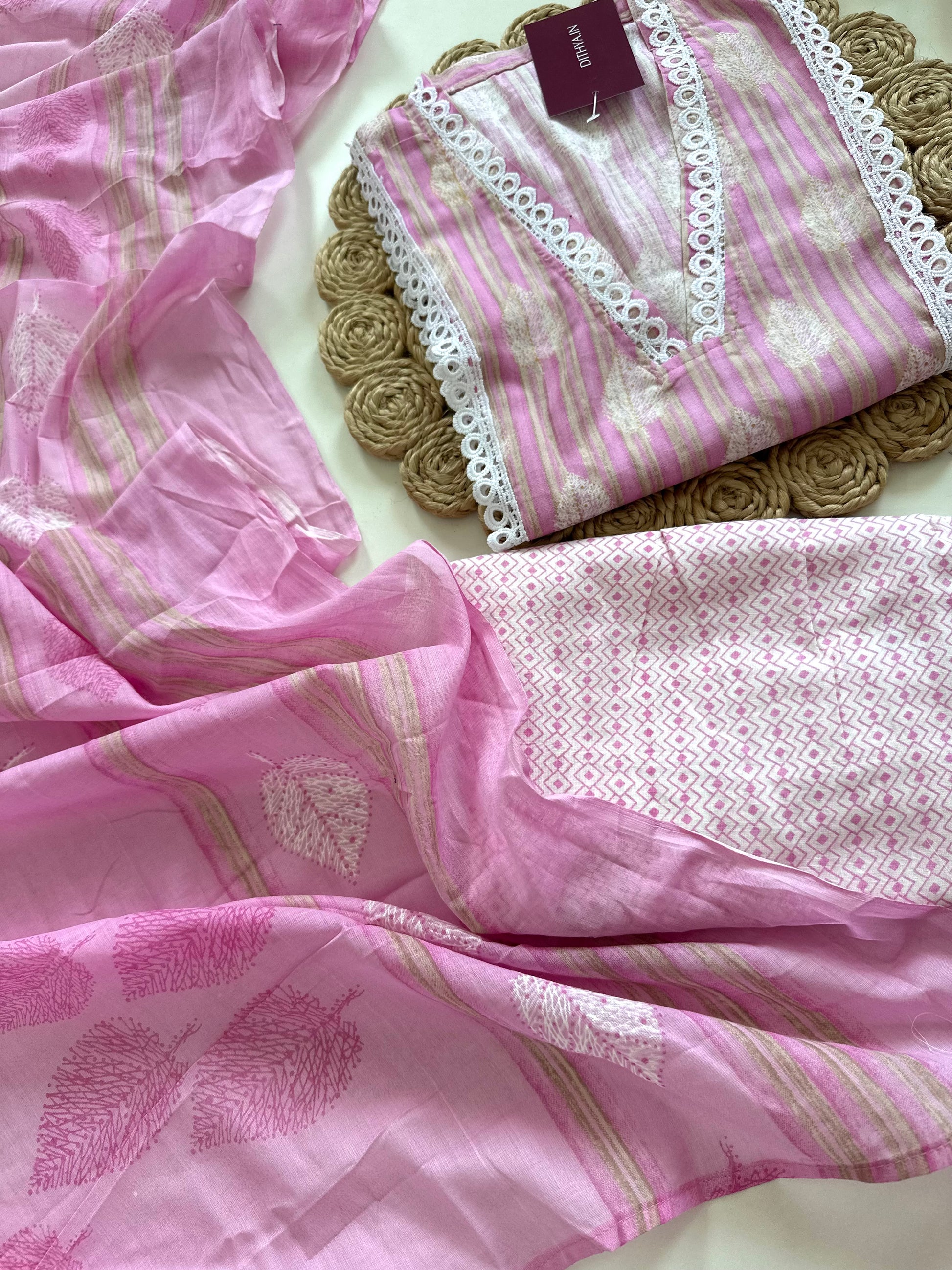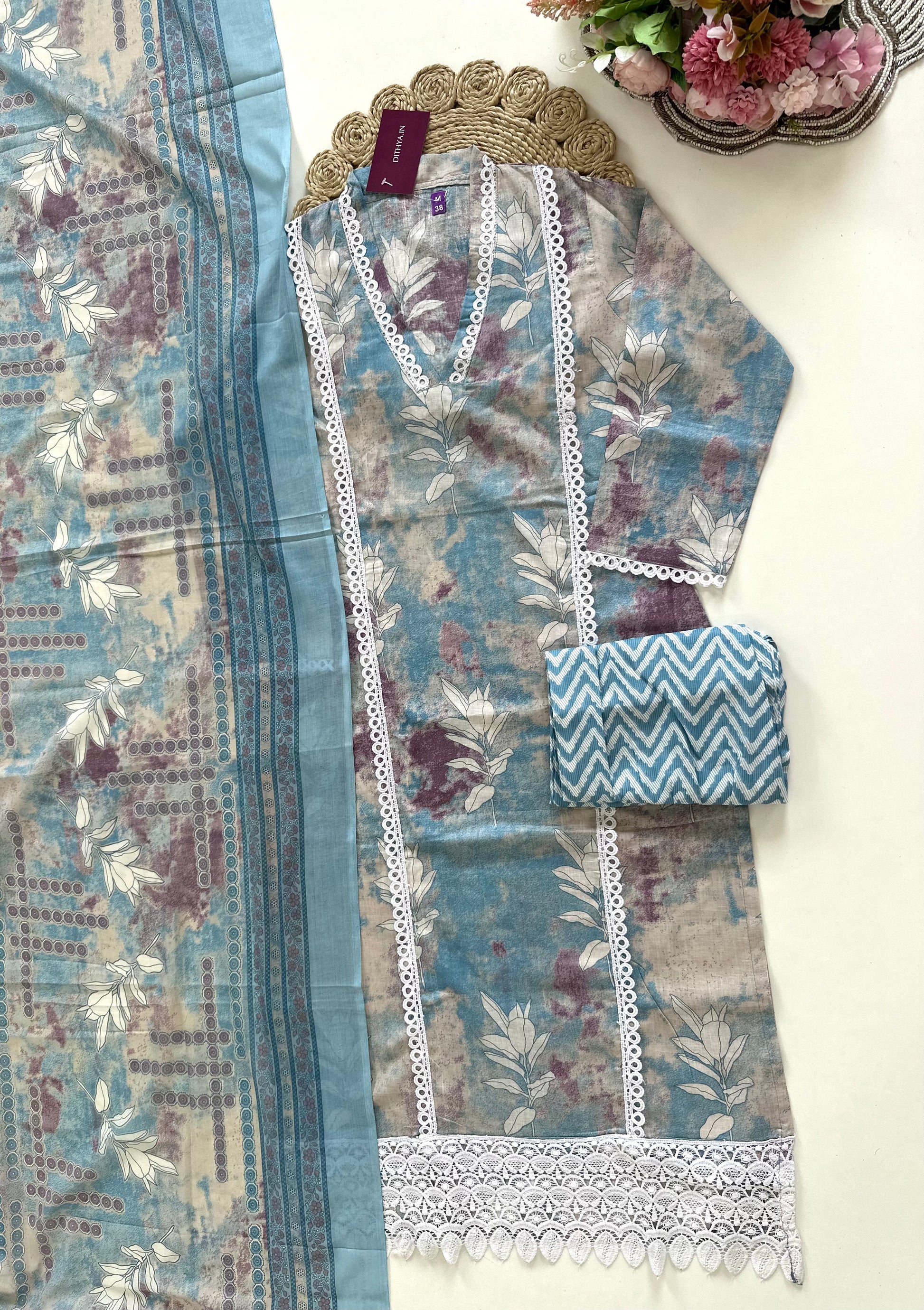 K096 - Cotton Lace work straight kurti with pants and dupatta in 2 colours