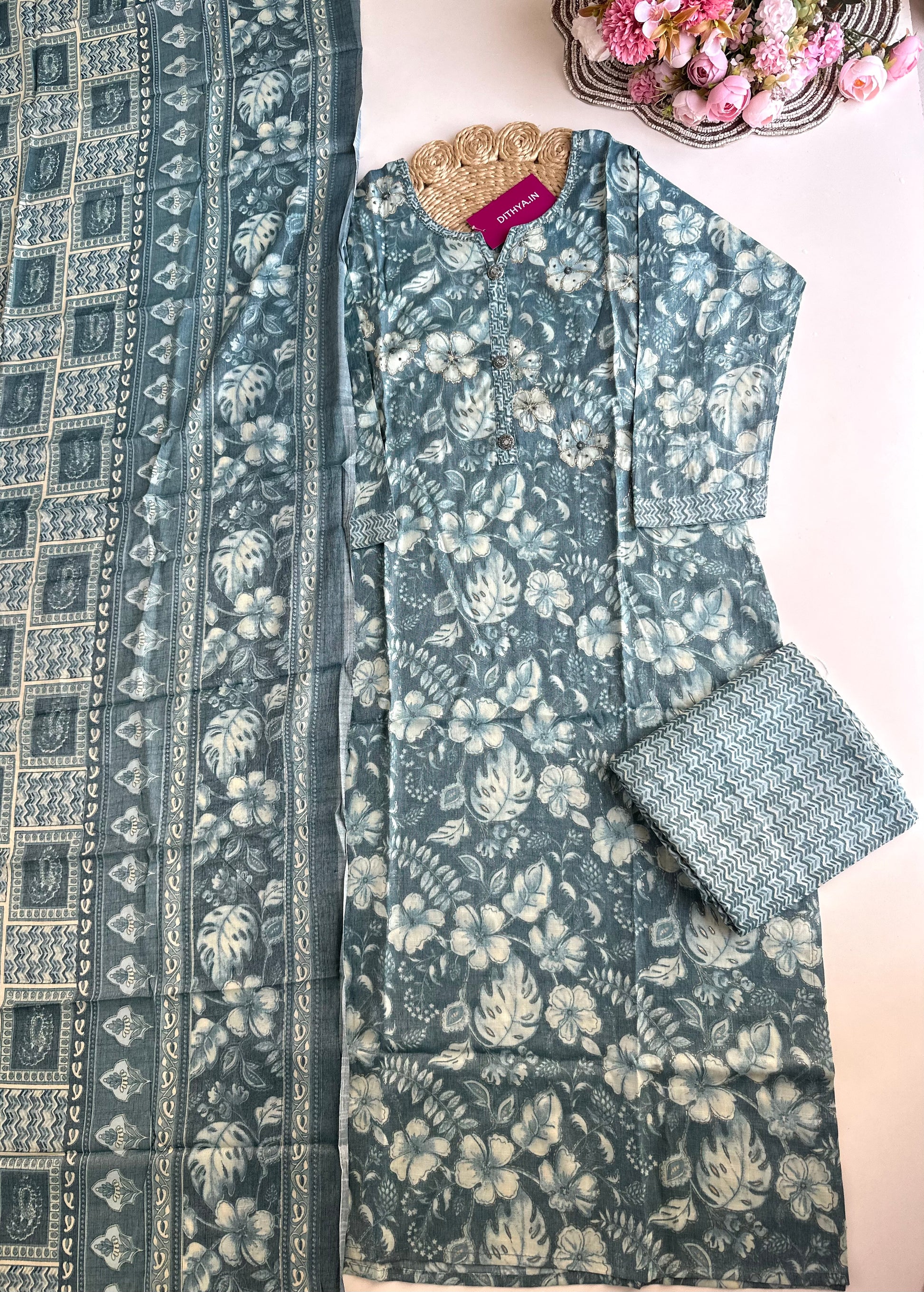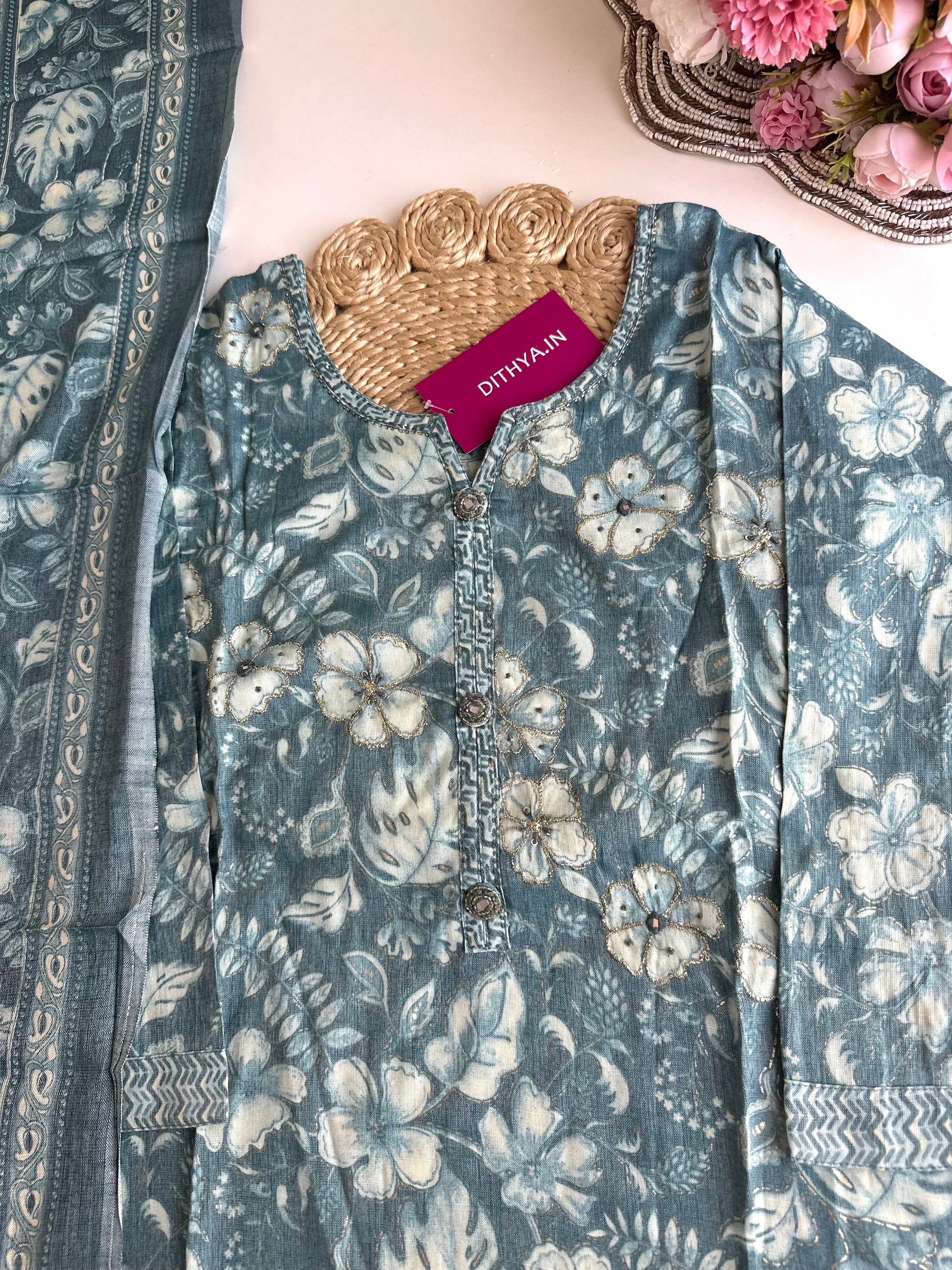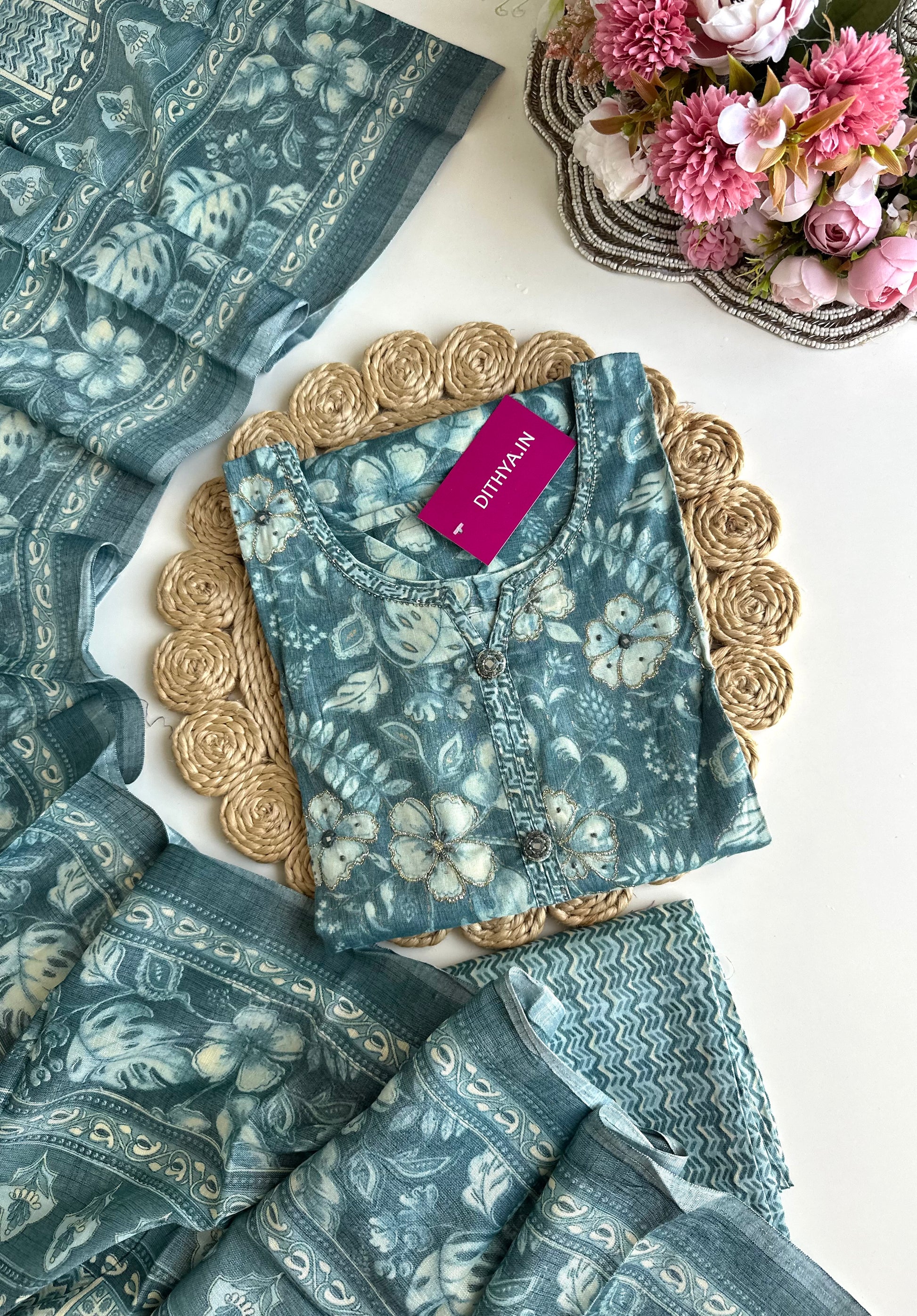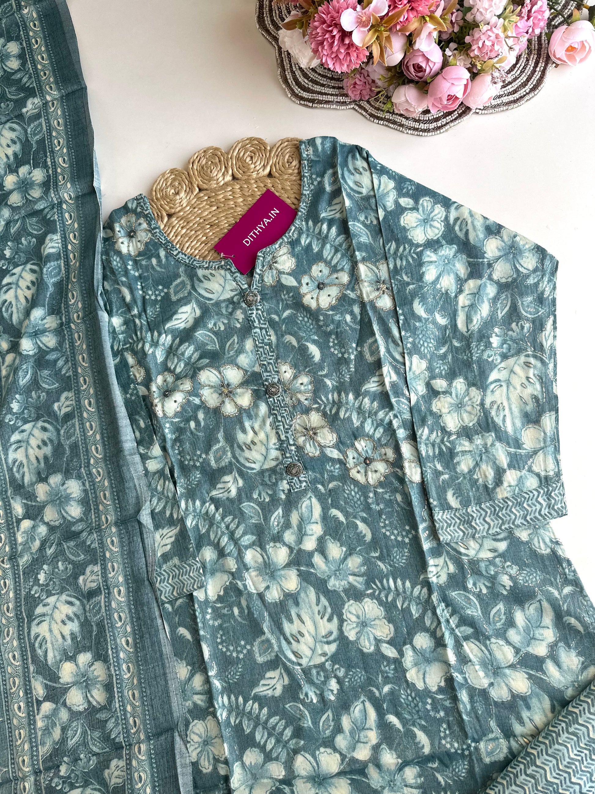 Crafted with high-quality cotton muslin, this floral straight Kurti comes complete with matching pants and dupatta. Its breathable fabric and elegant design make it perfect for any occasion. Elevate your ethnic wardrobe with this stylish and versatile ensemble.