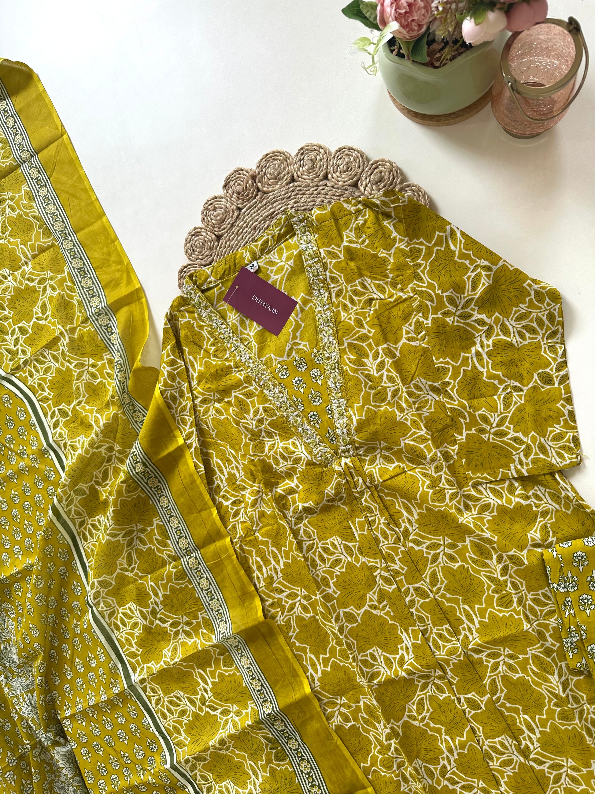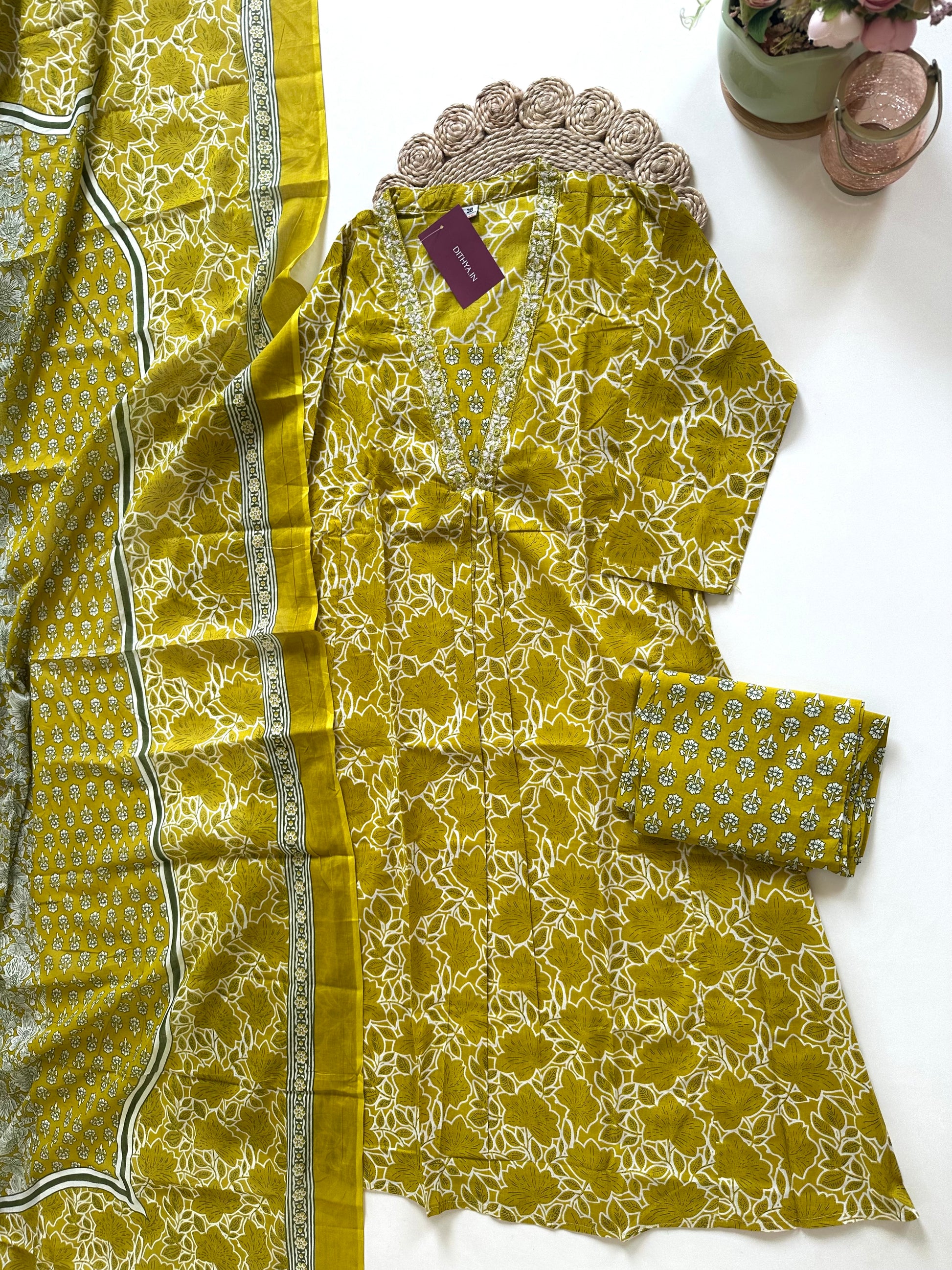 K157 - Cotton printed Aline Kurti with pants and dupatta in 2 colours .