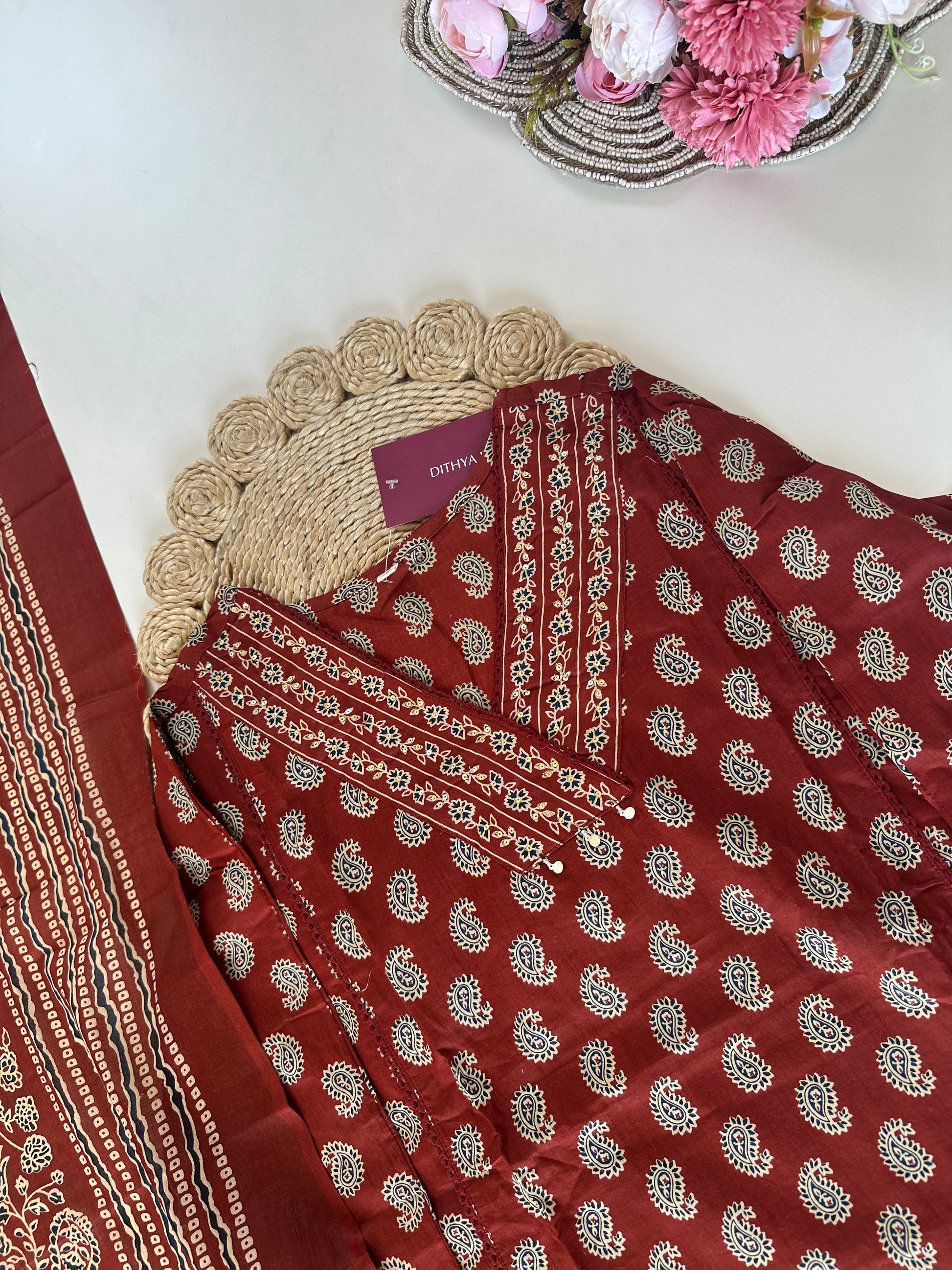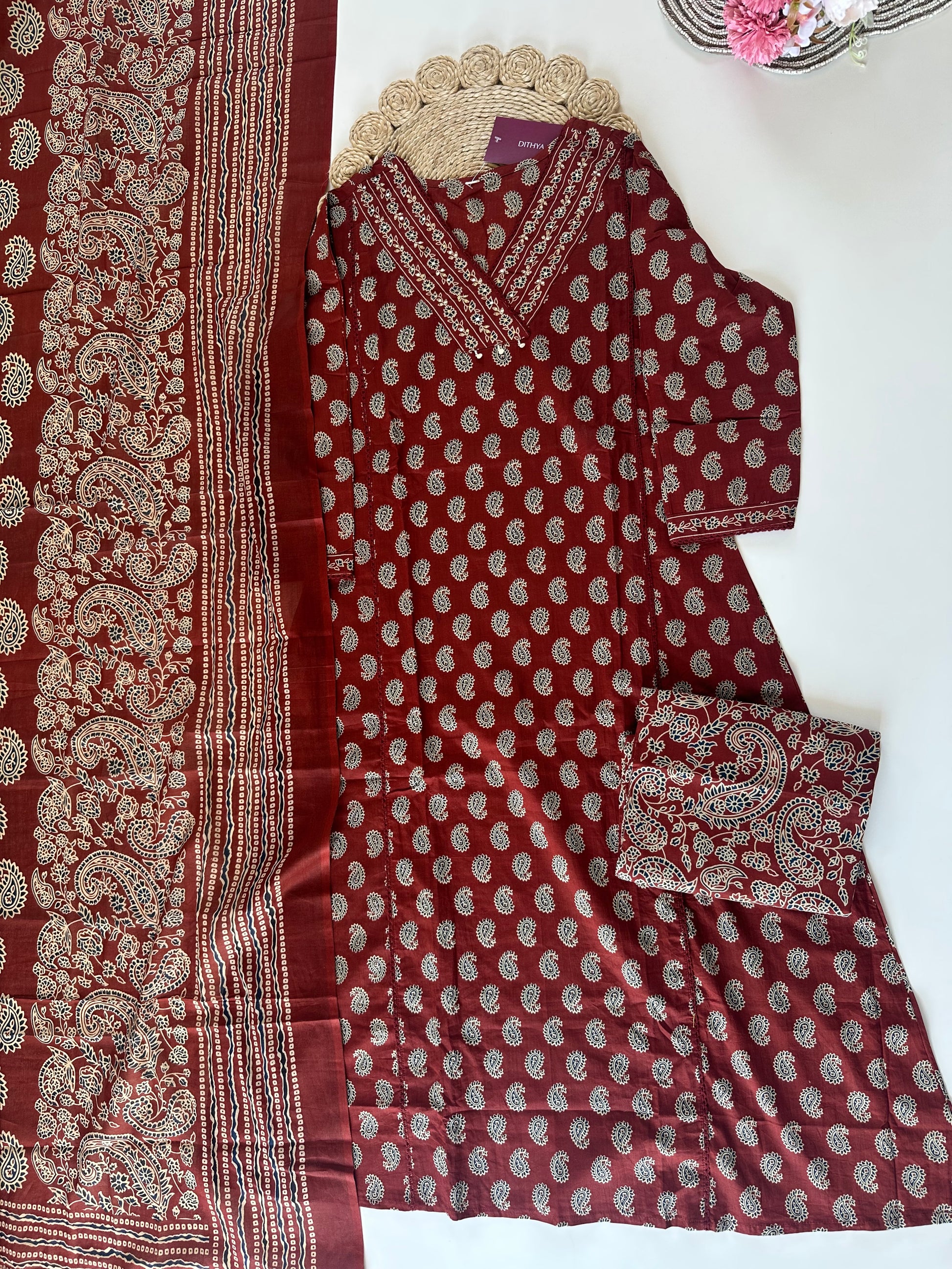 Expertly crafted from soft and breathable cotton, this printed straight kurti comes with a matching palazzo and dupatta. Enjoy a comfortable fit and effortless style with this versatile outfit. Perfect for any occasion, this set combines fashion and comfort in one elegant package.