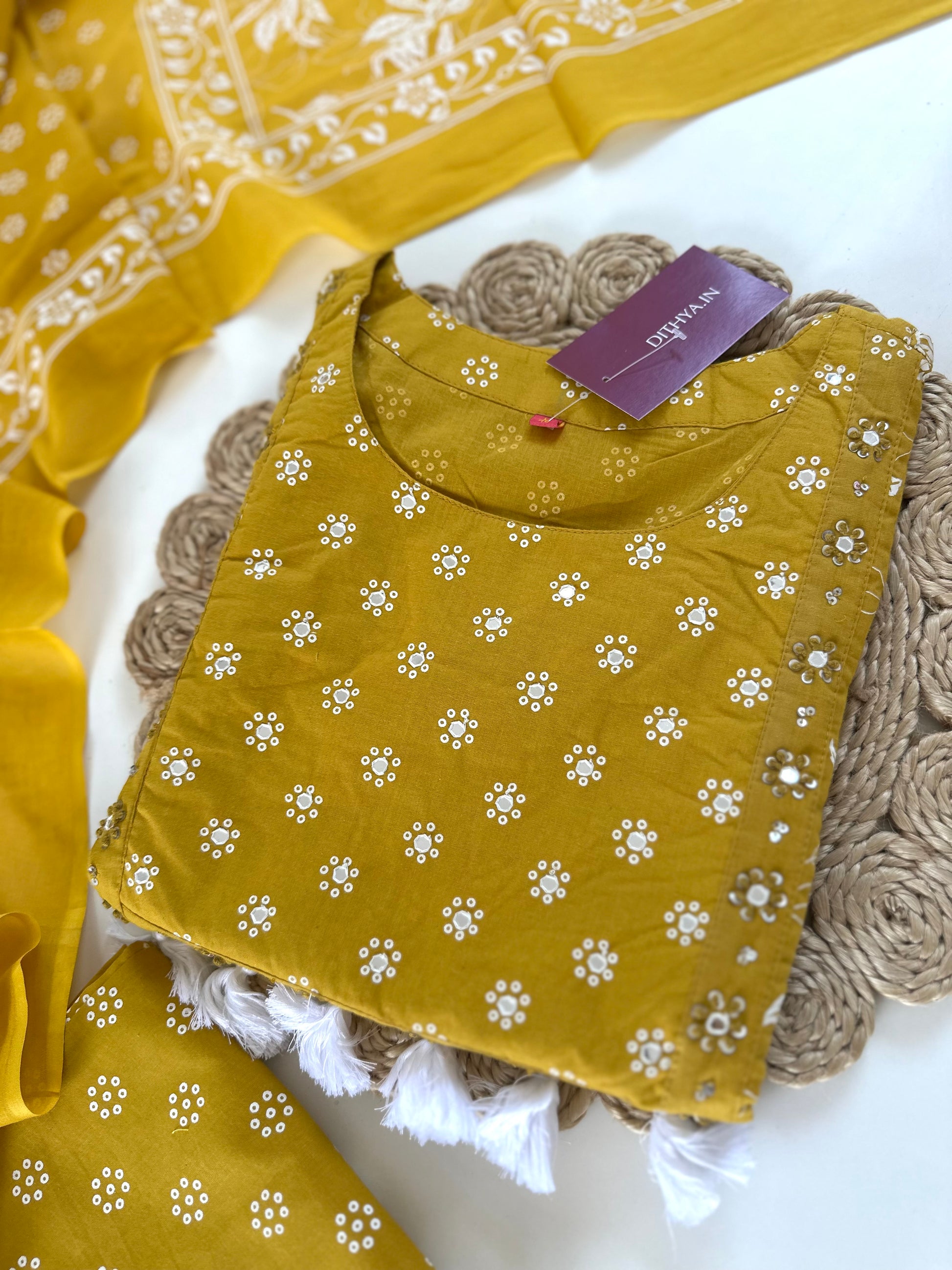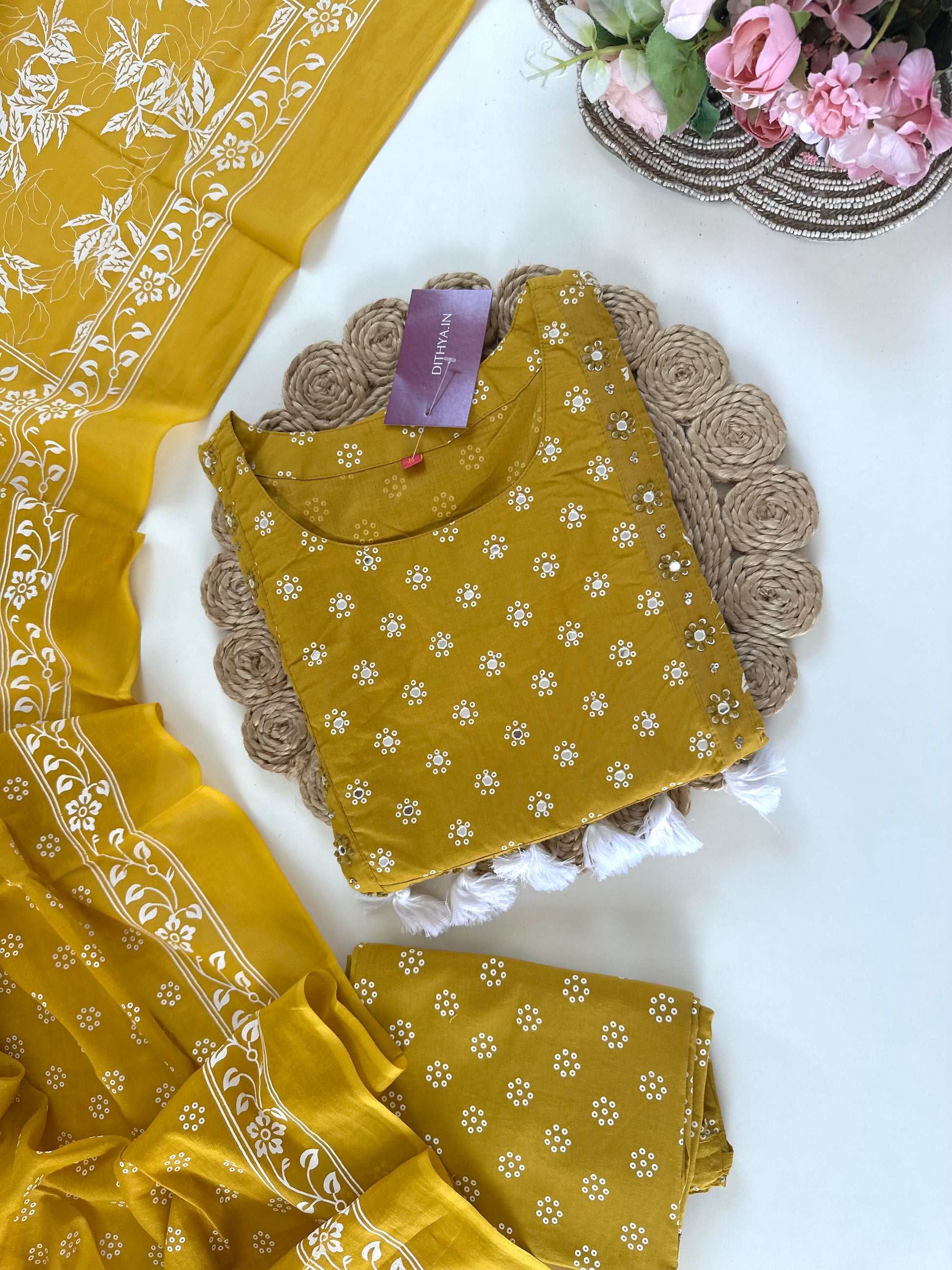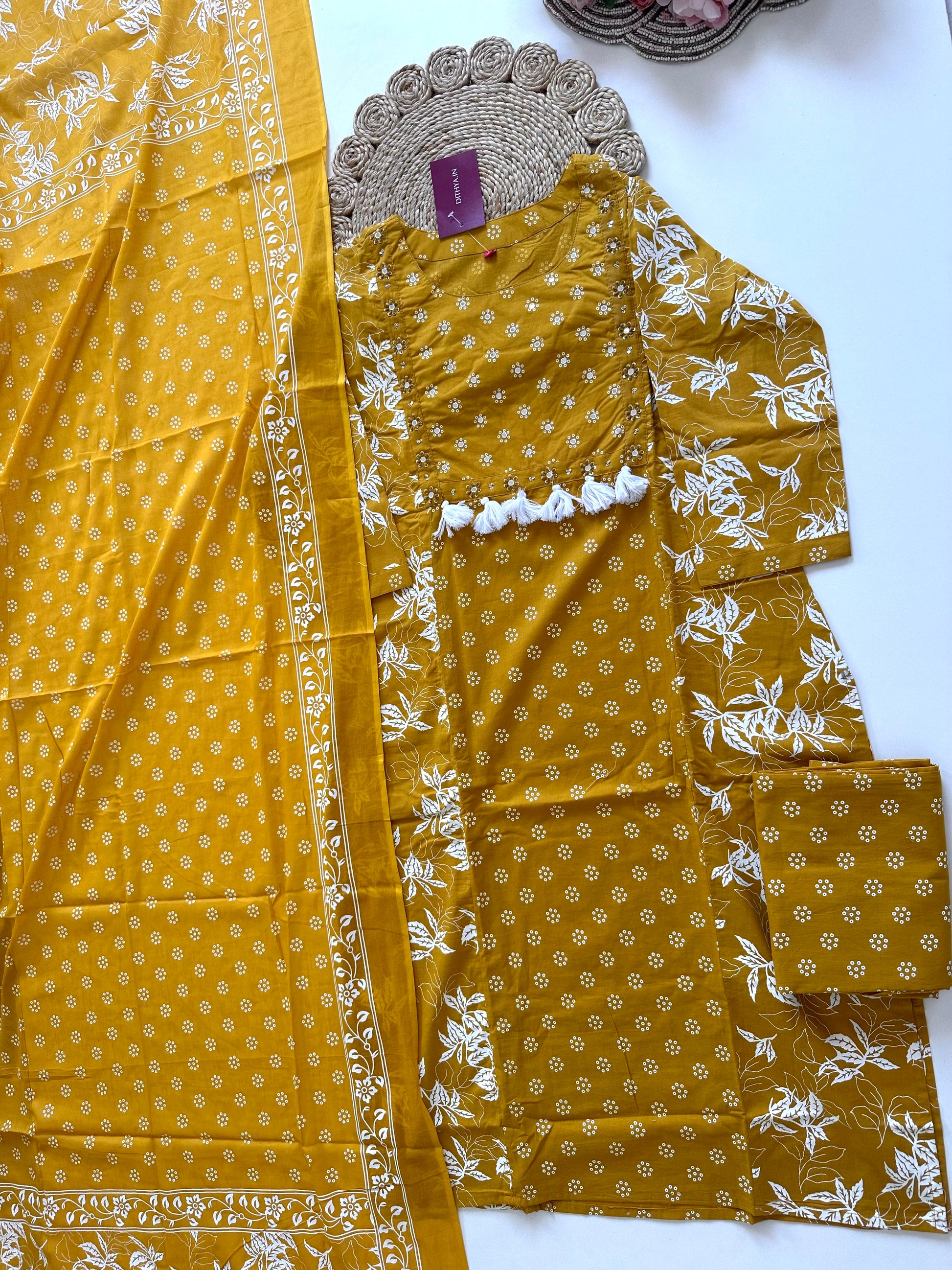 This Cotton printed kurti set includes pants and dupatta for a complete and stylish look. Made from high-quality cotton, this straight kurti offers both comfort and elegance. Add this versatile set to your wardrobe for a fashionable and effortless ensemble.