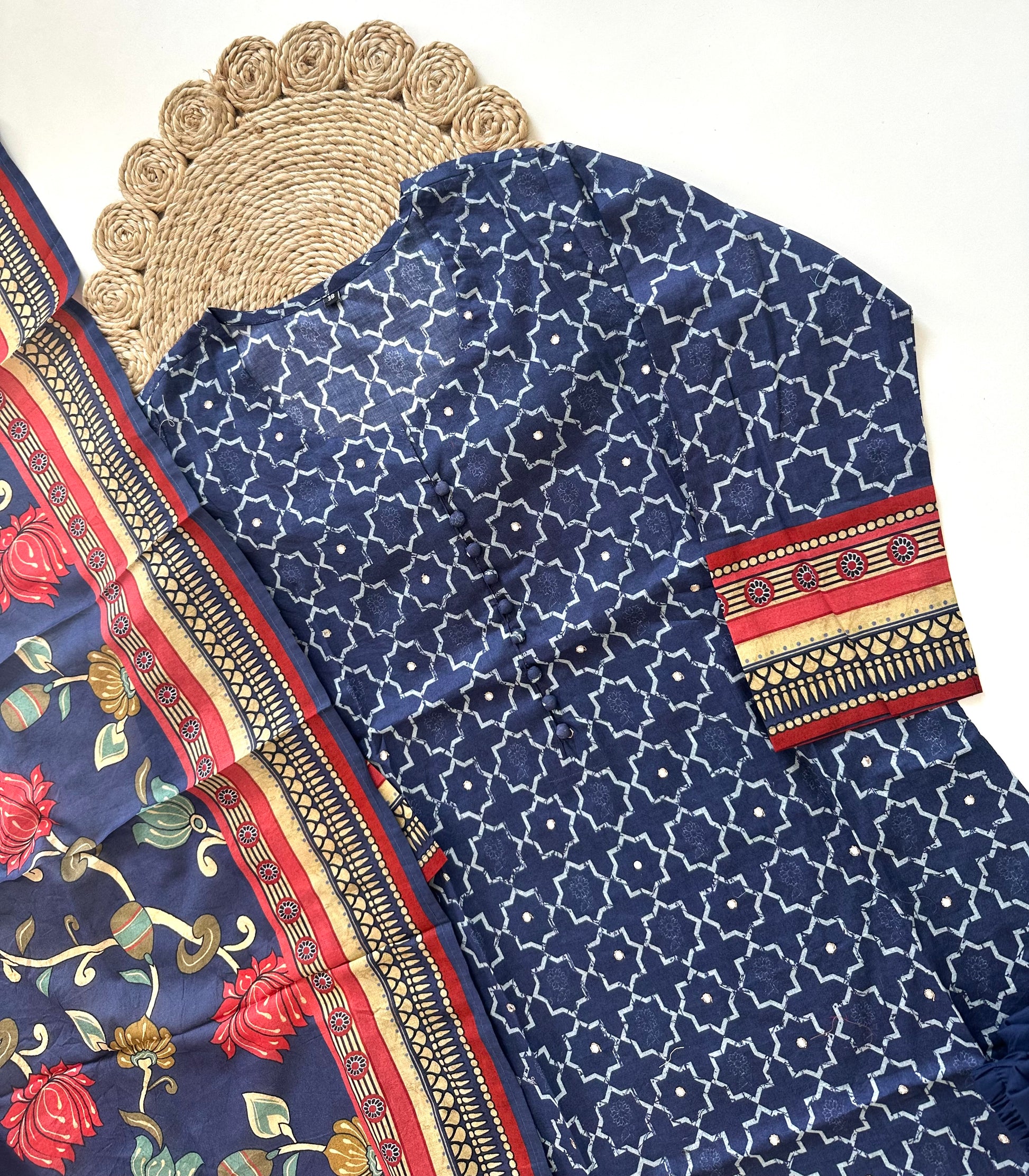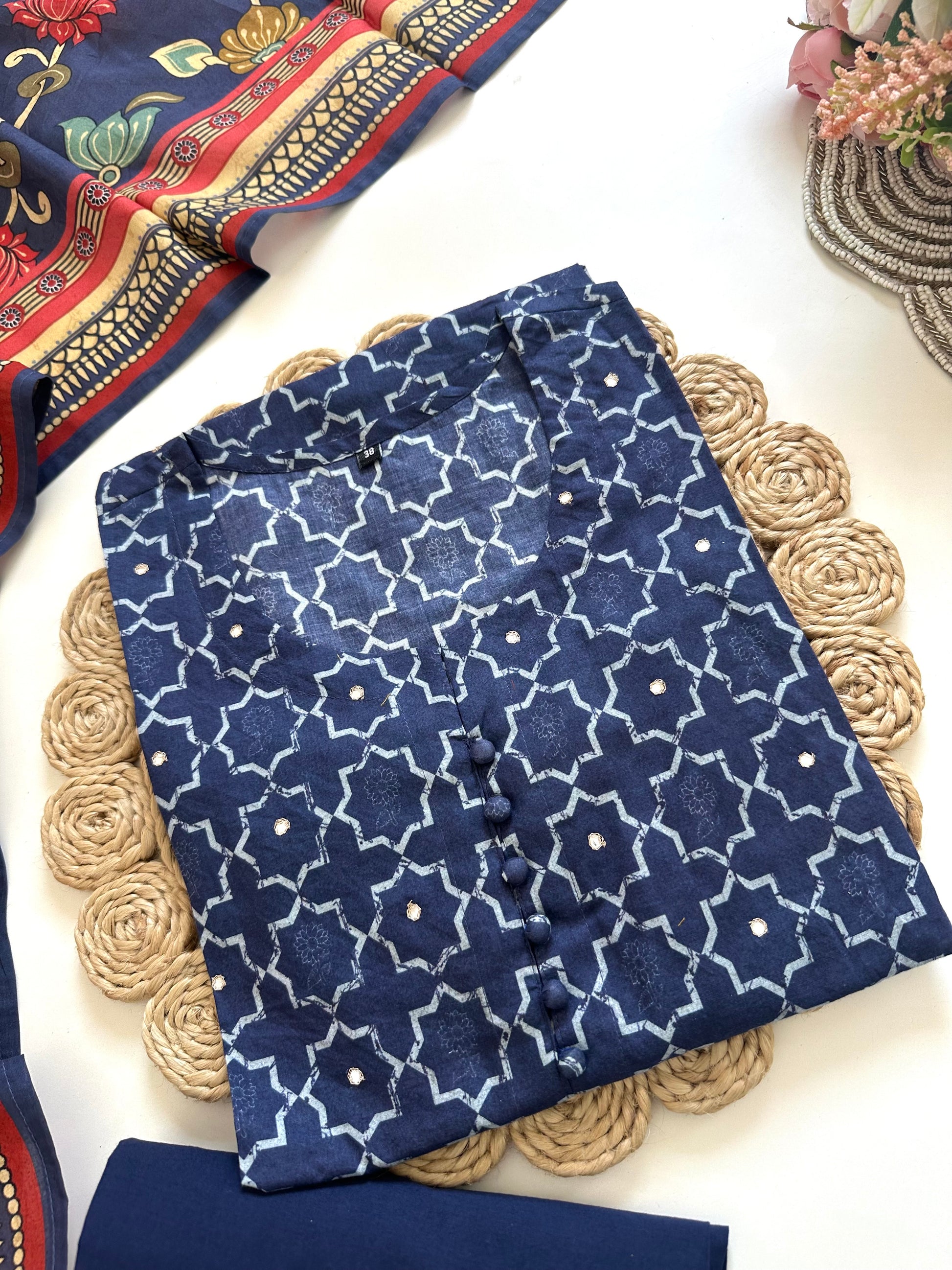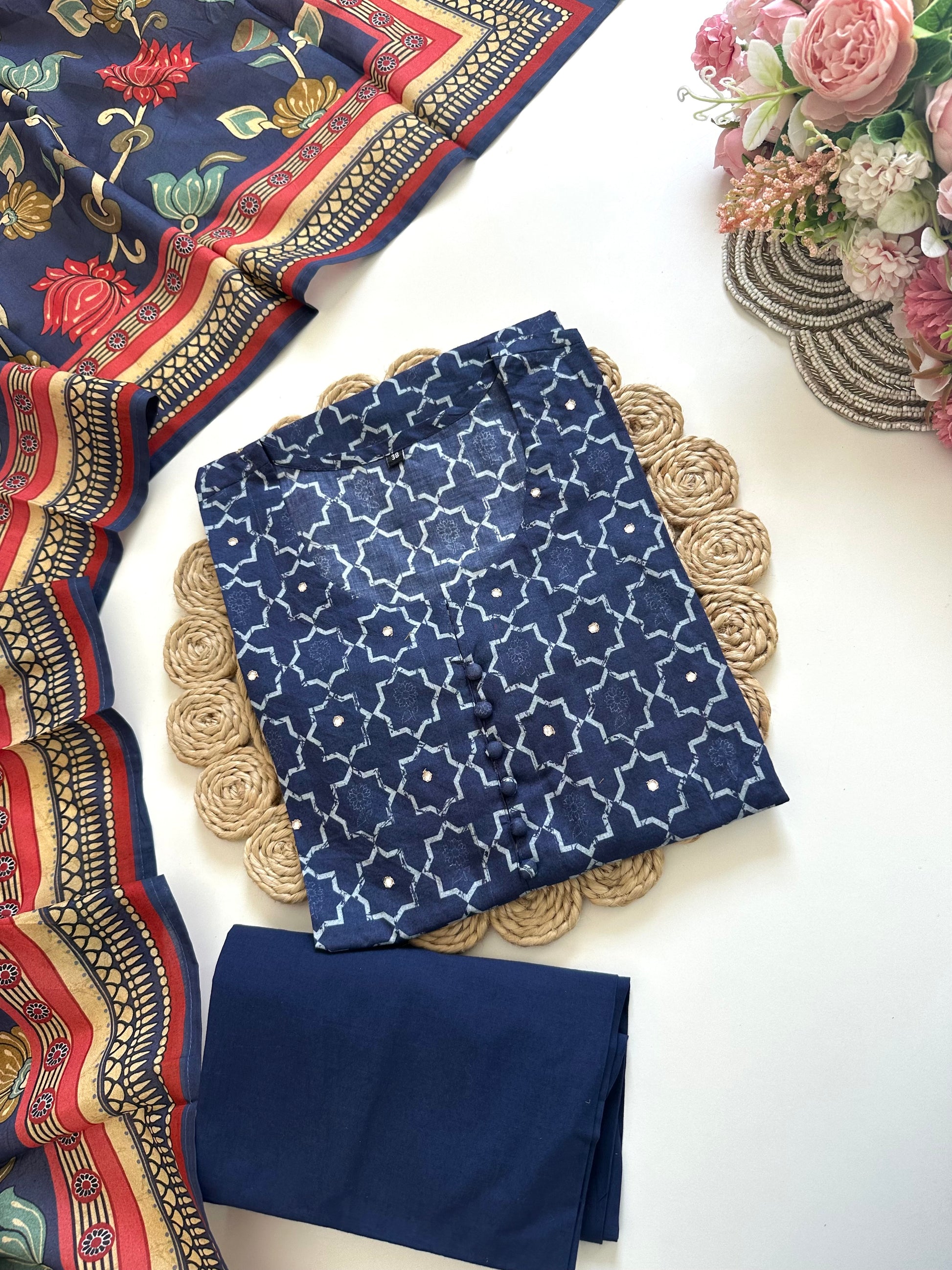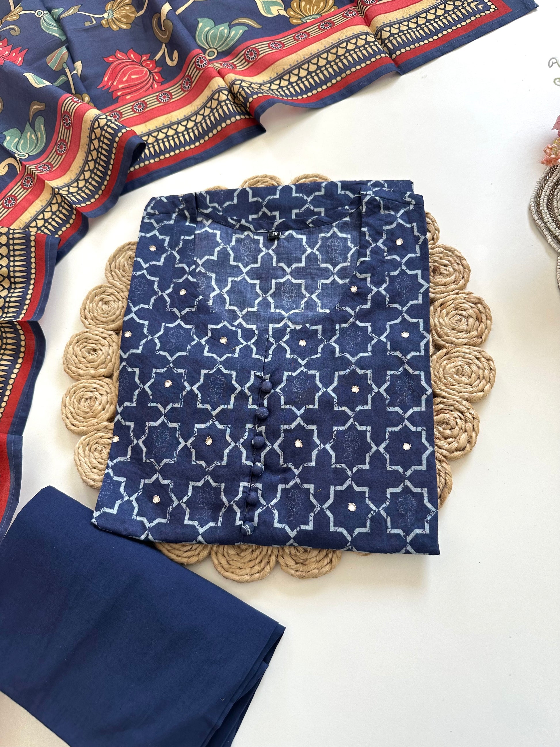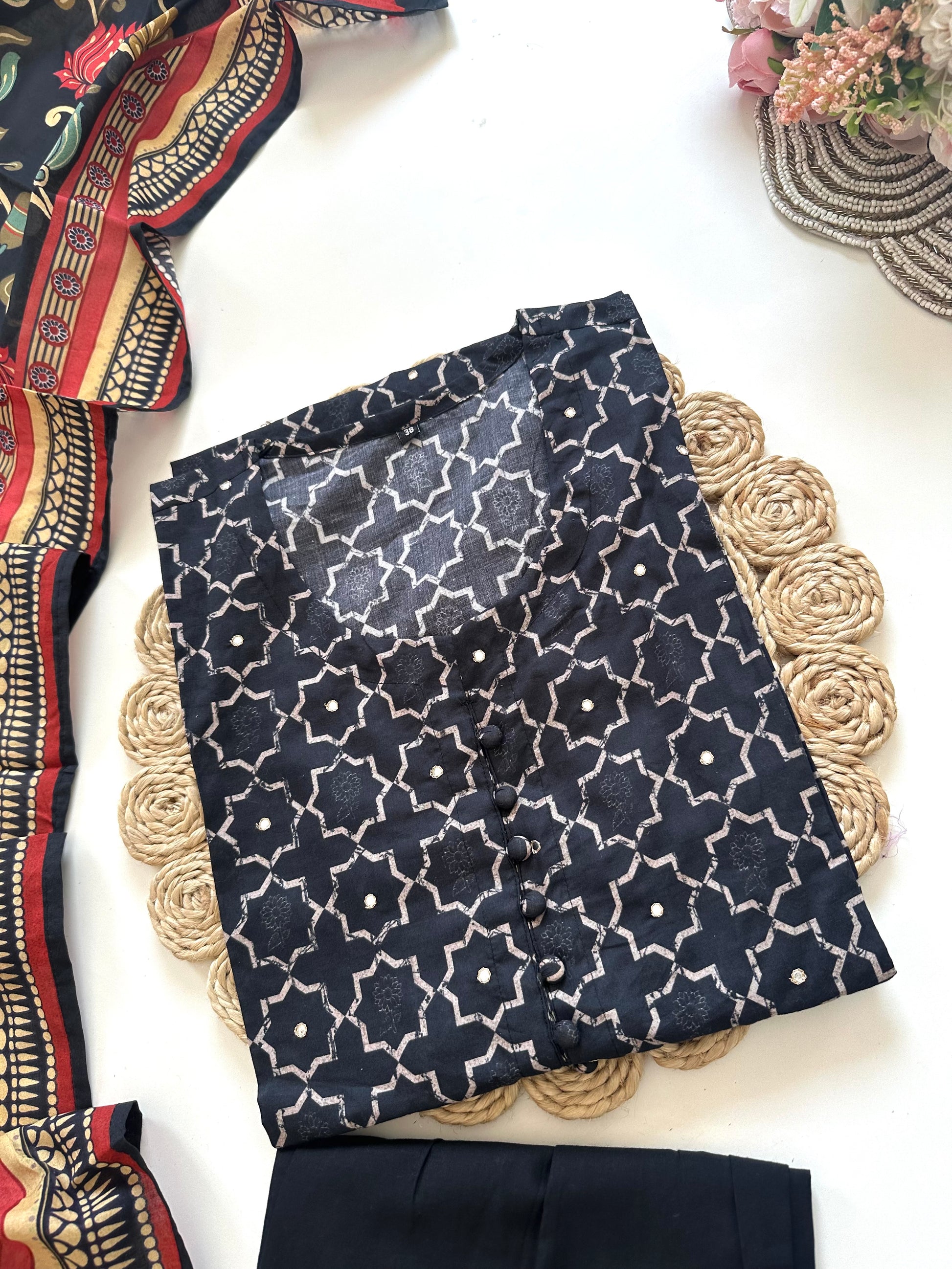 This cotton printed kurti adds a touch of elegance to your wardrobe. Available in 2 colours, the kurti features a straight cut and comes with matching pants and dupatta. Made from breathable cotton, this set offers comfort and style for any occasion.