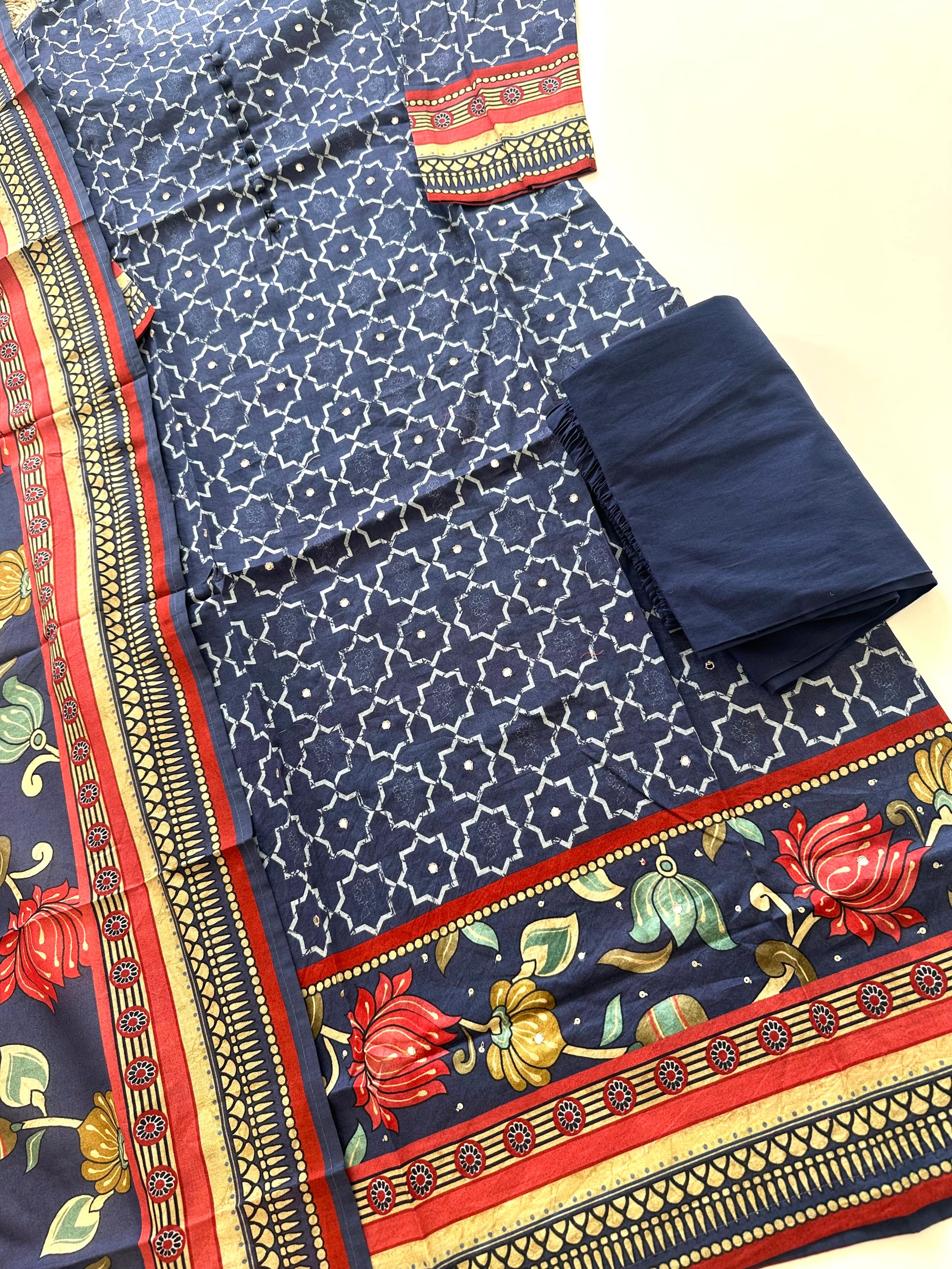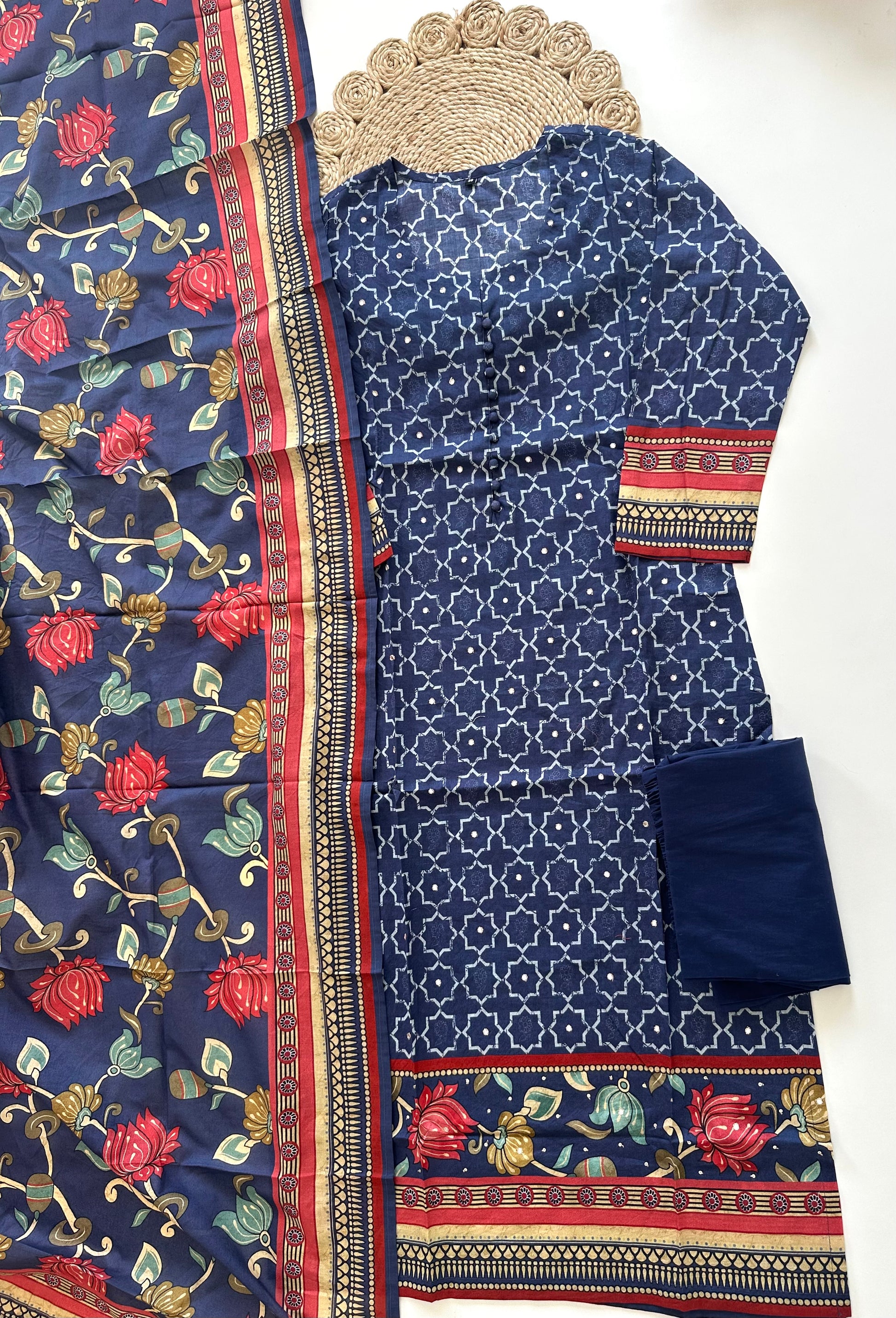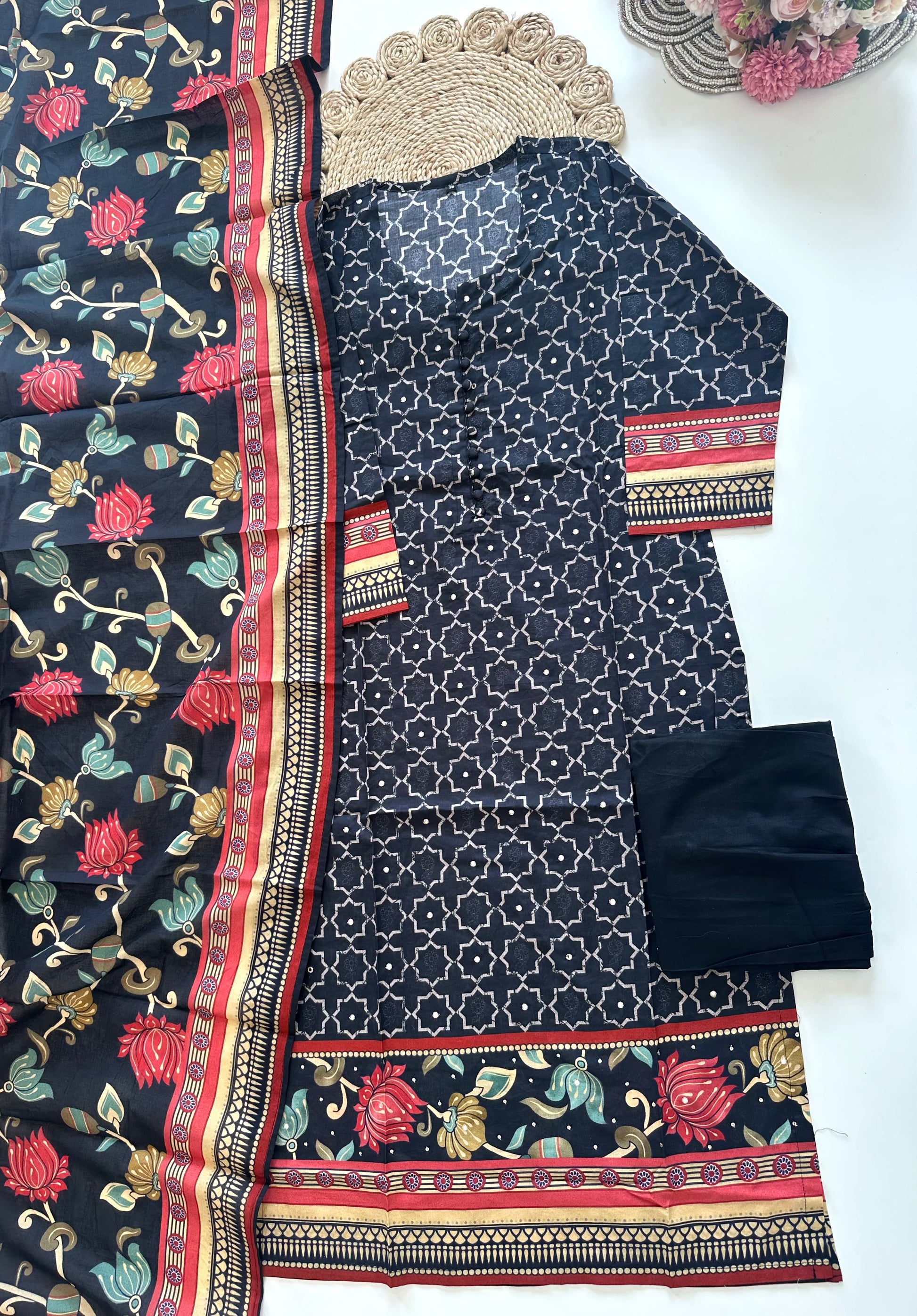 K365 - Cotton printed straight kurti with pants and dupatta in 2 colours .