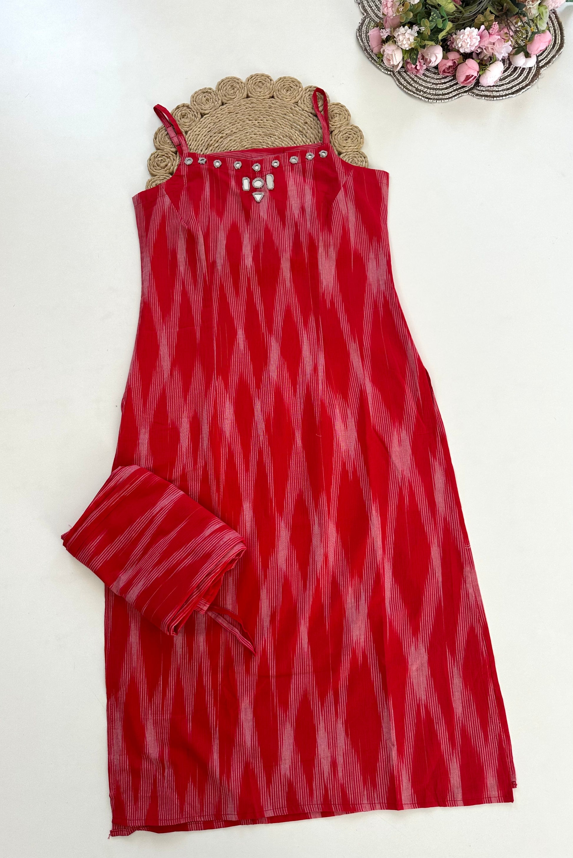 Introducing our Cotton Strap Mirror Work Kurti with Pants in 3 colours. Made from high-quality cotton, this stylish Kurti features intricate mirror work and comes with matching pants. Available in 3 vibrant colours, this Kurti is perfect for any occasion. Elevate your wardrobe and make a statement with this elegant and comfortable ensemble.