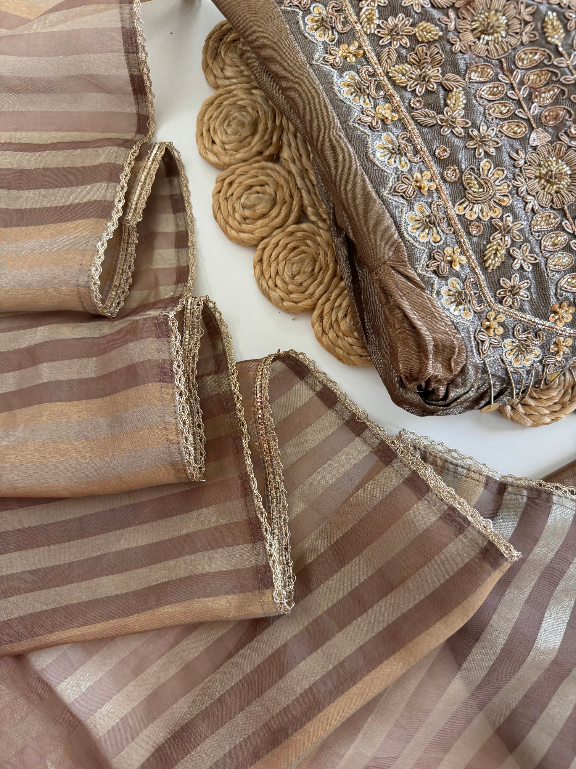 The K228 is a finely crafted Anarkali ensemble made from crush tissue fabric, featuring intricate handwork. It includes a matching pair of pants and a dupatta, offering a complete and elegant outfit suitable for formal occasions. The lightweight fabric enhances comfort while ensuring a refined aesthetic.