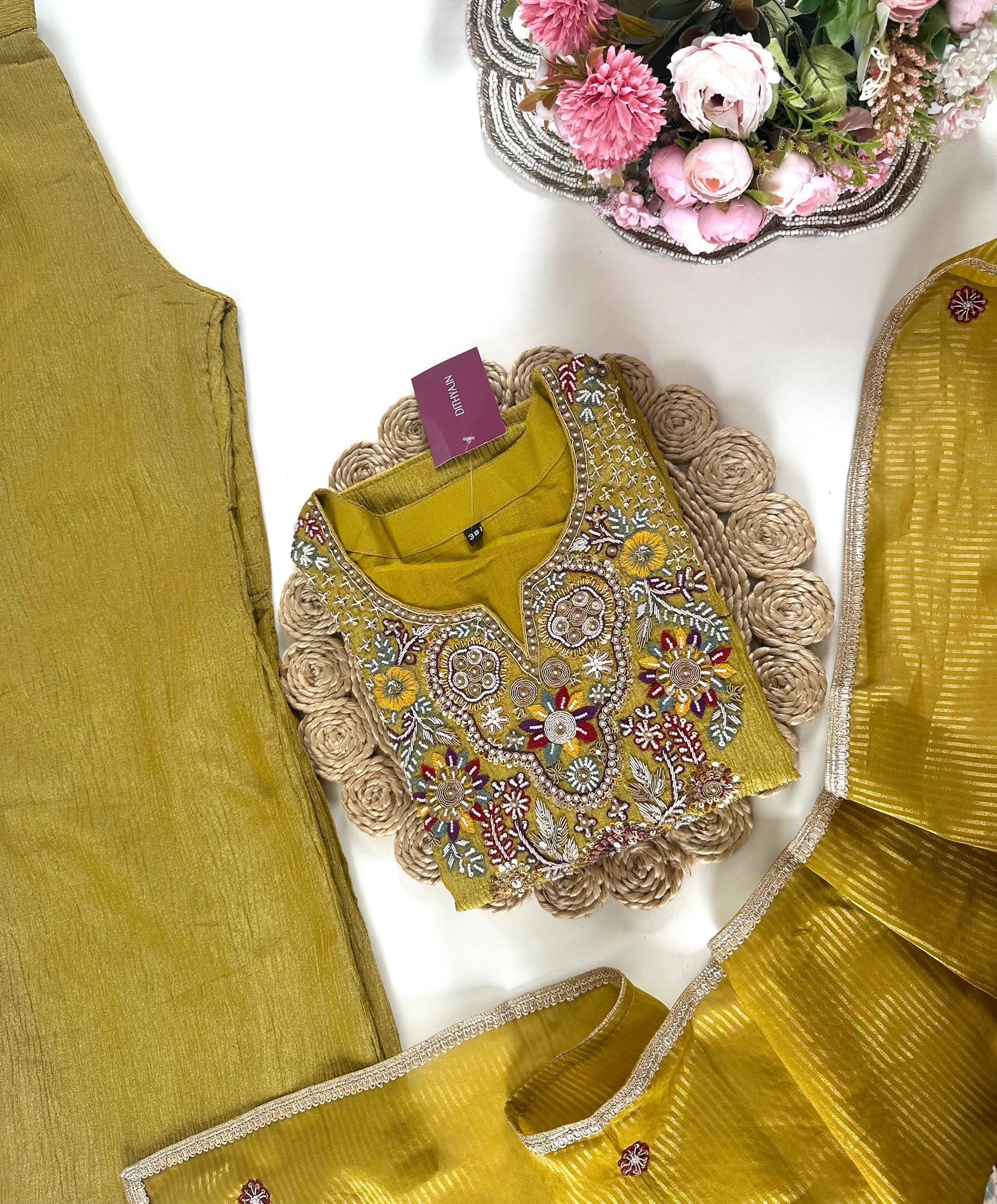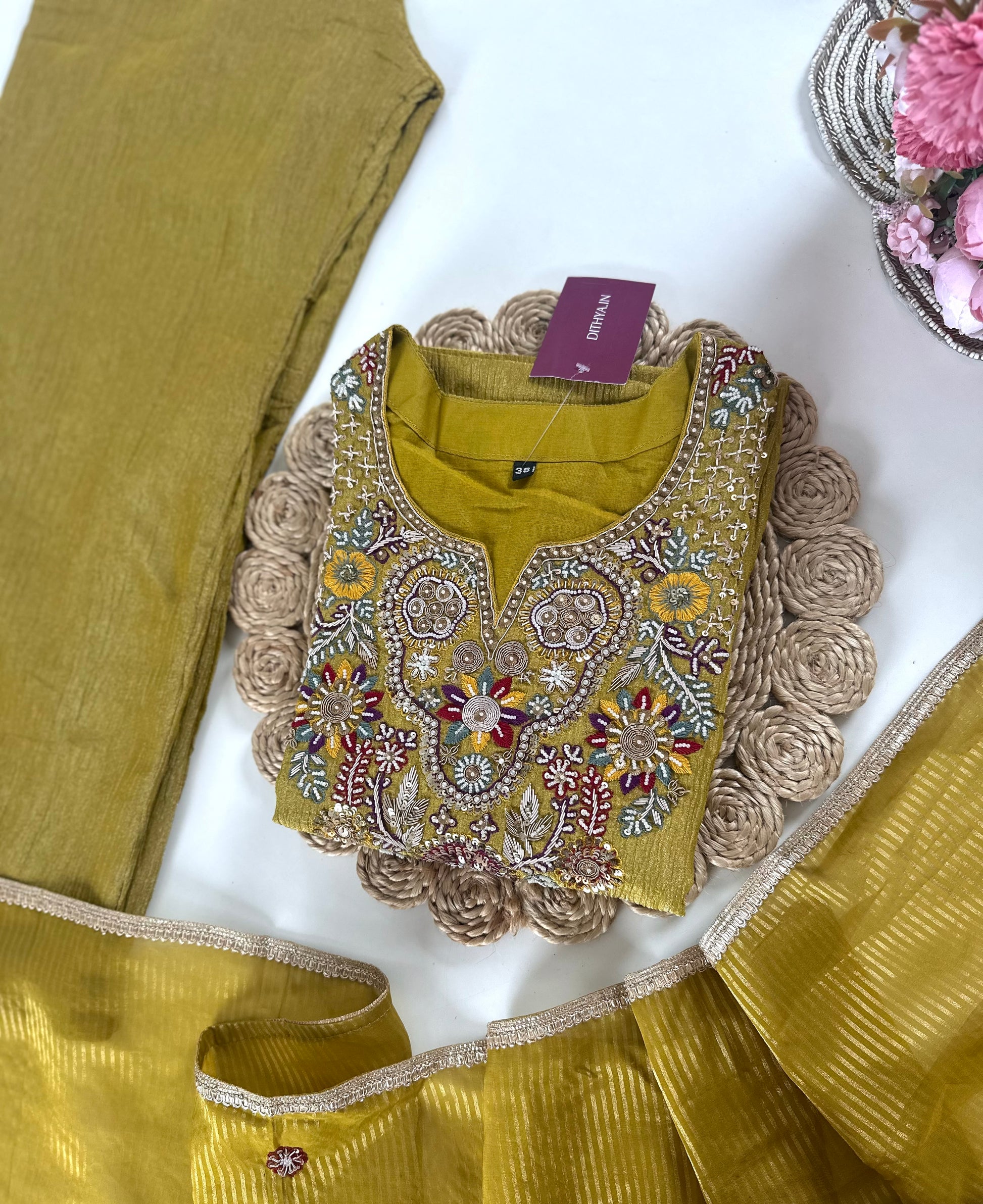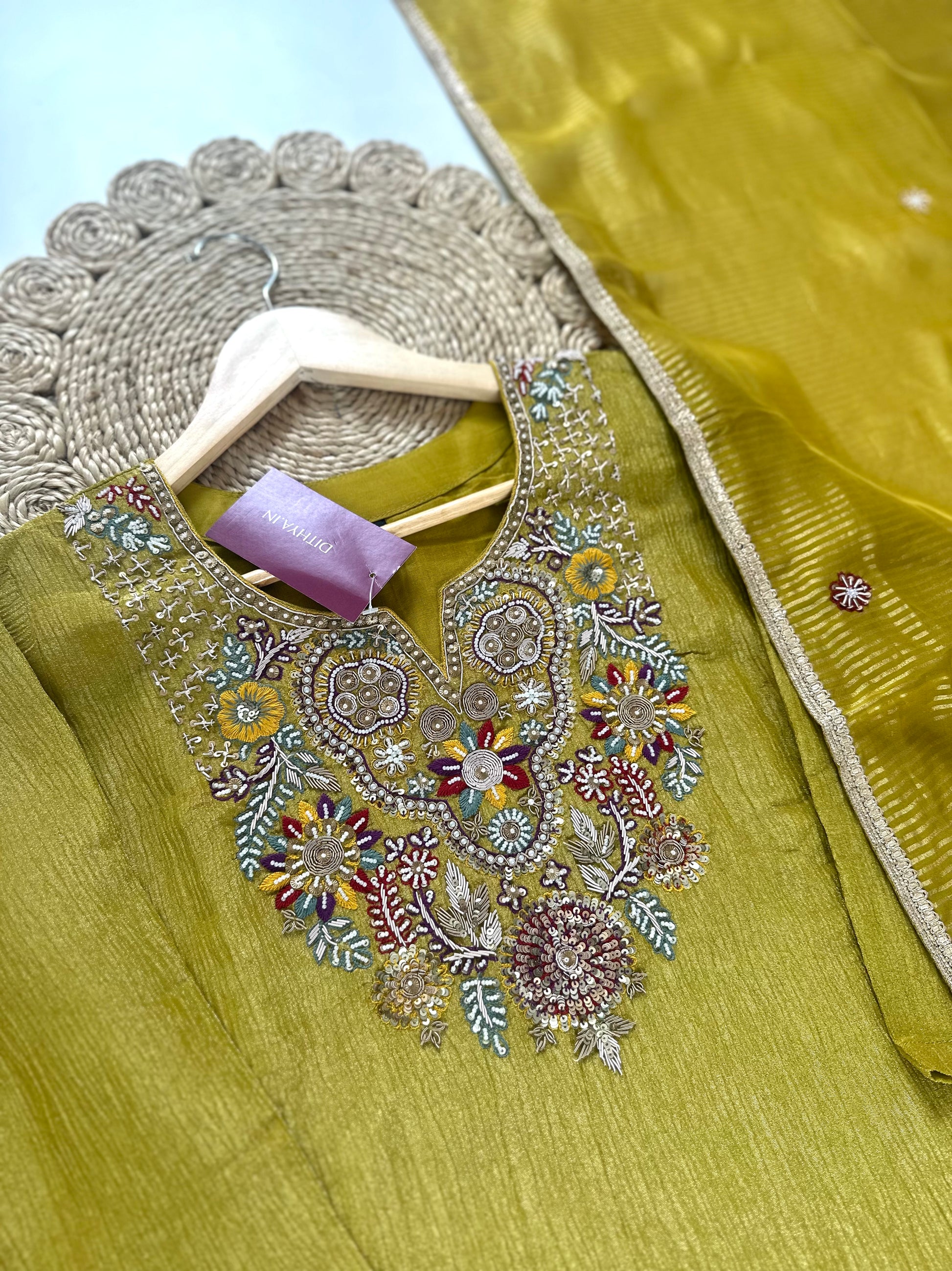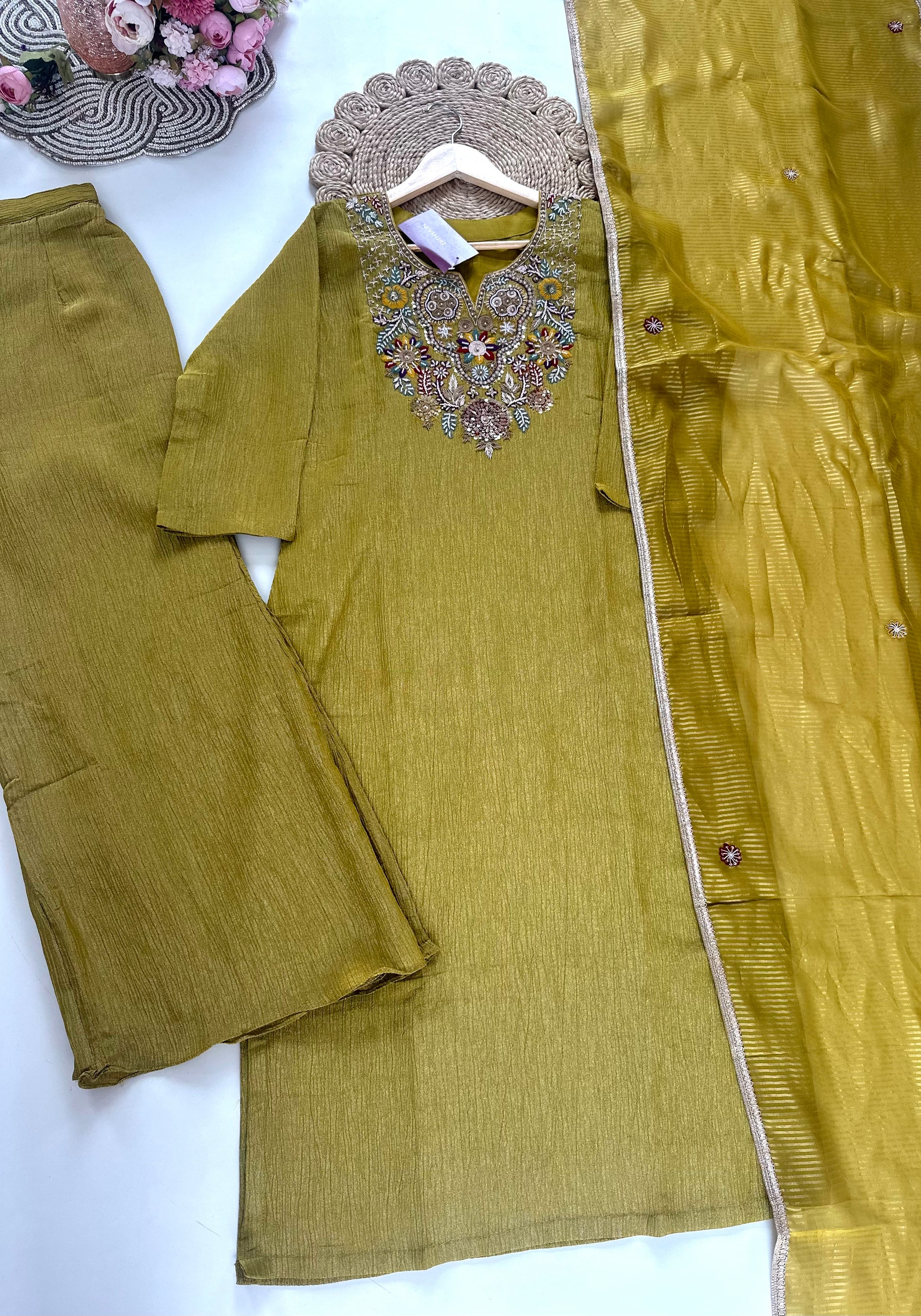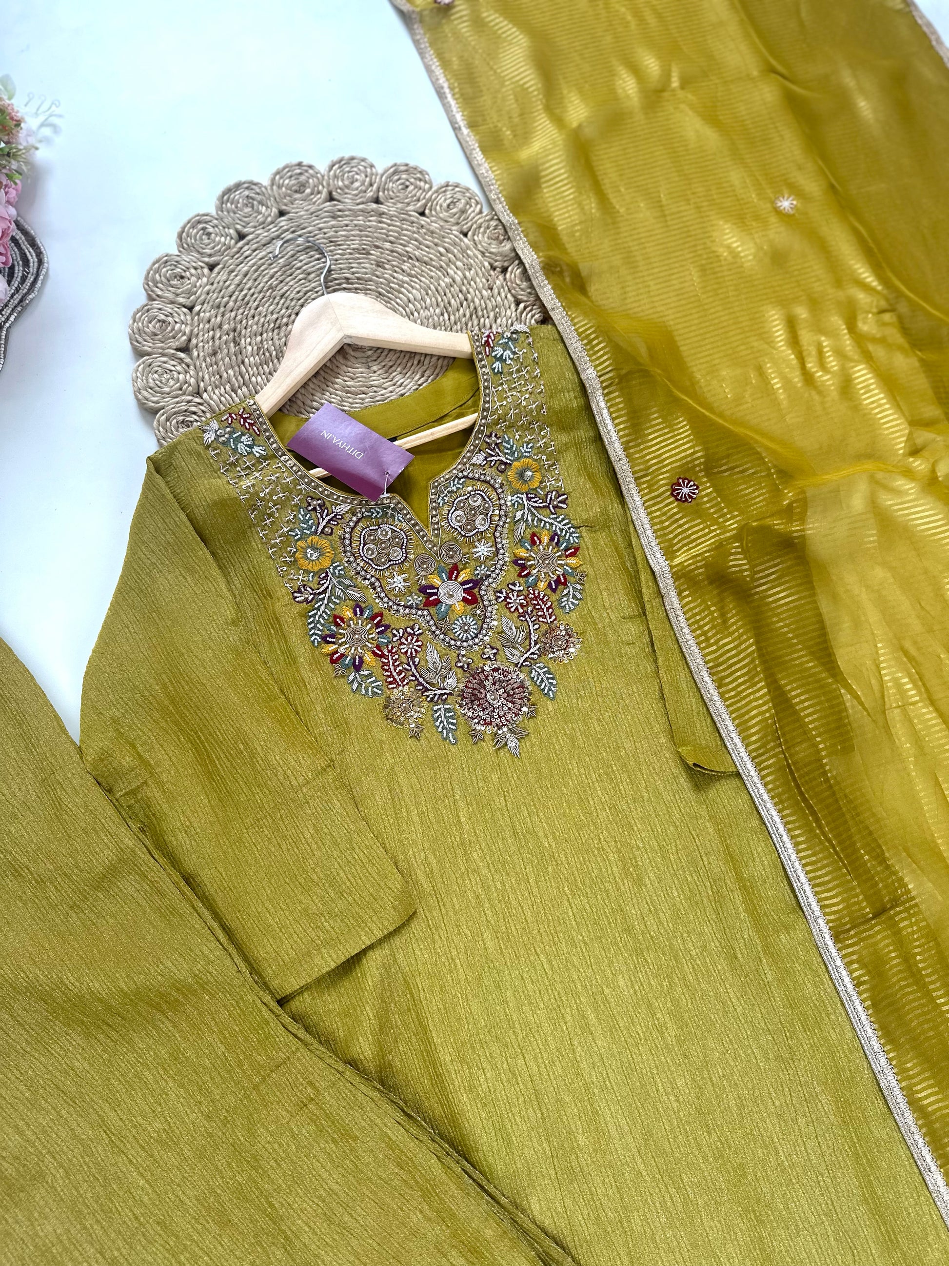 K289 - Crush Tissue silk straight handwork kurti with palazzo and dupatta