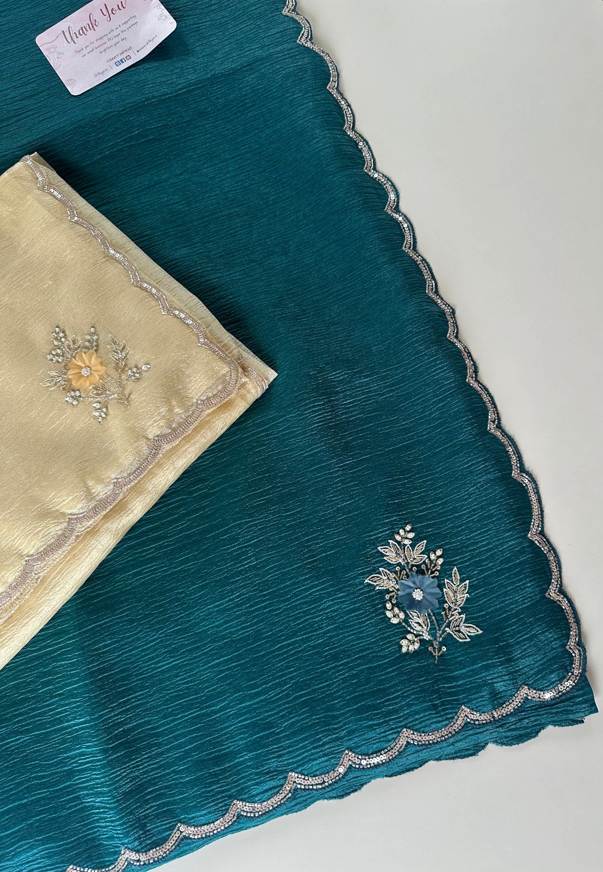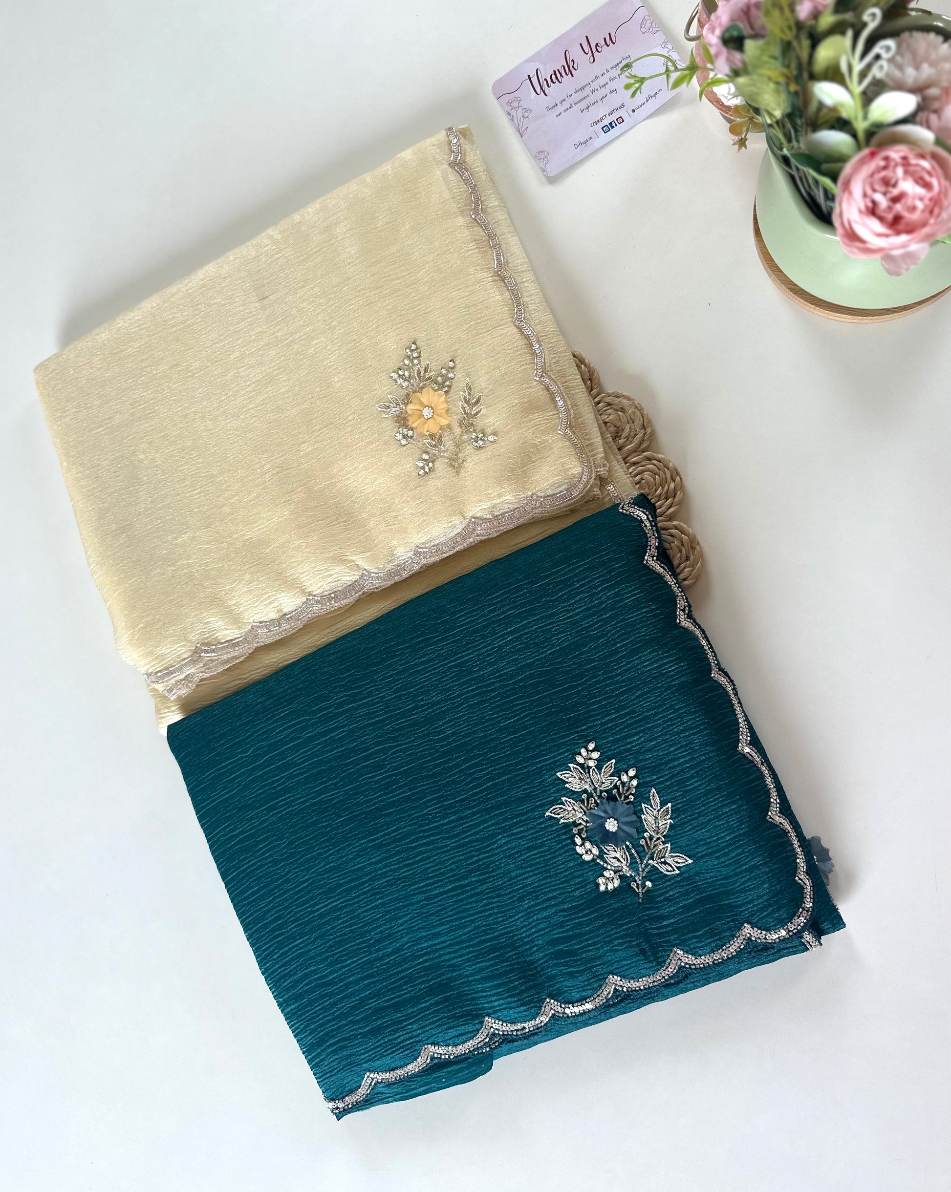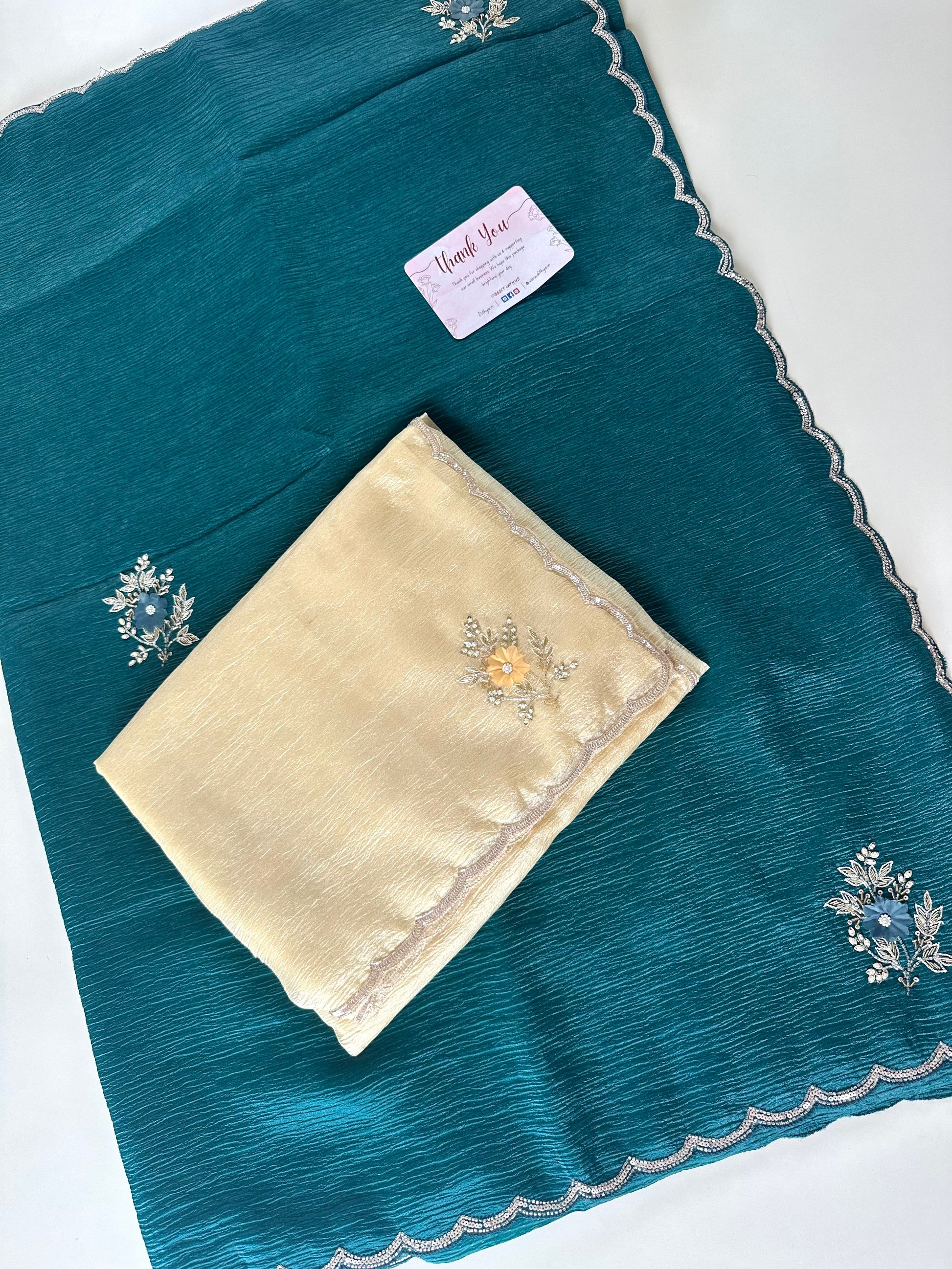 This crushed tissue handwork saree is available in two beautiful colors. The delicate handwork adds an elegant touch to this traditional garment. Perfect for any occasion, this saree is sure to make you stand out in style.