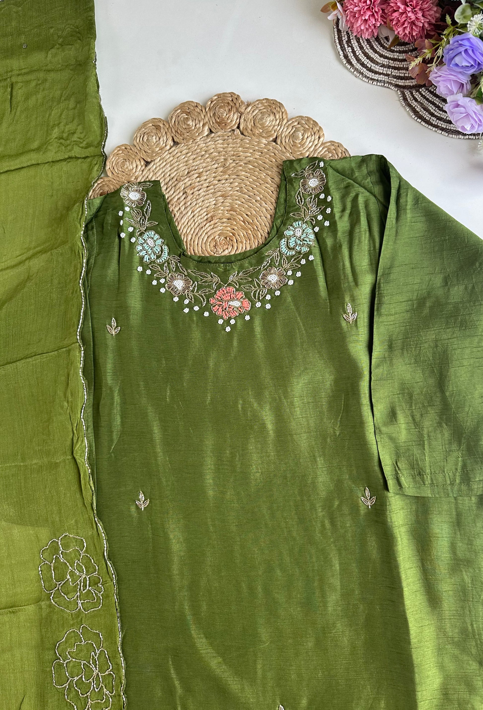 D054 -Dola silk straight kurti with pants and dupatta