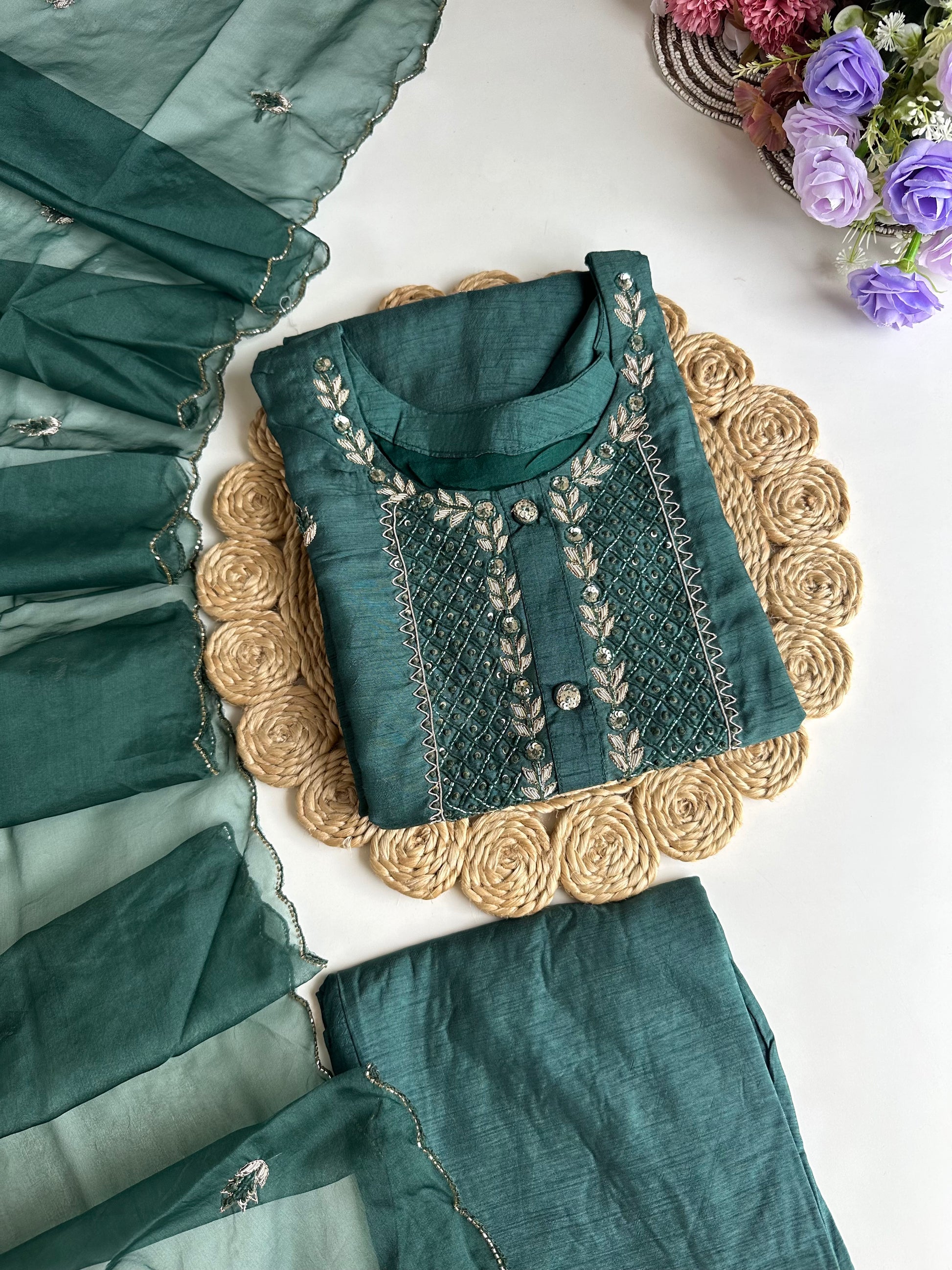 D080 -Dola silk straight kurti with pants and dupatta