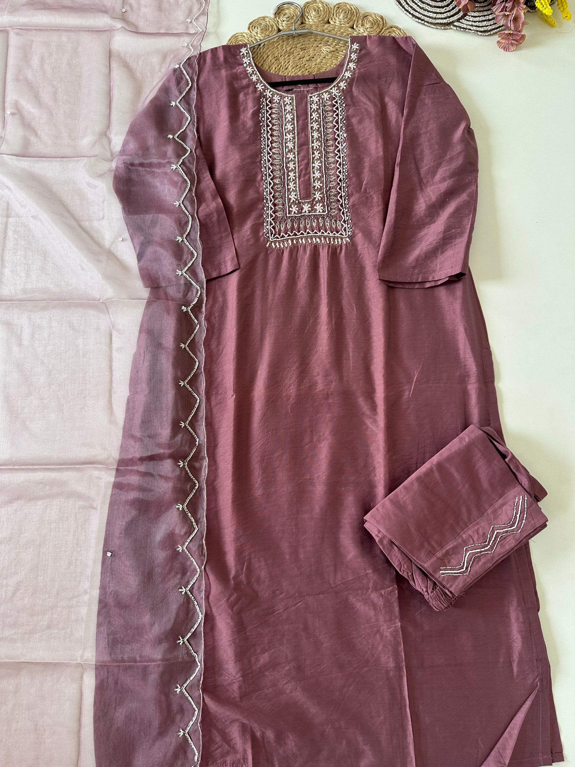 D128 - Roman silk handwork straight Kurti with pants and dupatta