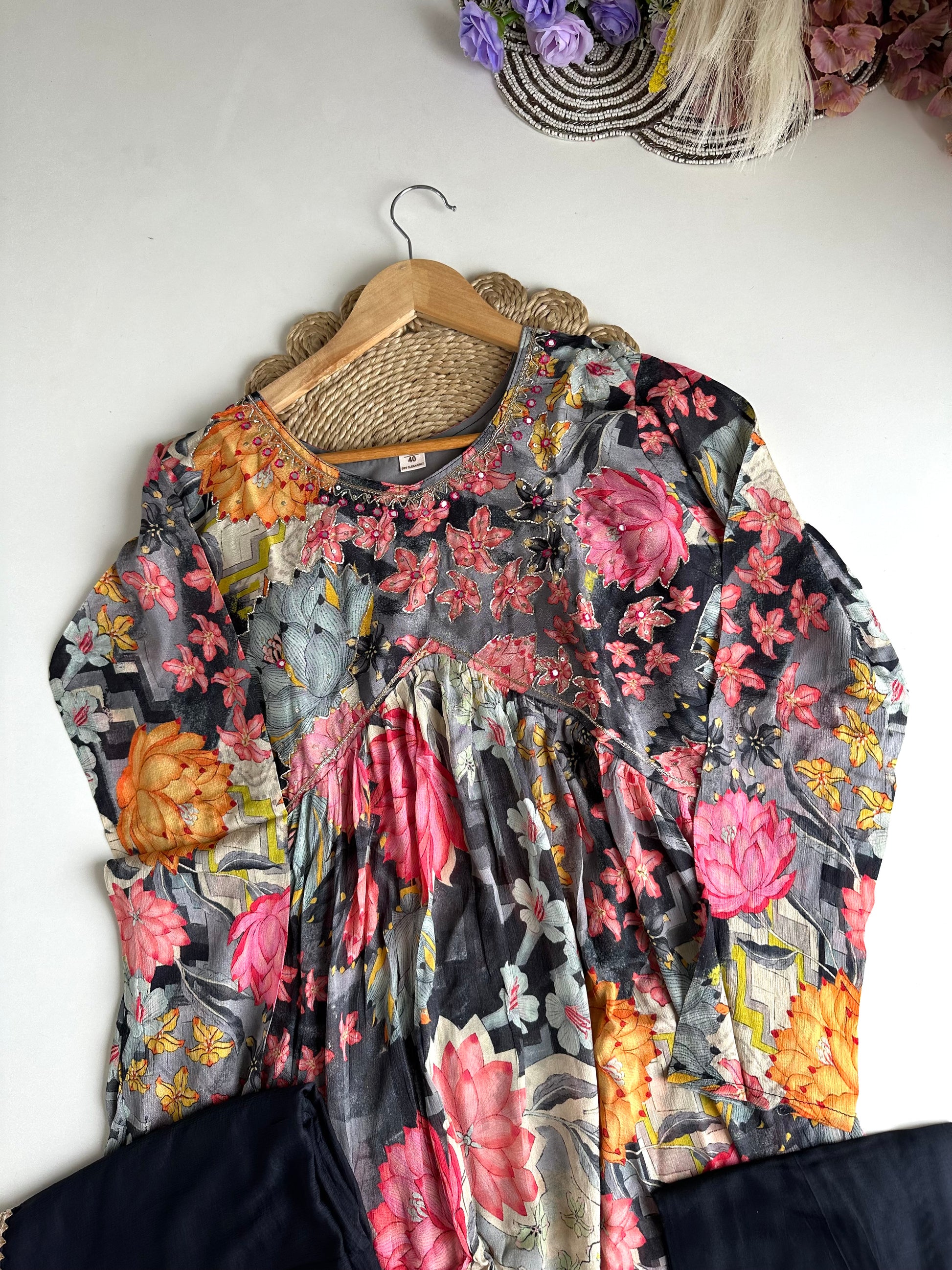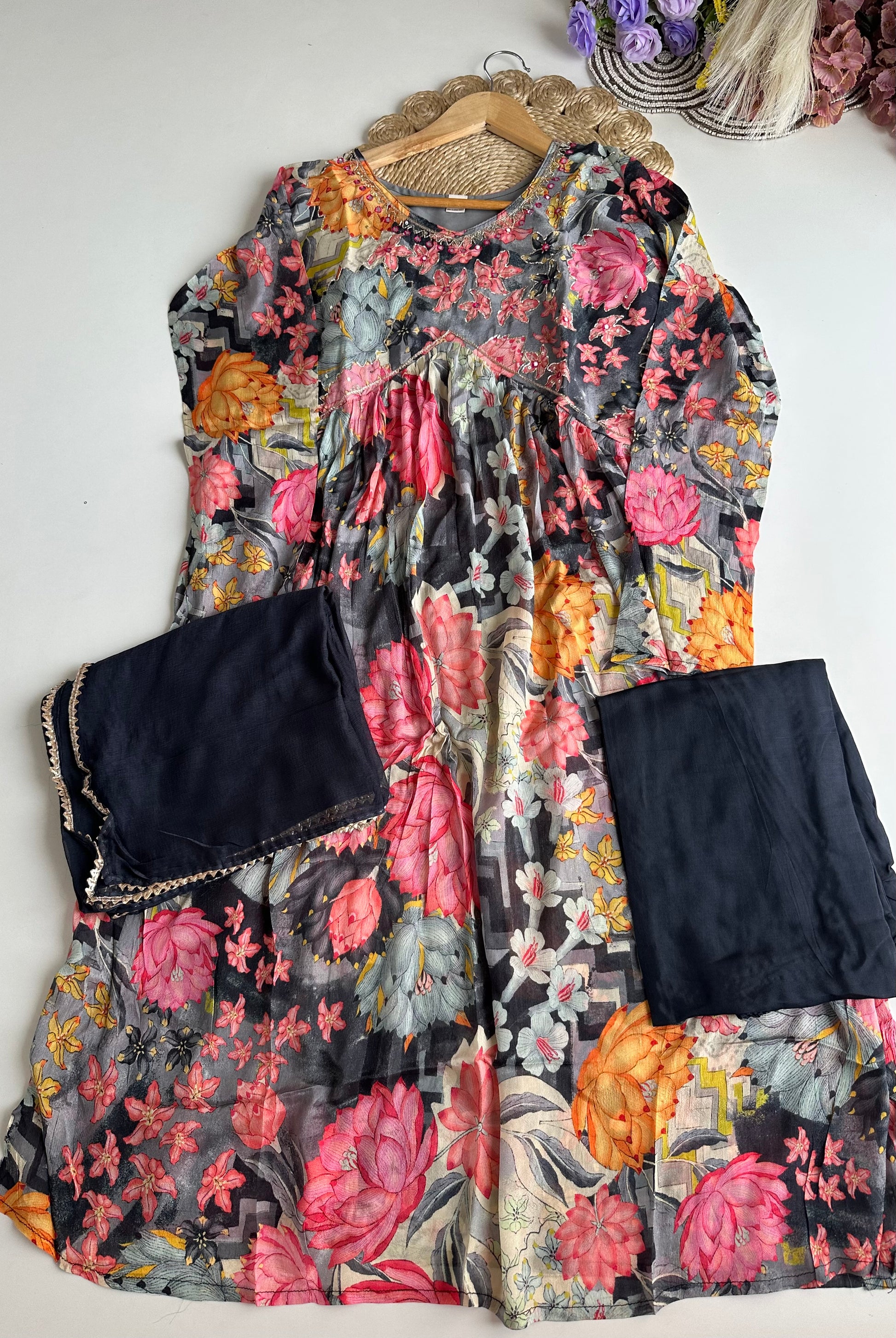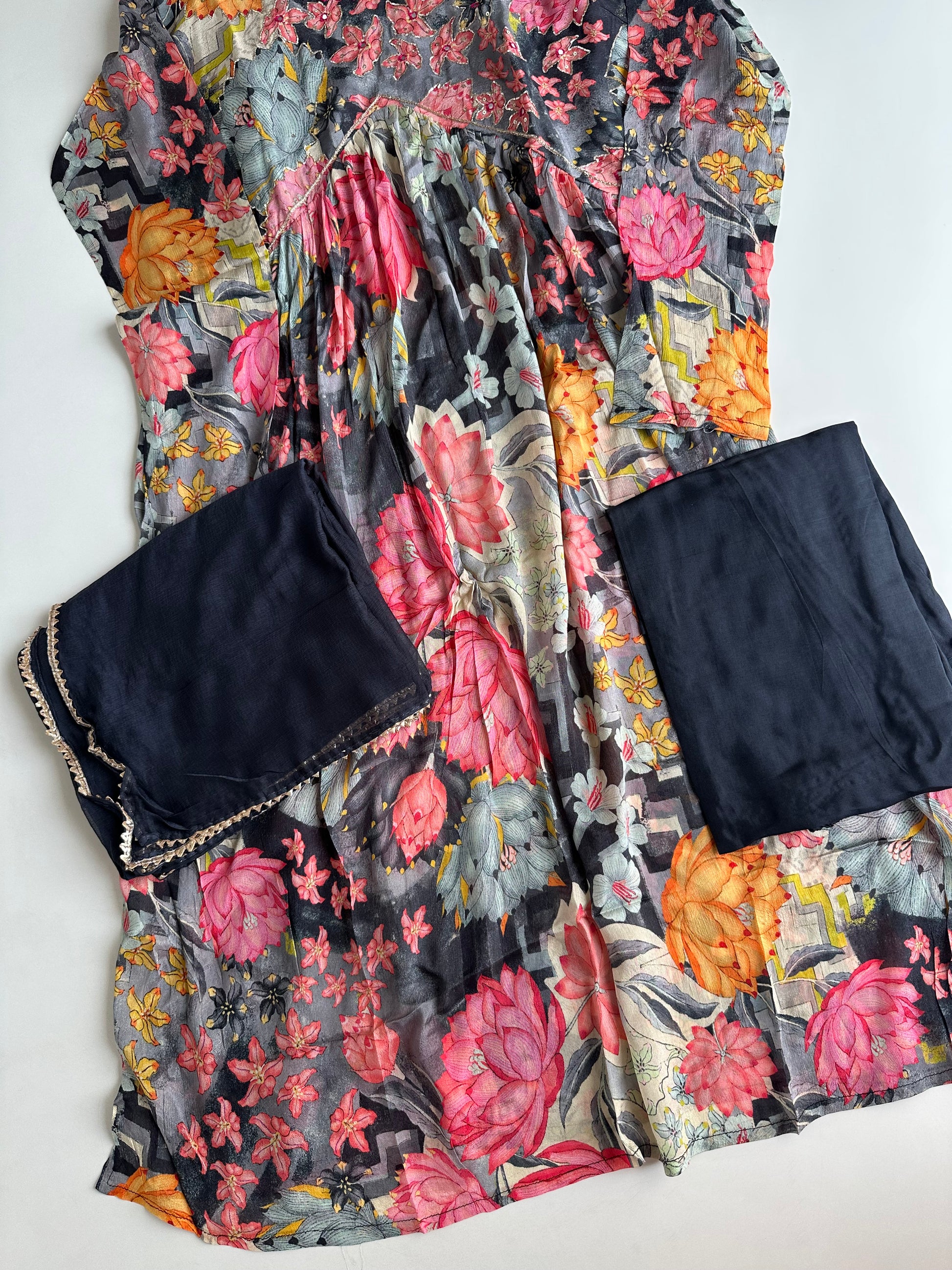 D146 - Chinnon Silk Alia cut Anarkali with pants and dupatta
