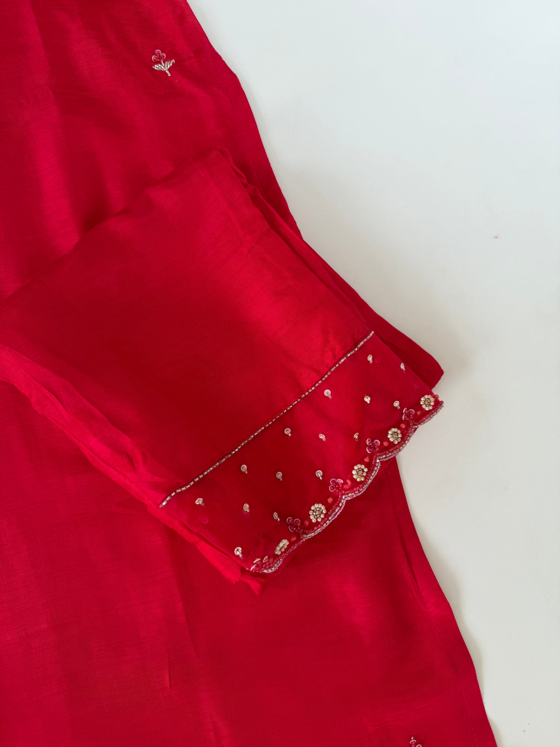 Elevate your ethnic wardrobe with this exquisite Dola silk ensemble. Crafted from premium Dola silk, this straight-cut kurti features intricate handwork detailing that showcases traditional artistry. The set includes coordinated pants and a flowing dupatta, offering a complete, polished look for festive occasions, celebrations, or everyday elegance. The natural drape of Dola silk ensures comfort while maintaining a sophisticated silhouette. Perfect for those who appreciate fine craftsmanship and timeless style.