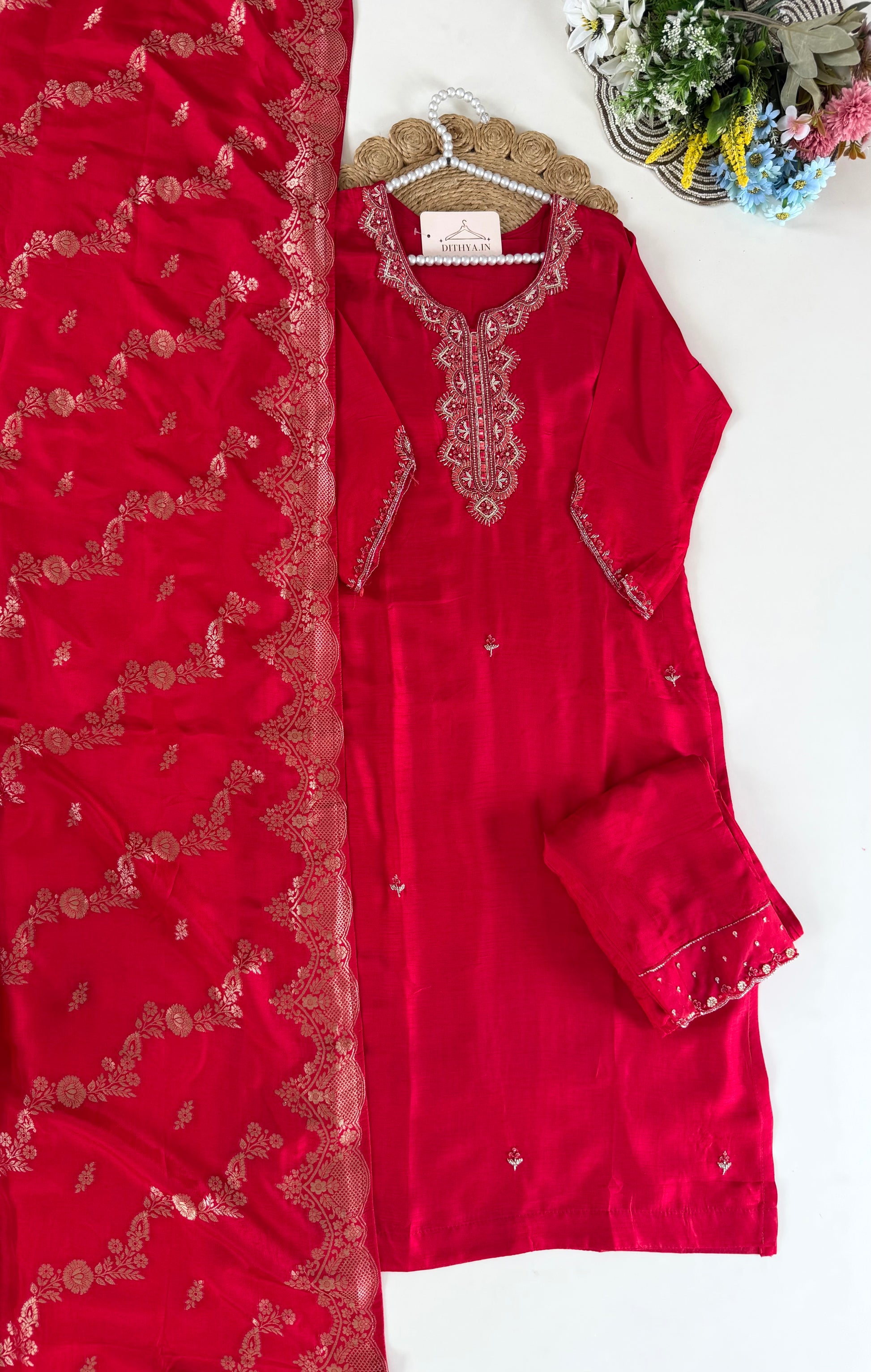 K641 - Dola silk Handwork straight Kurti with pants and dupatta