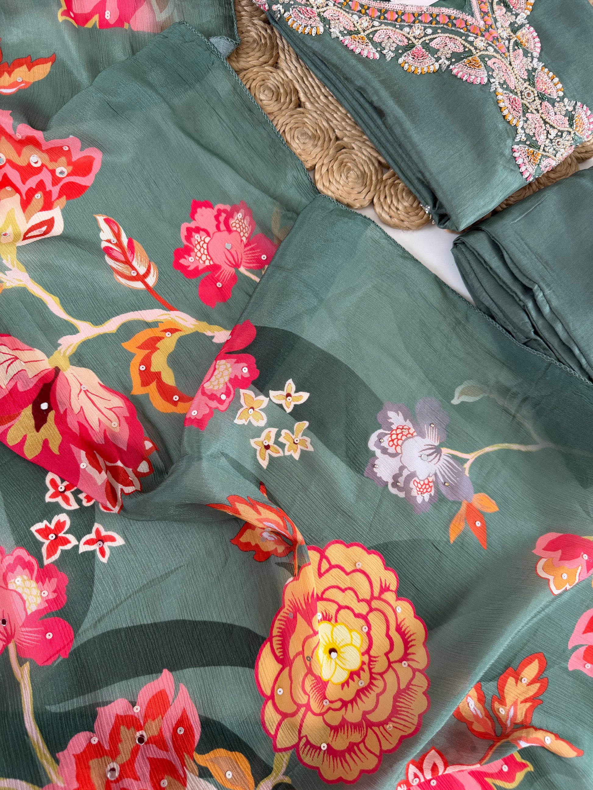 Elevate your ethnic wardrobe with this exquisite Dola silk ensemble. Crafted from premium Dola silk, this straight-cut kurti features intricate handwork detailing that showcases traditional artistry. The set includes coordinated pants and a flowing dupatta, offering a complete, sophisticated look perfect for festive occasions, celebrations, or everyday elegance. The natural drape of Dola silk ensures comfort while maintaining a polished appearance. Ideal for those who appreciate quality craftsmanship and timeless style.