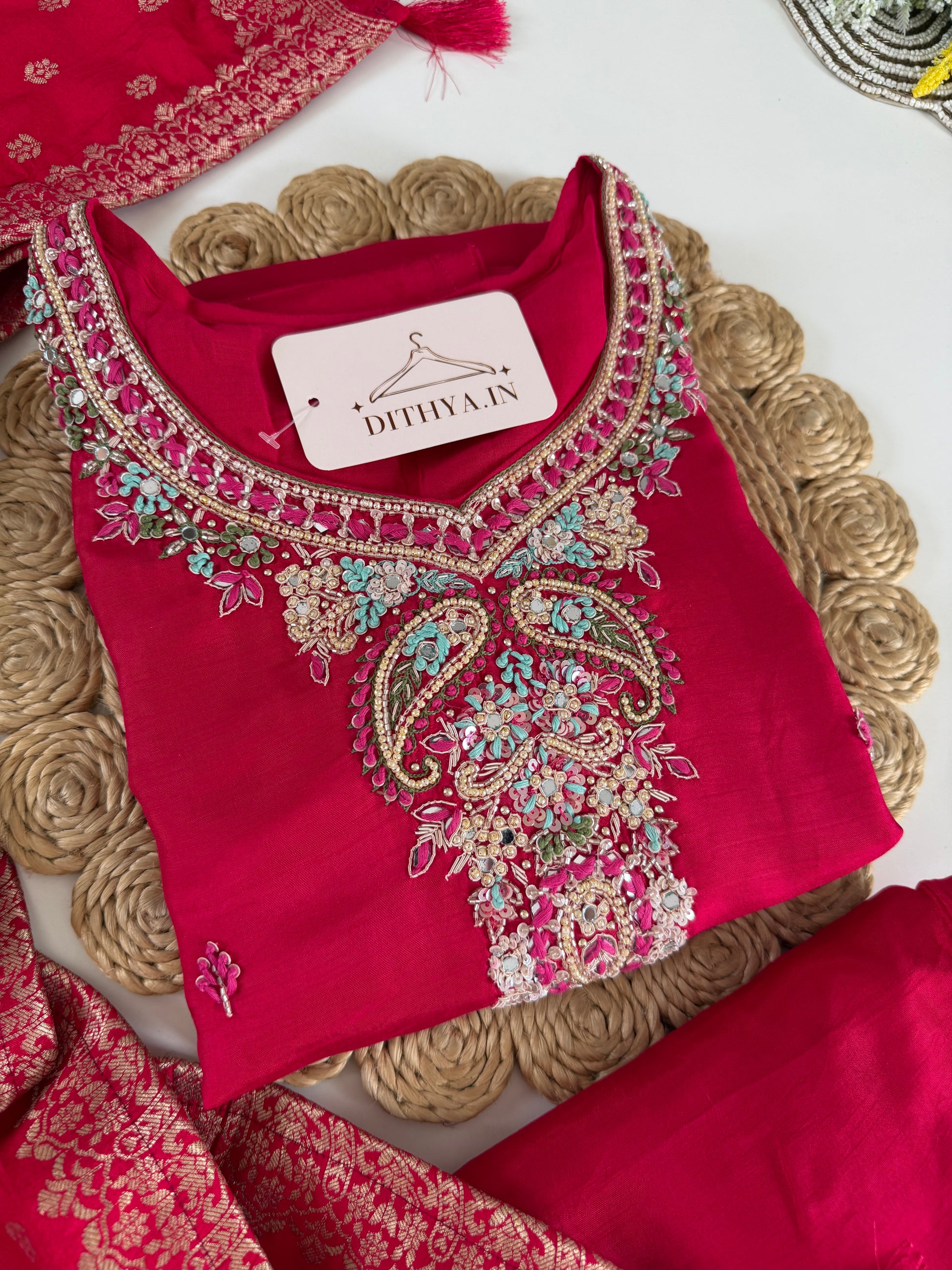 K643 - Dola silk Handwork straight Kurti with pants and dupatta
