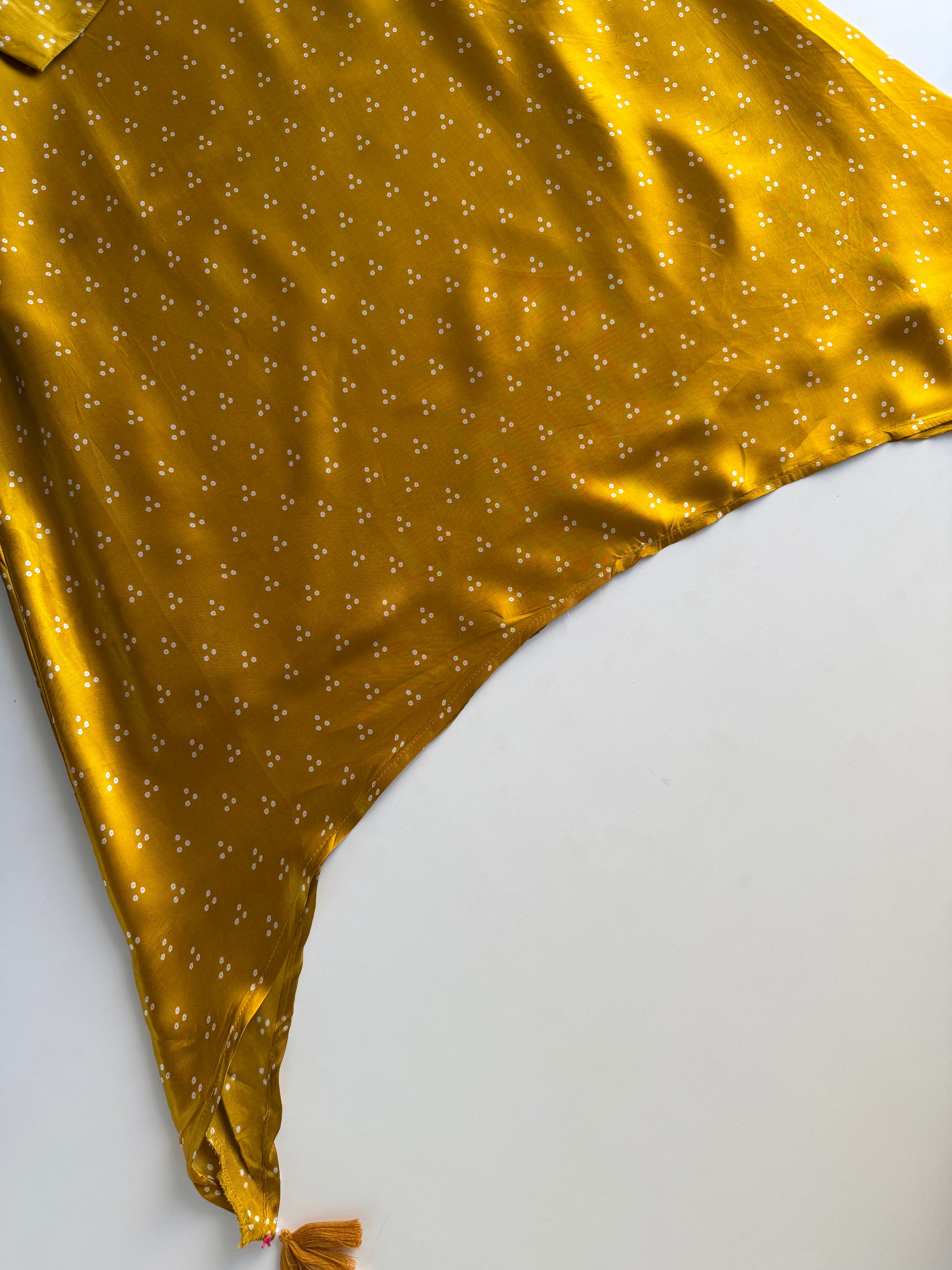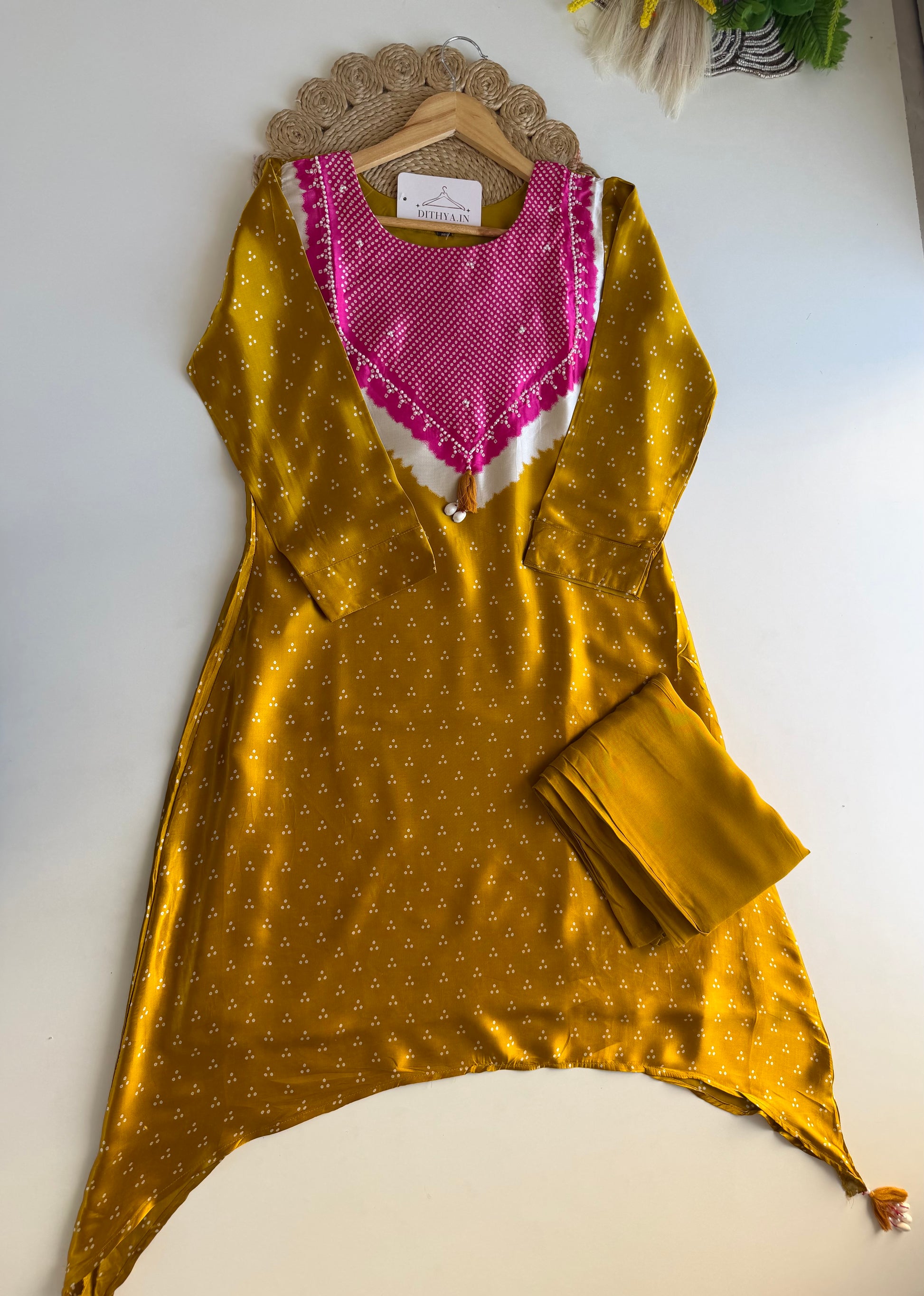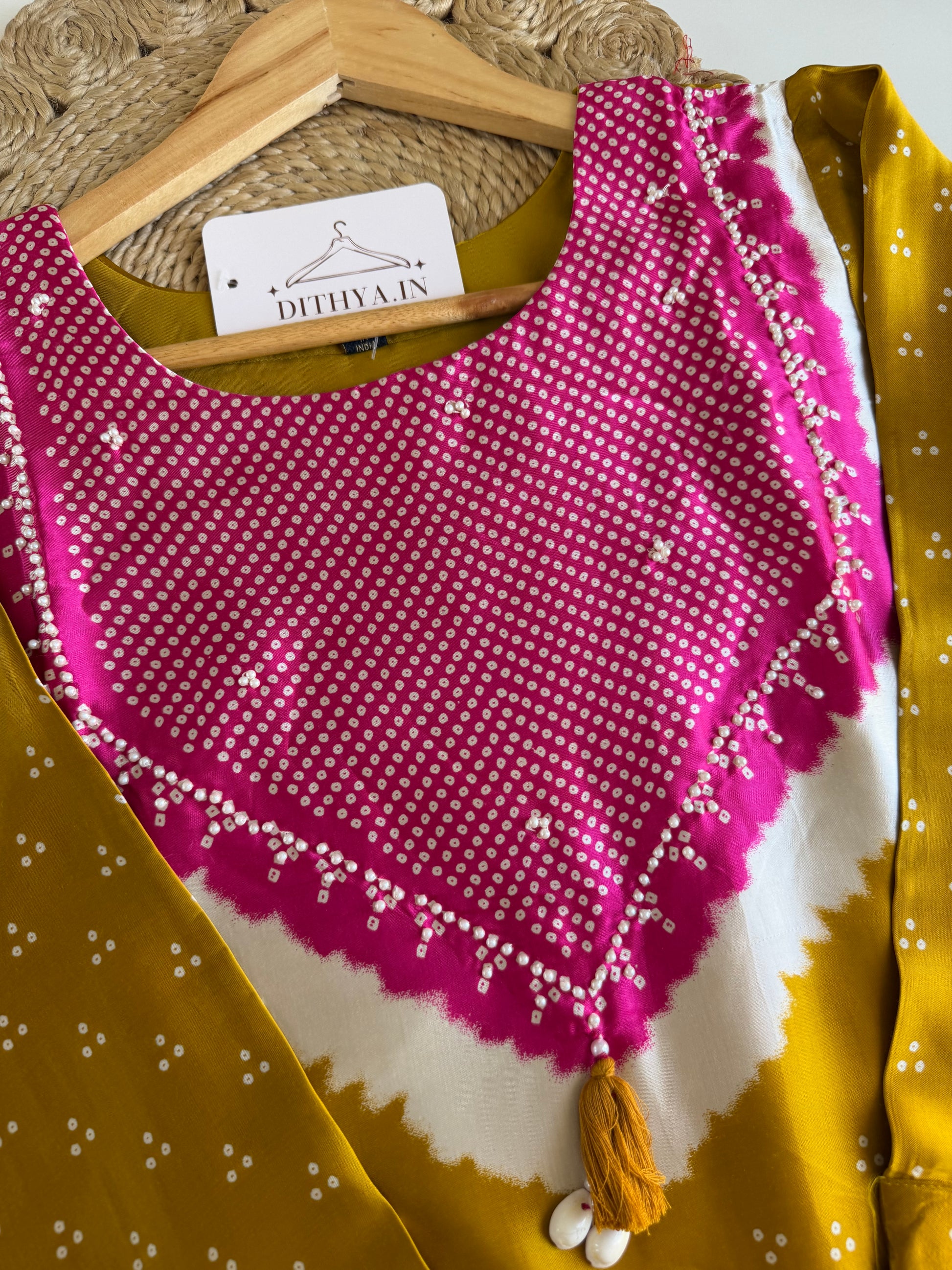 Crafted from luxurious Gaji silk, this bandhini coord set offers an impeccable blend of sophistication and comfort. Its intricate design and superior fabric provide a timeless appeal, making it a perfect addition to any wardrobe. Upgrade your style game with this elegant and versatile set.