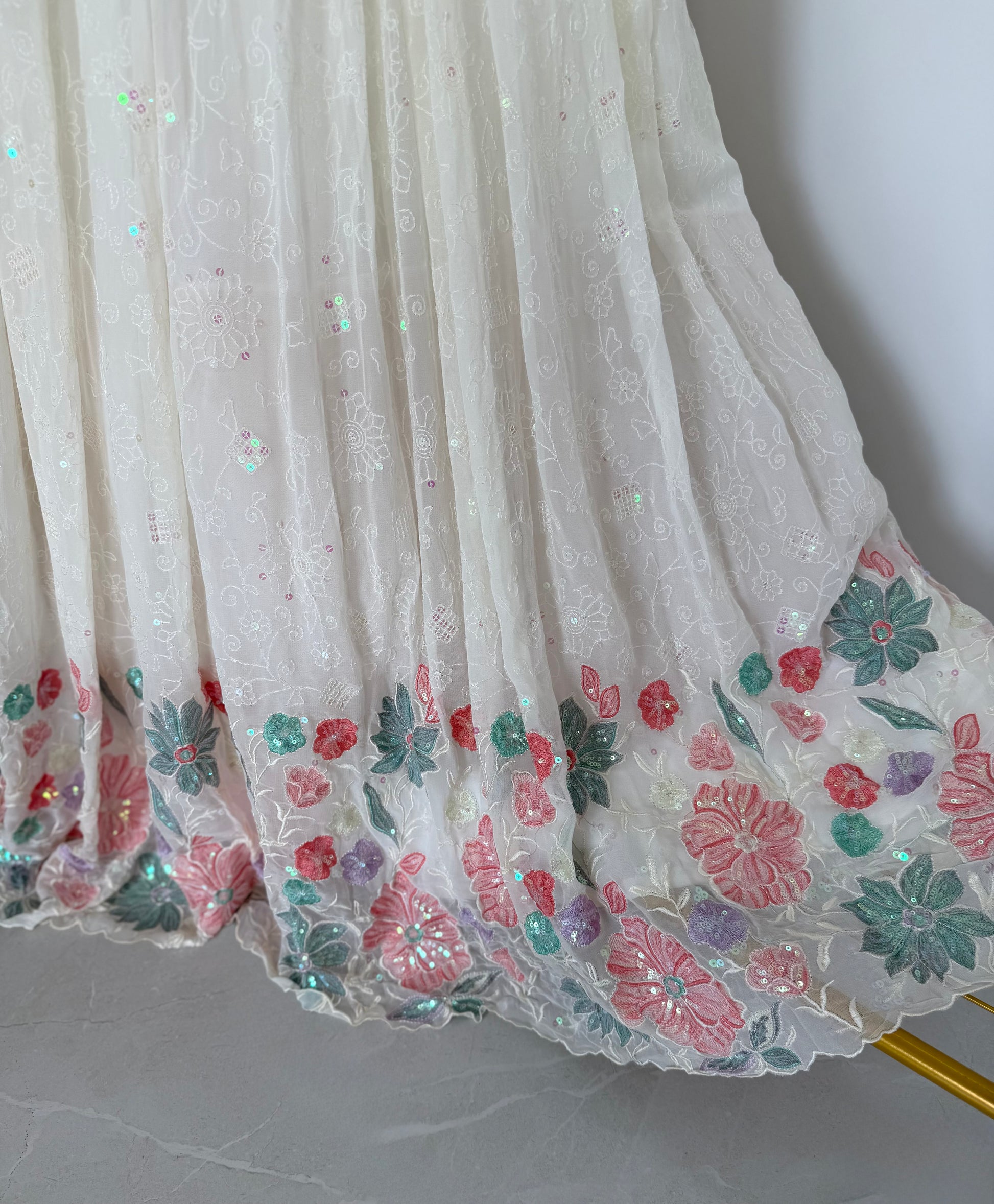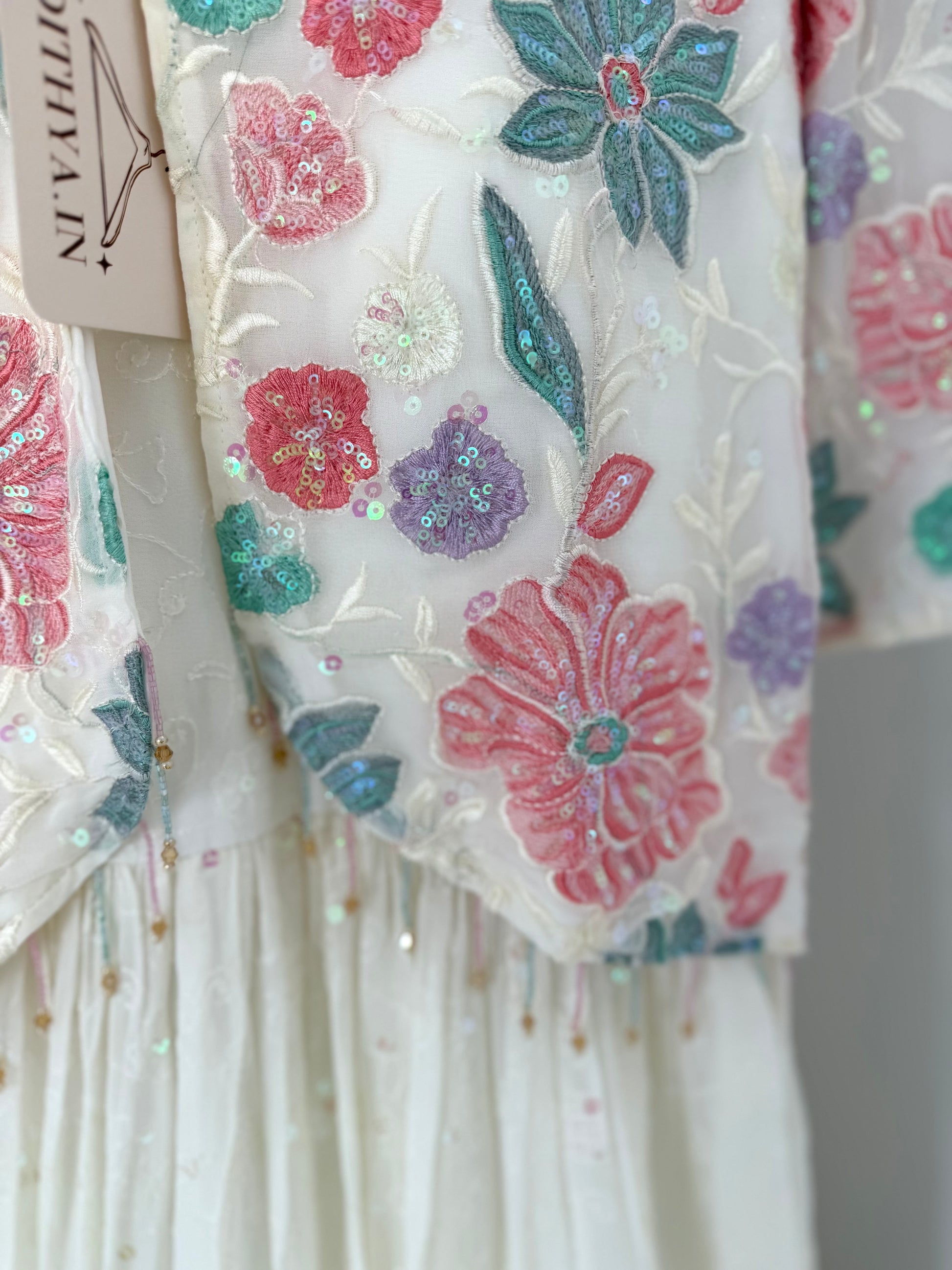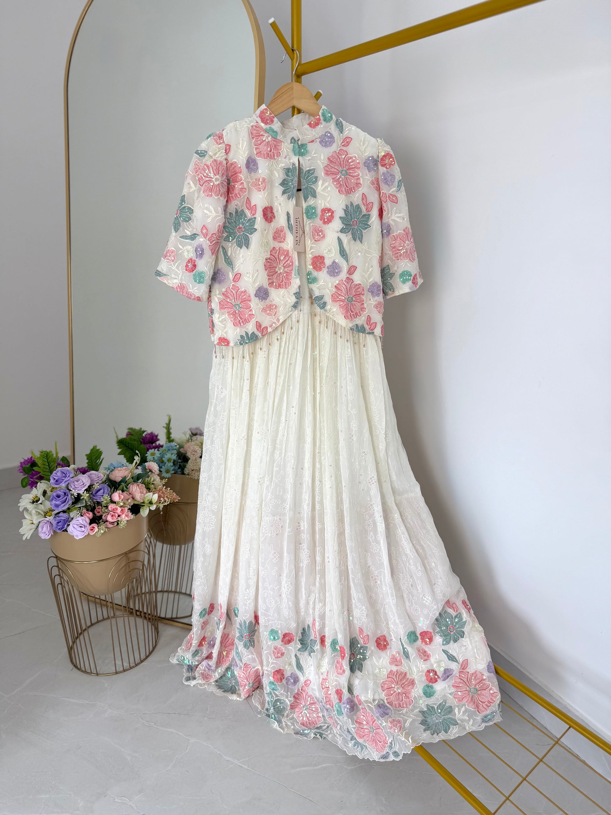 As an industry expert, I present the K524, a stunning Georgette Floral embroidered crop blazer paired with a floor-length gown. The intricate floral embroidery adds a touch of elegance to this ensemble, making it perfect for formal events or special occasions. The flowy georgette fabric ensures comfort and breathability, while the cropped blazer adds a modern twist. Elevate your style with this unique and sophisticated outfit.