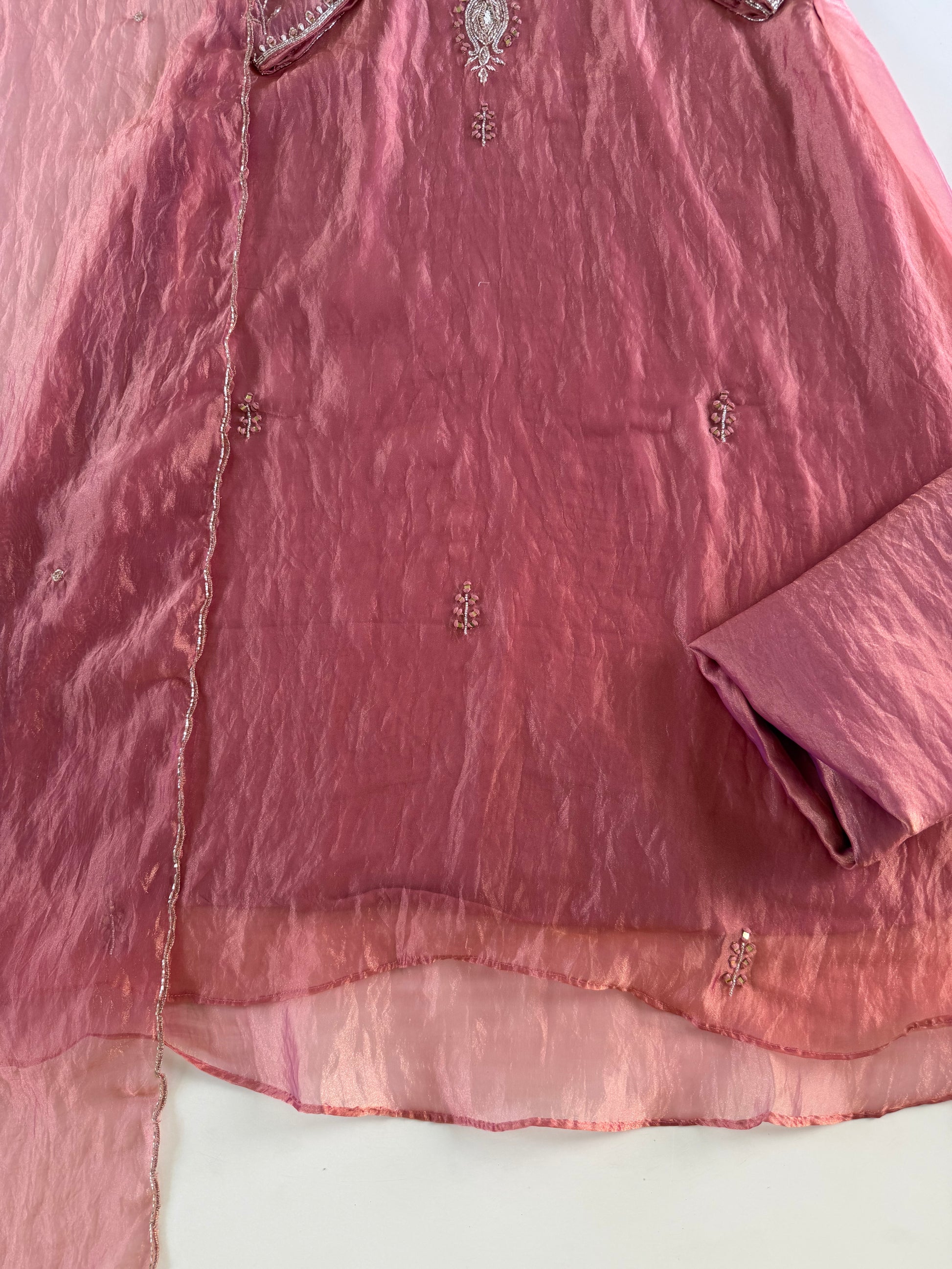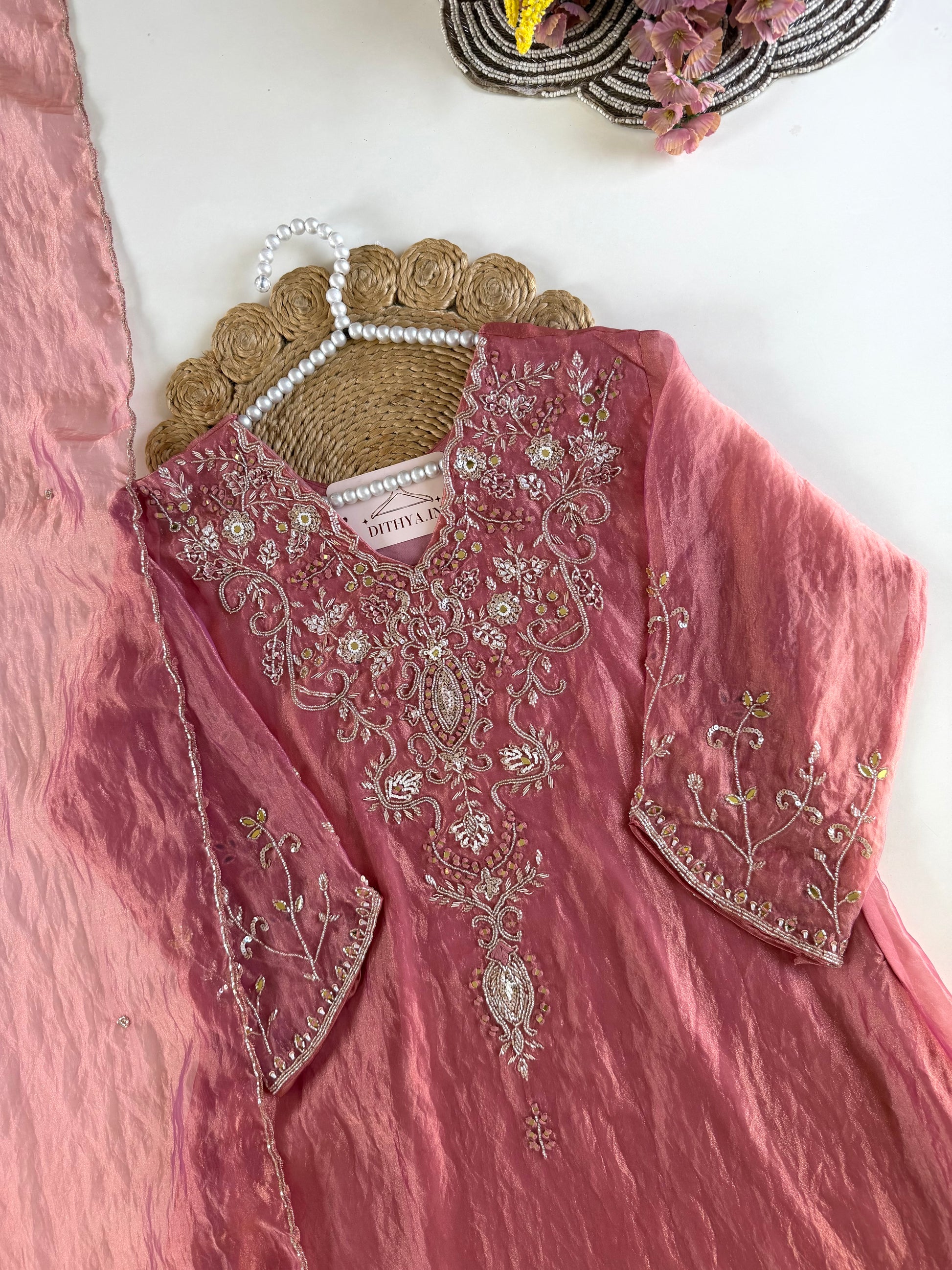 K599 -Glass tissue silk handwork aline Kurti with pants and dupatta