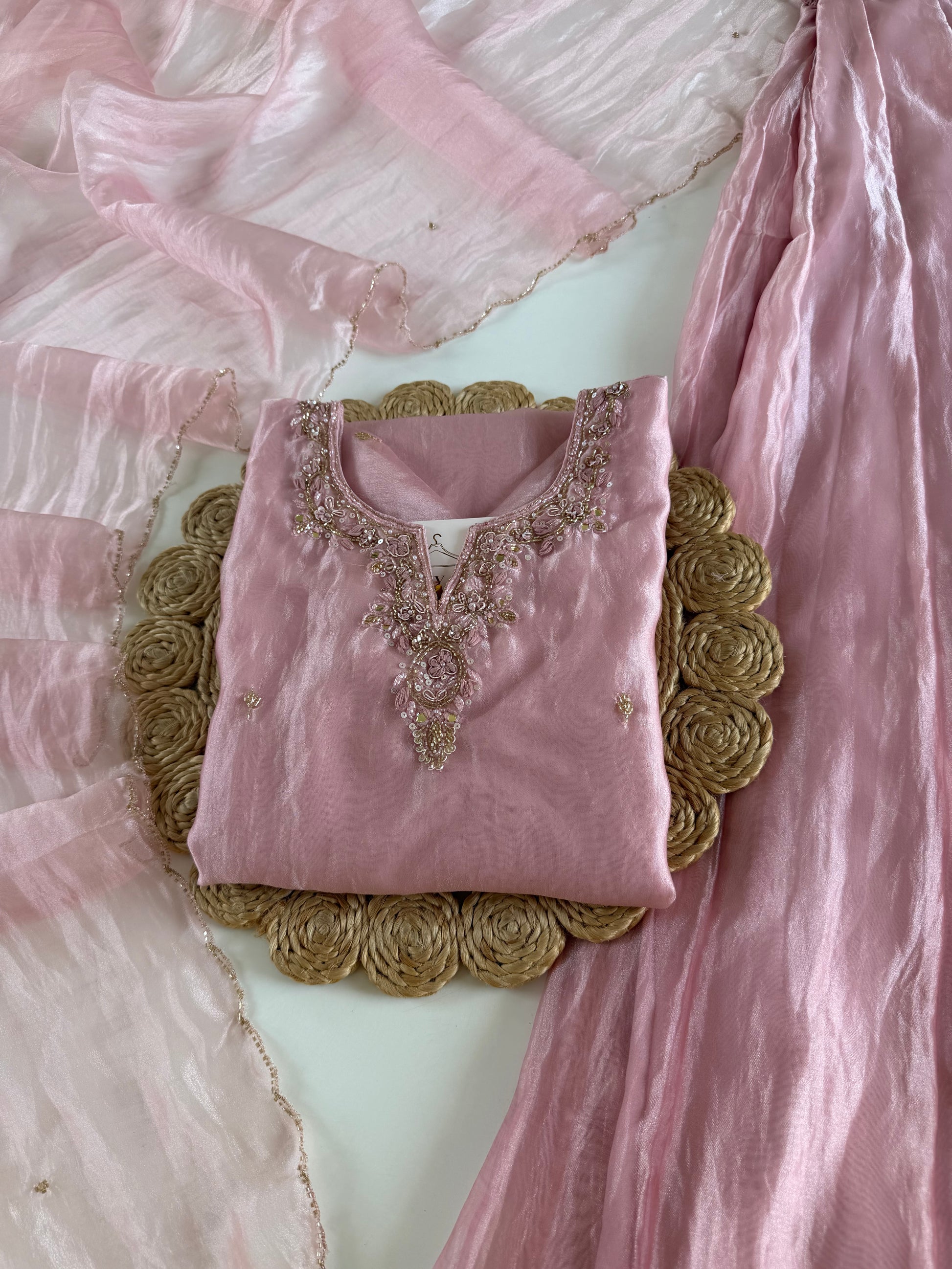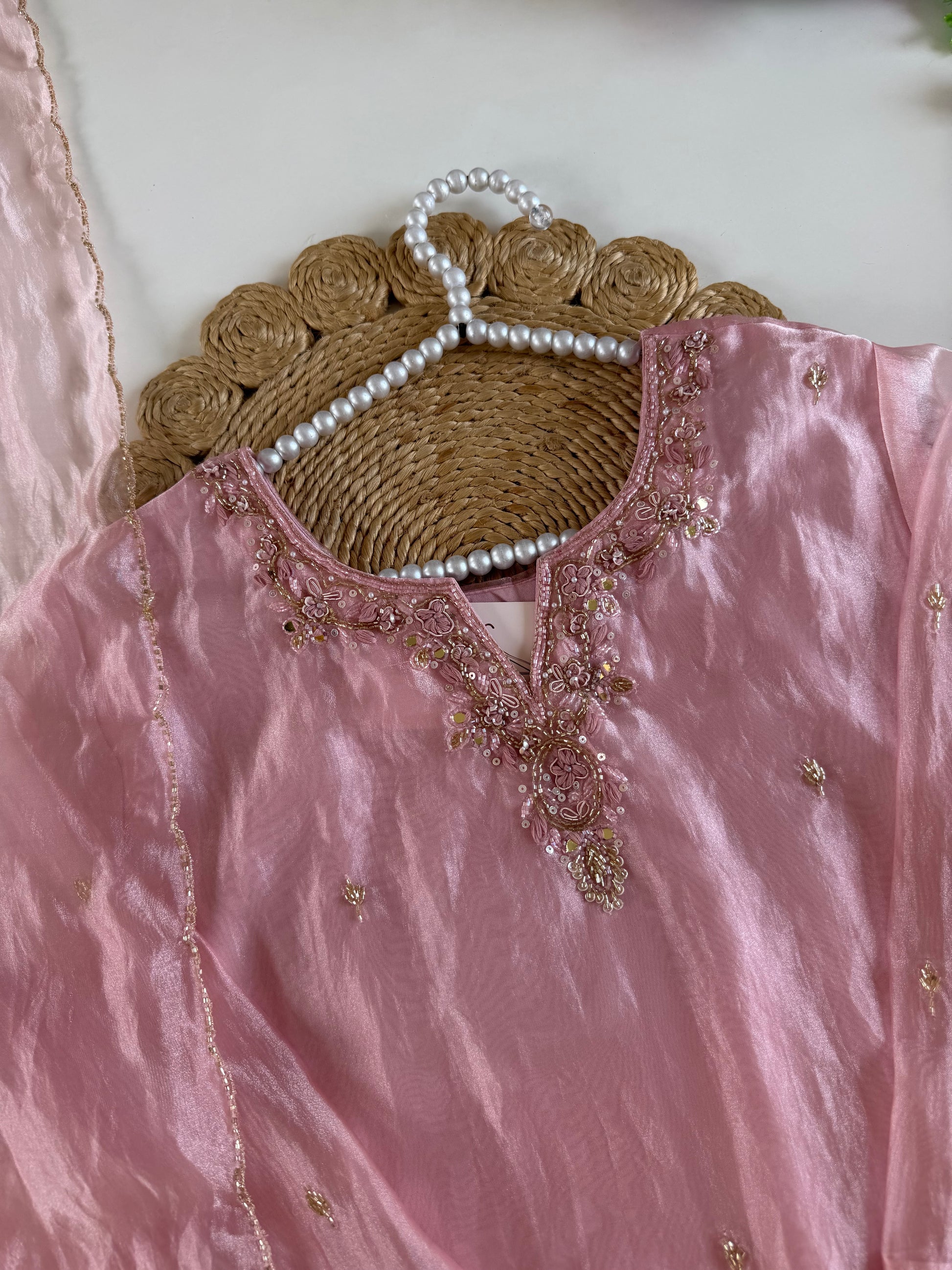 K391 - Glass tissue silk handwork short Kurti with divider pants and dupatta