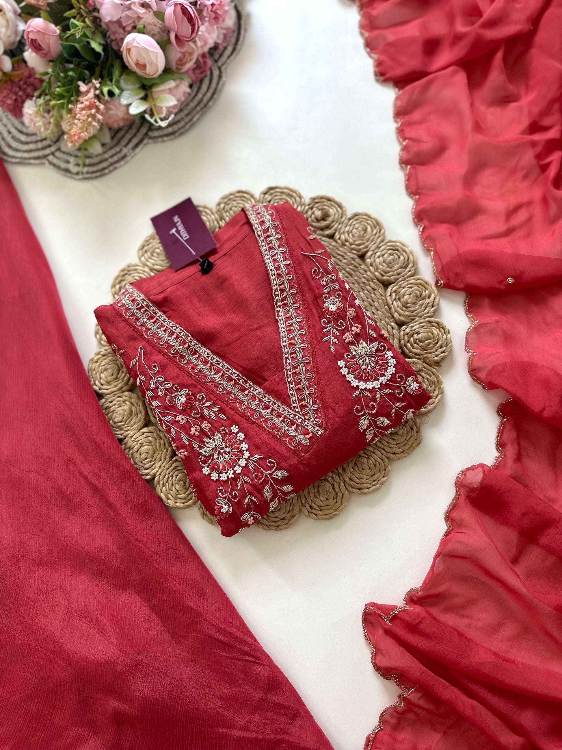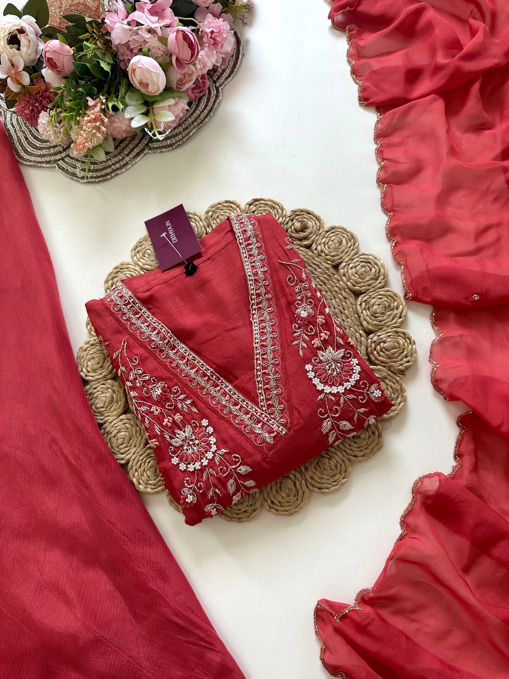This handwork Russian silk short kurti is perfect for adding a touch of elegance to your wardrobe. The detailed handwork adds a unique and intricate design, while the soft silk material offers comfort and sophistication. Paired with a palazzo and dupatta, this set is the perfect choice for any special occasion.
