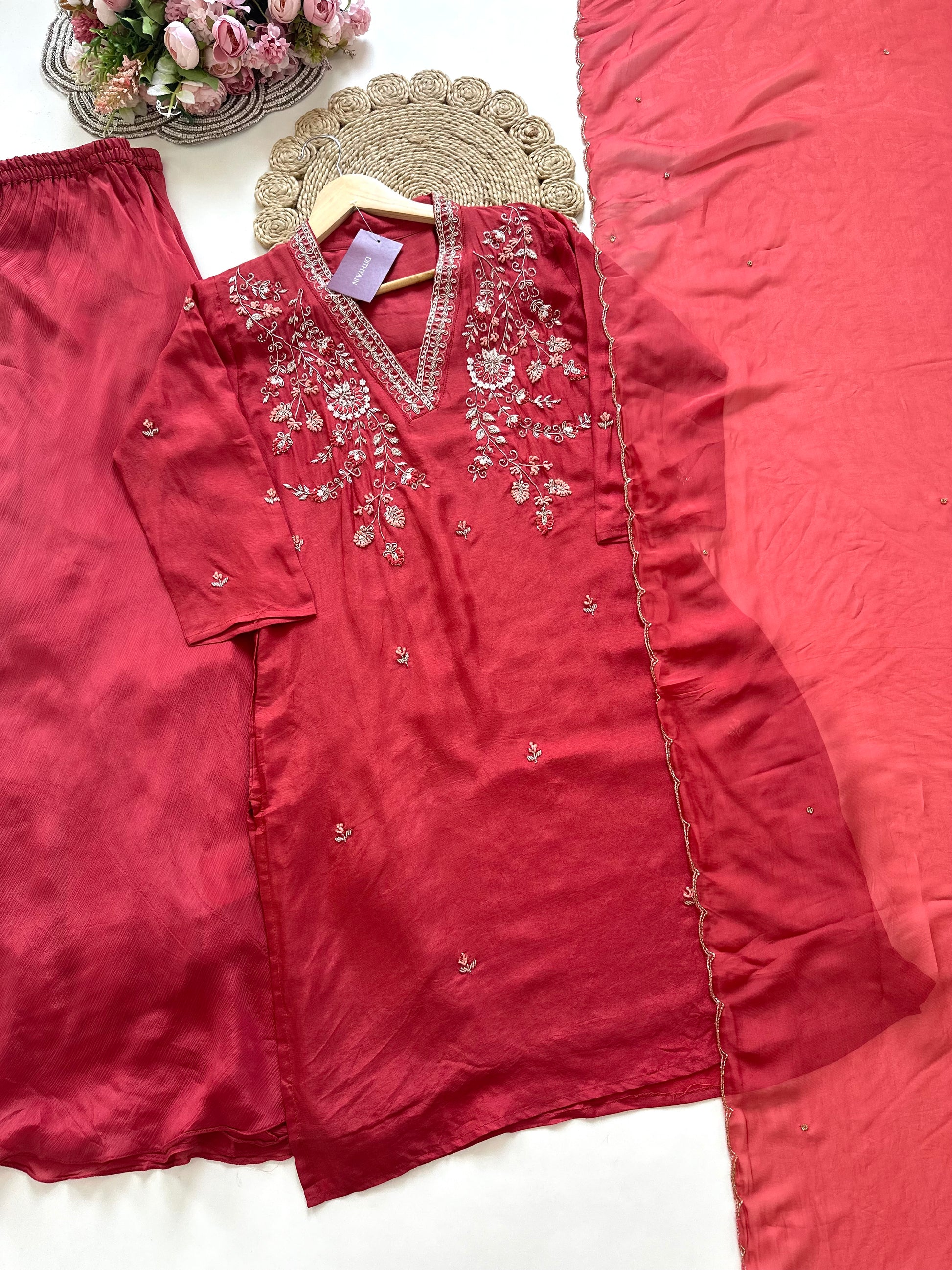 K242 - Handwork Russian silk short kurti with palazzo and dupatta.