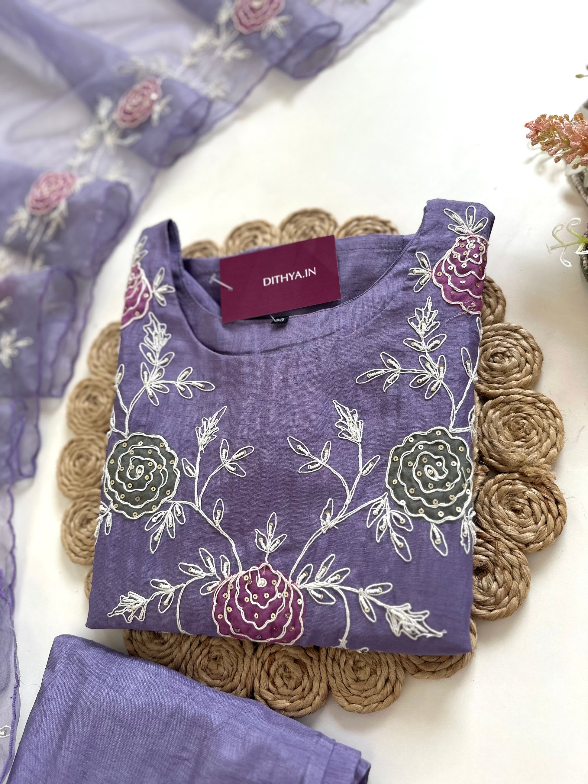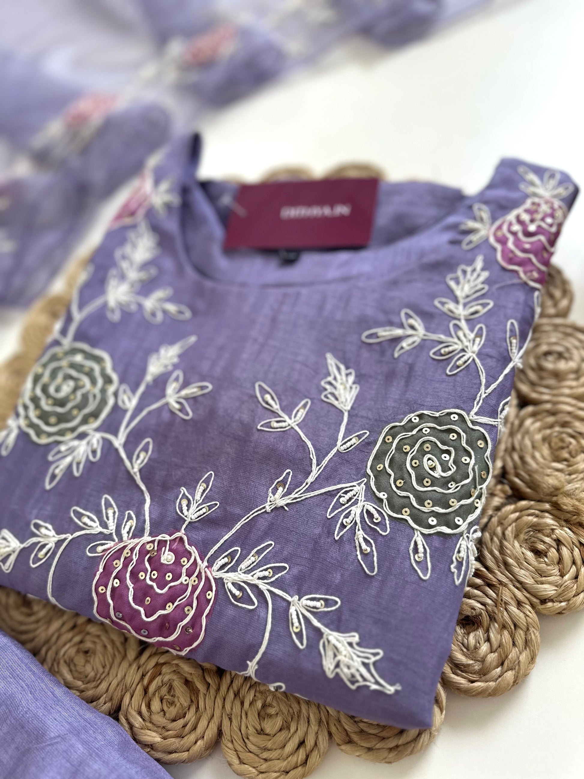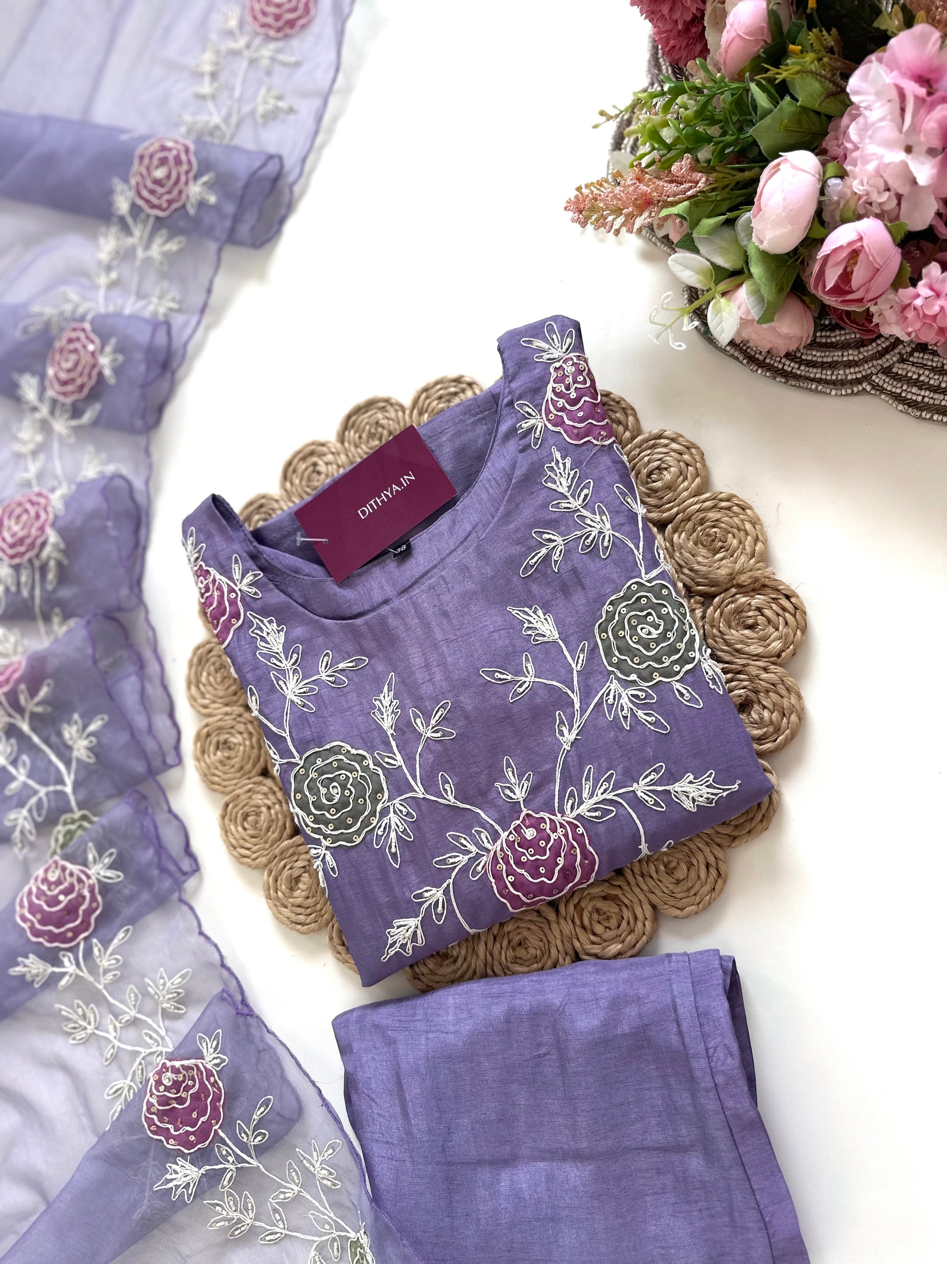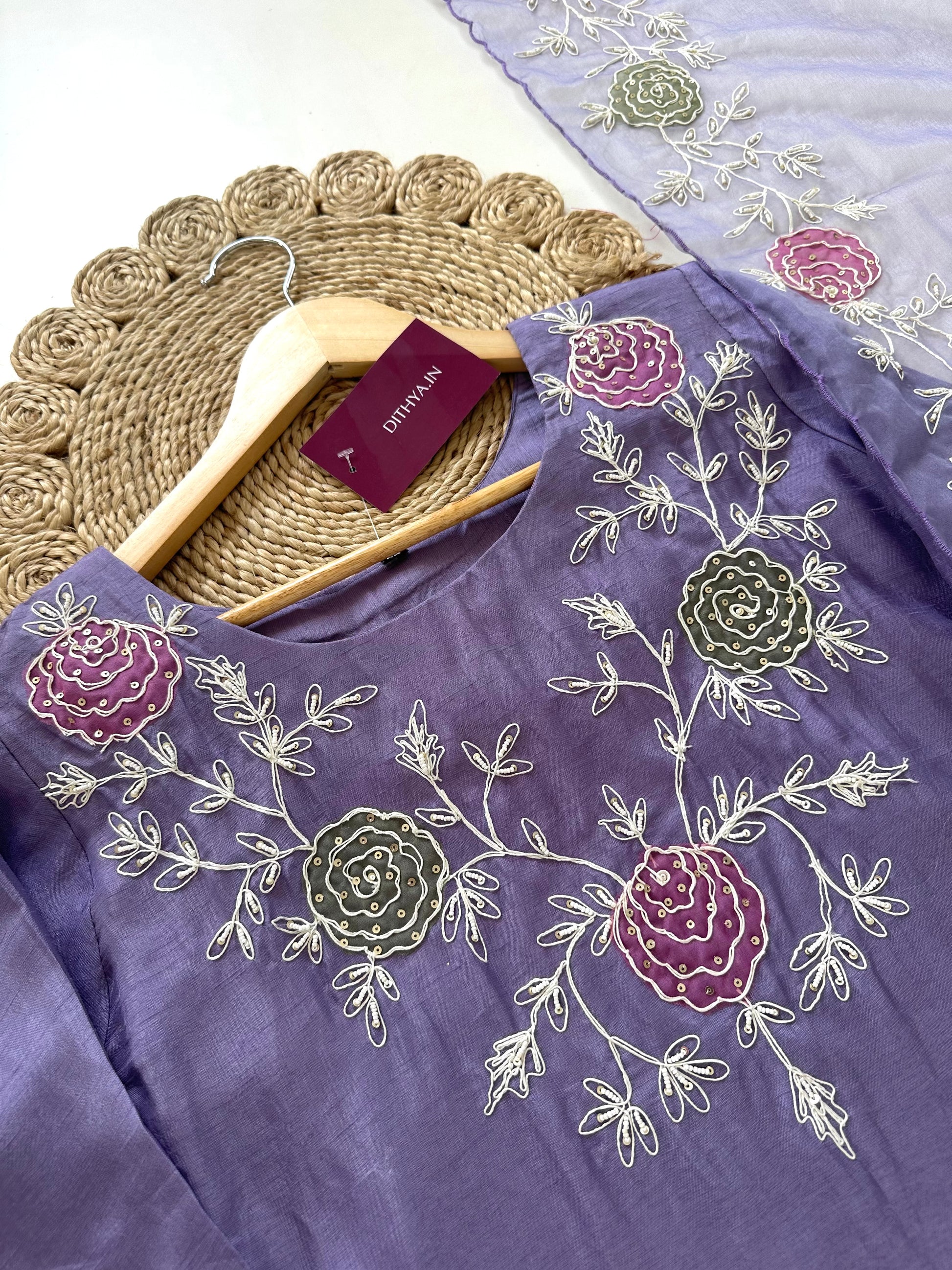 K077 - Russian silk Handwork Straight kurti with pants and dupatta