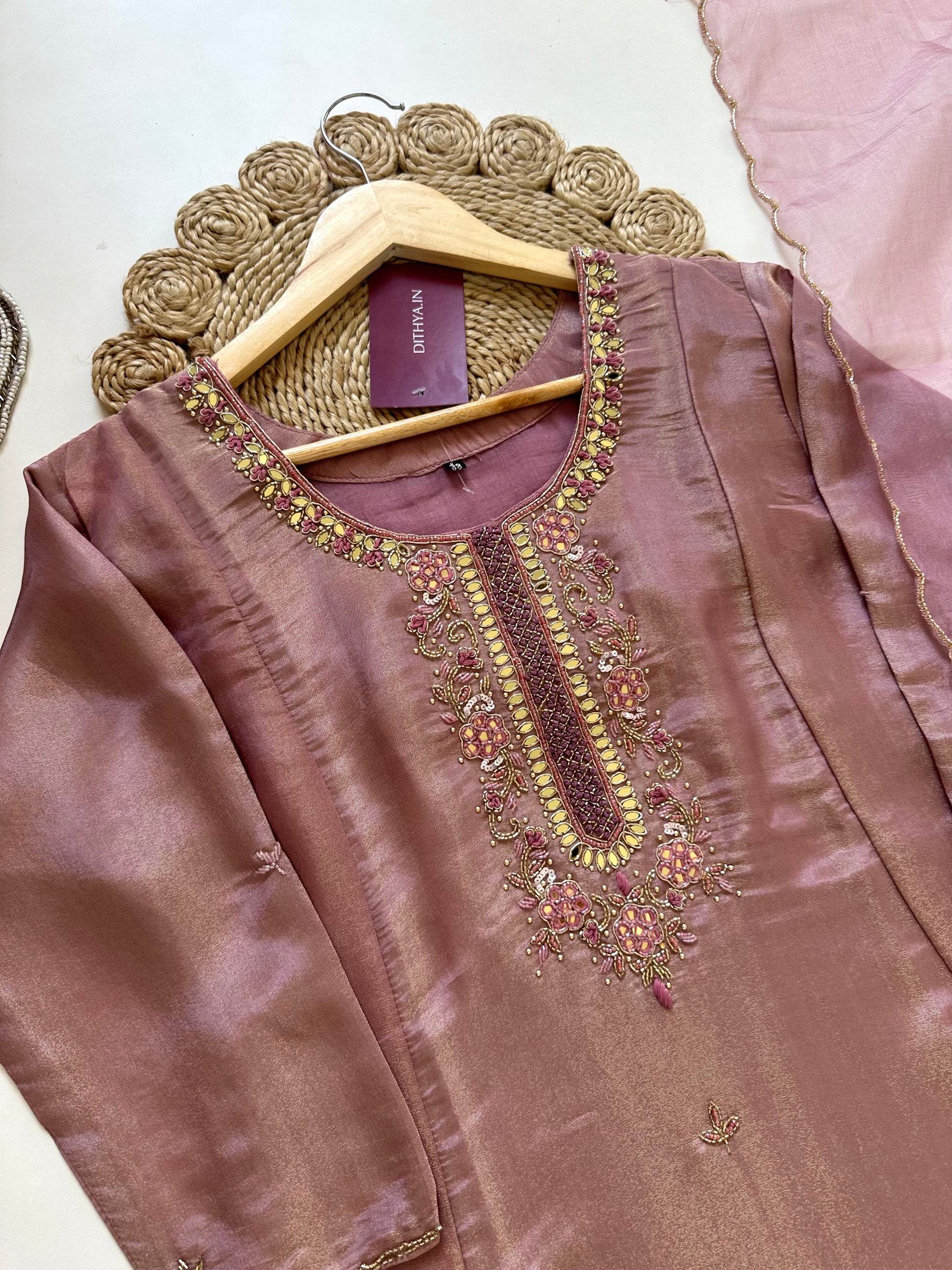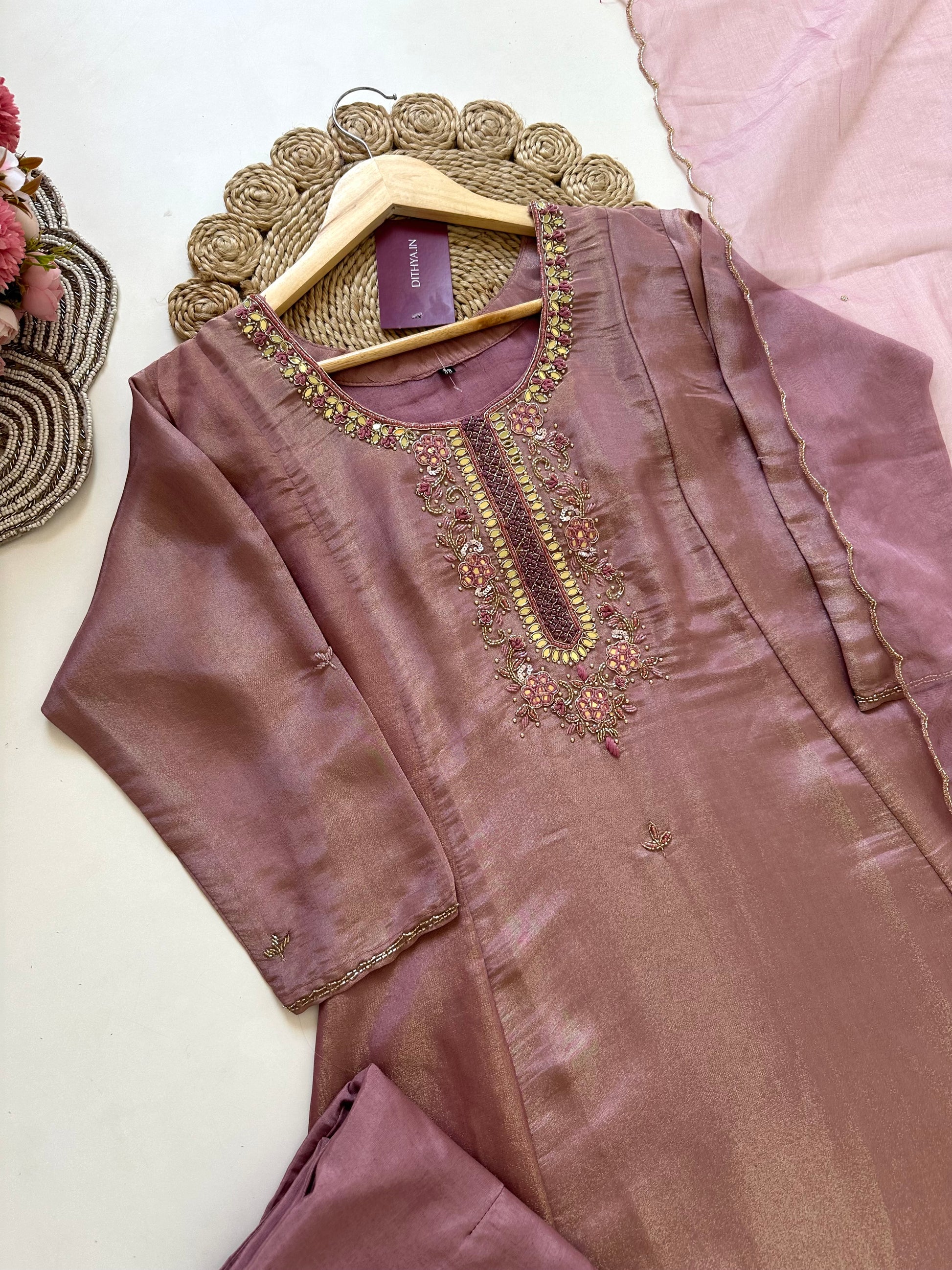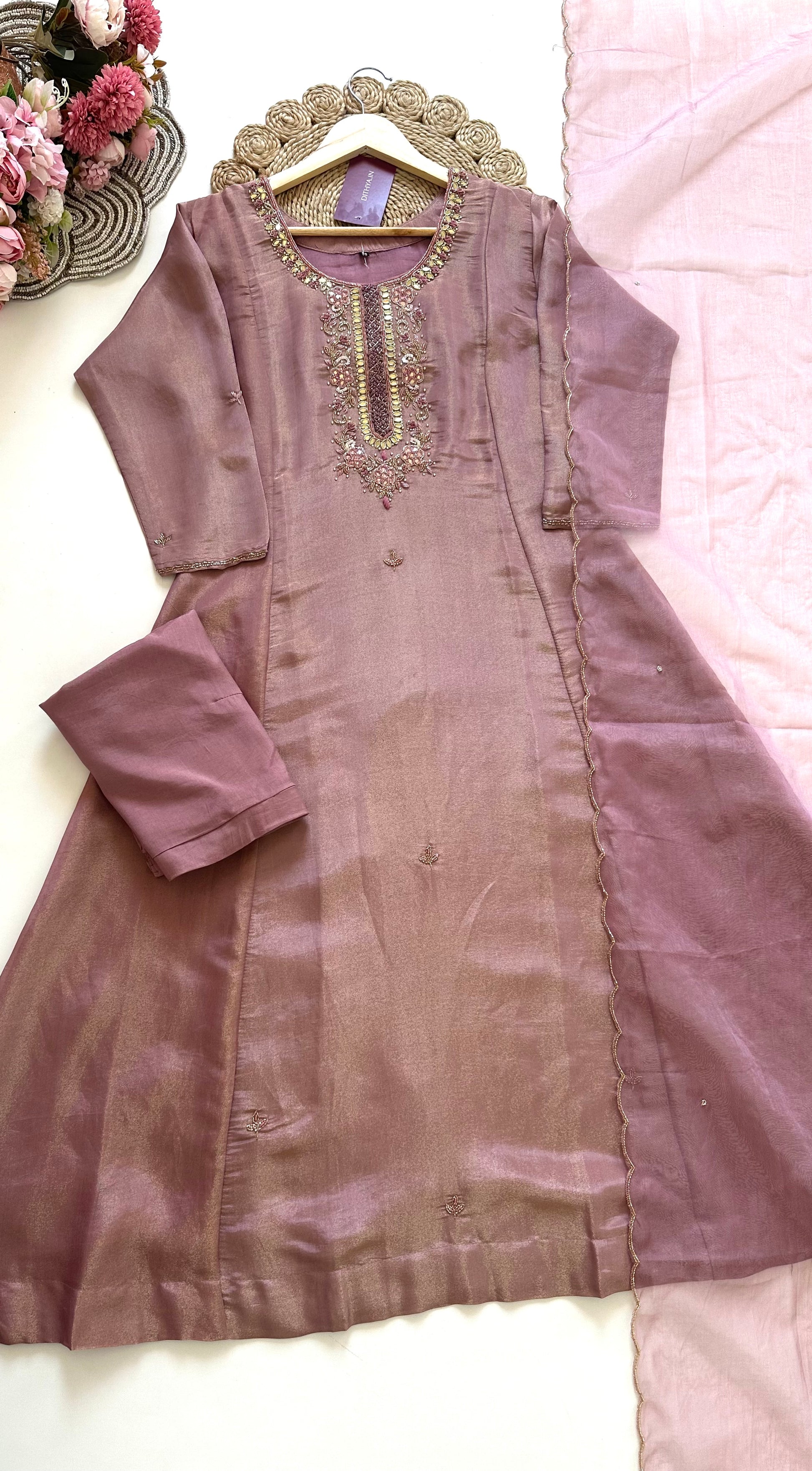 K043 - Handwork Tissue silk Anarkali with pants and dupatta