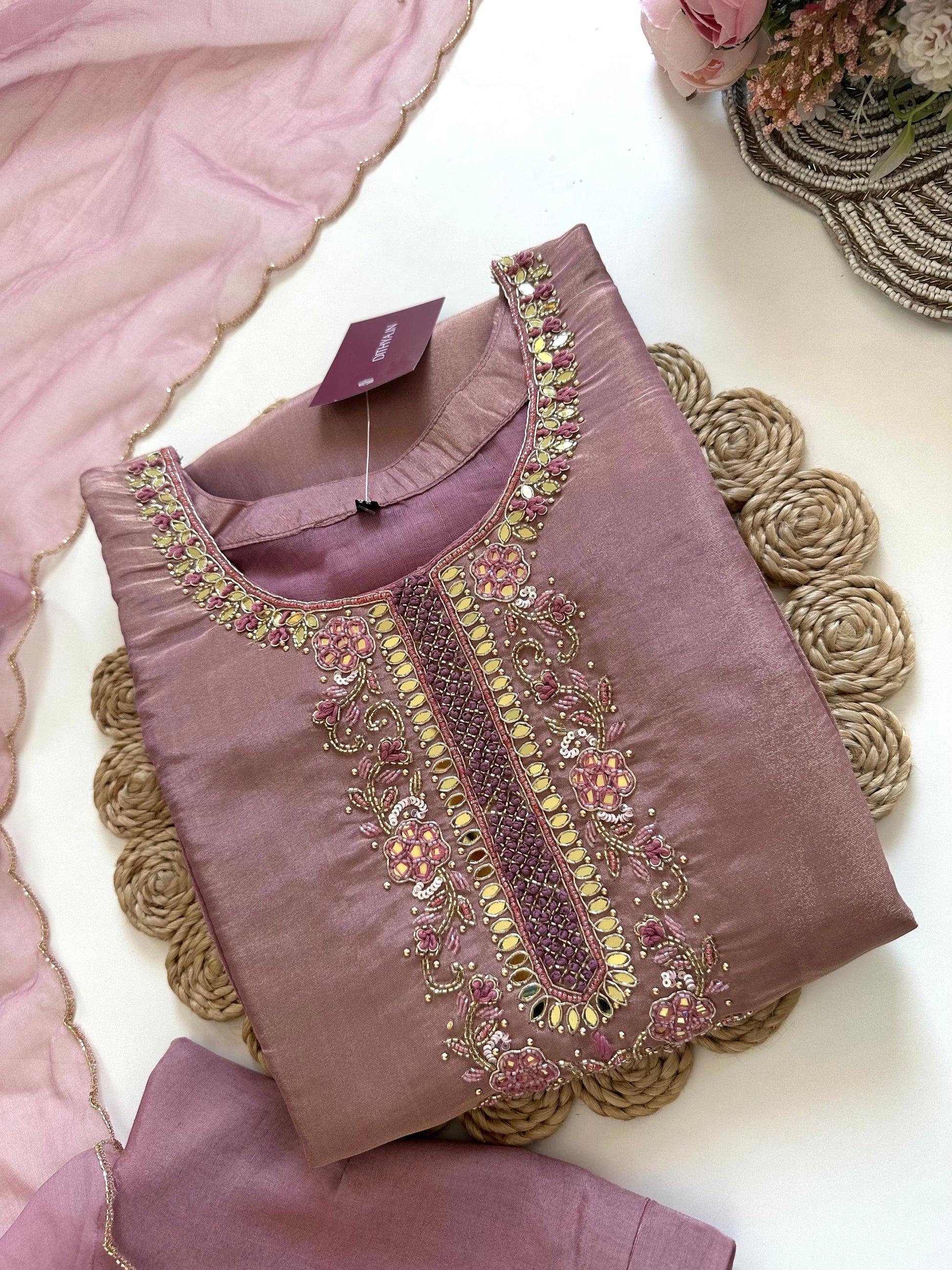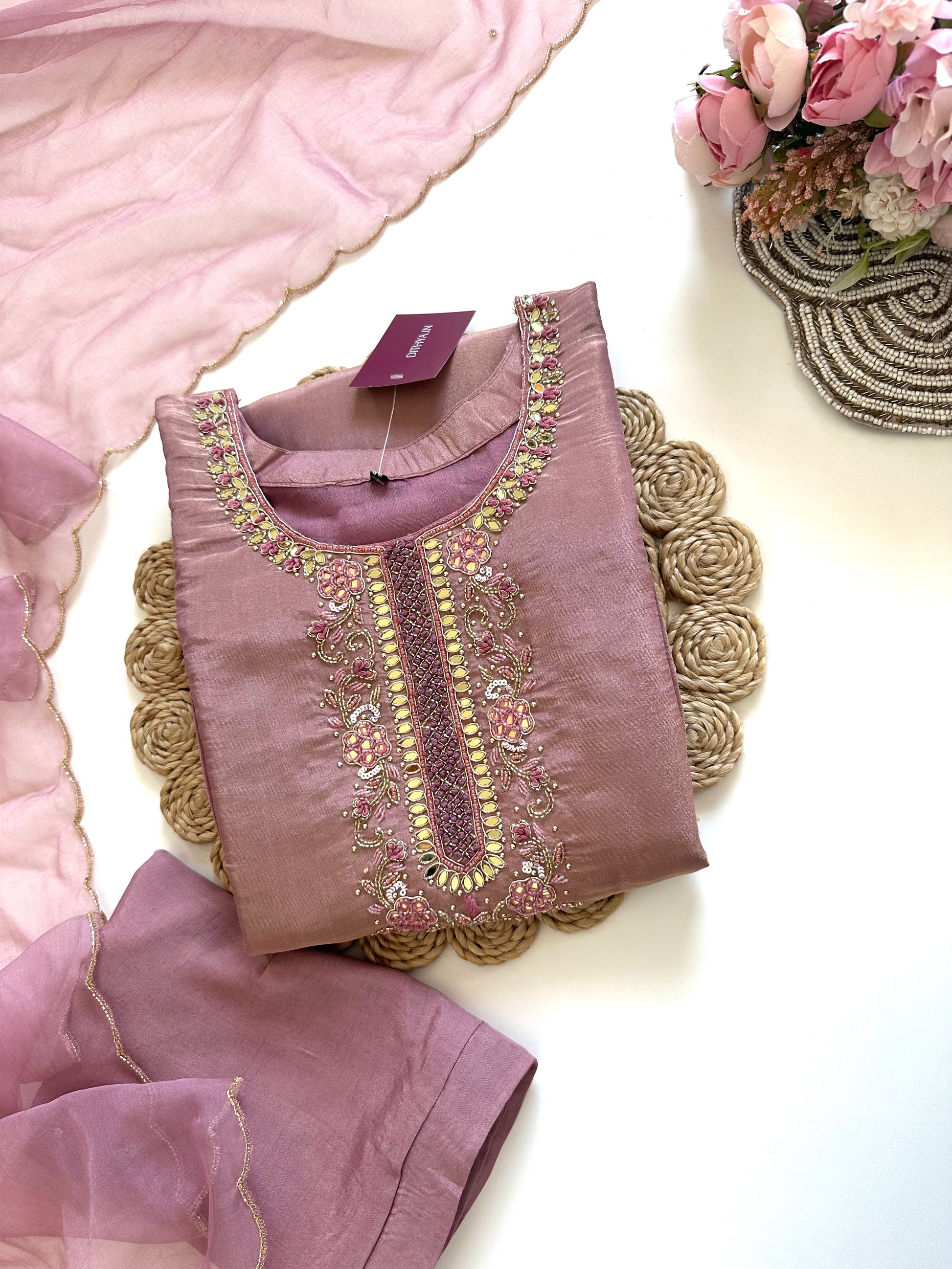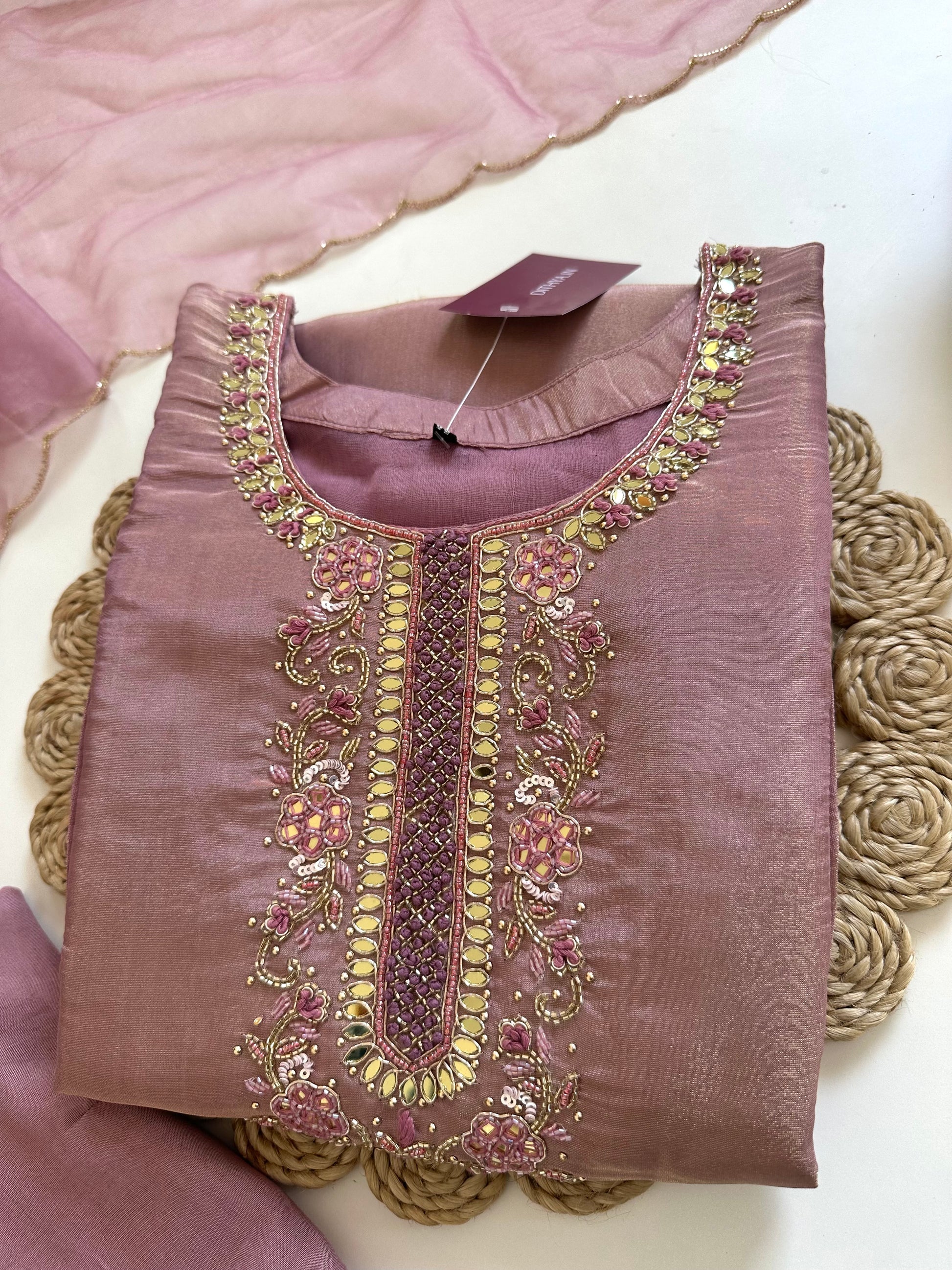 Experience elegance and comfort with our Handwork Tissue silk Anarkali set. The delicate handwork and lightweight fabric make it perfect for any occasion. Includes matching pants and dupatta for a complete look. Elevate your style with this timeless piece.