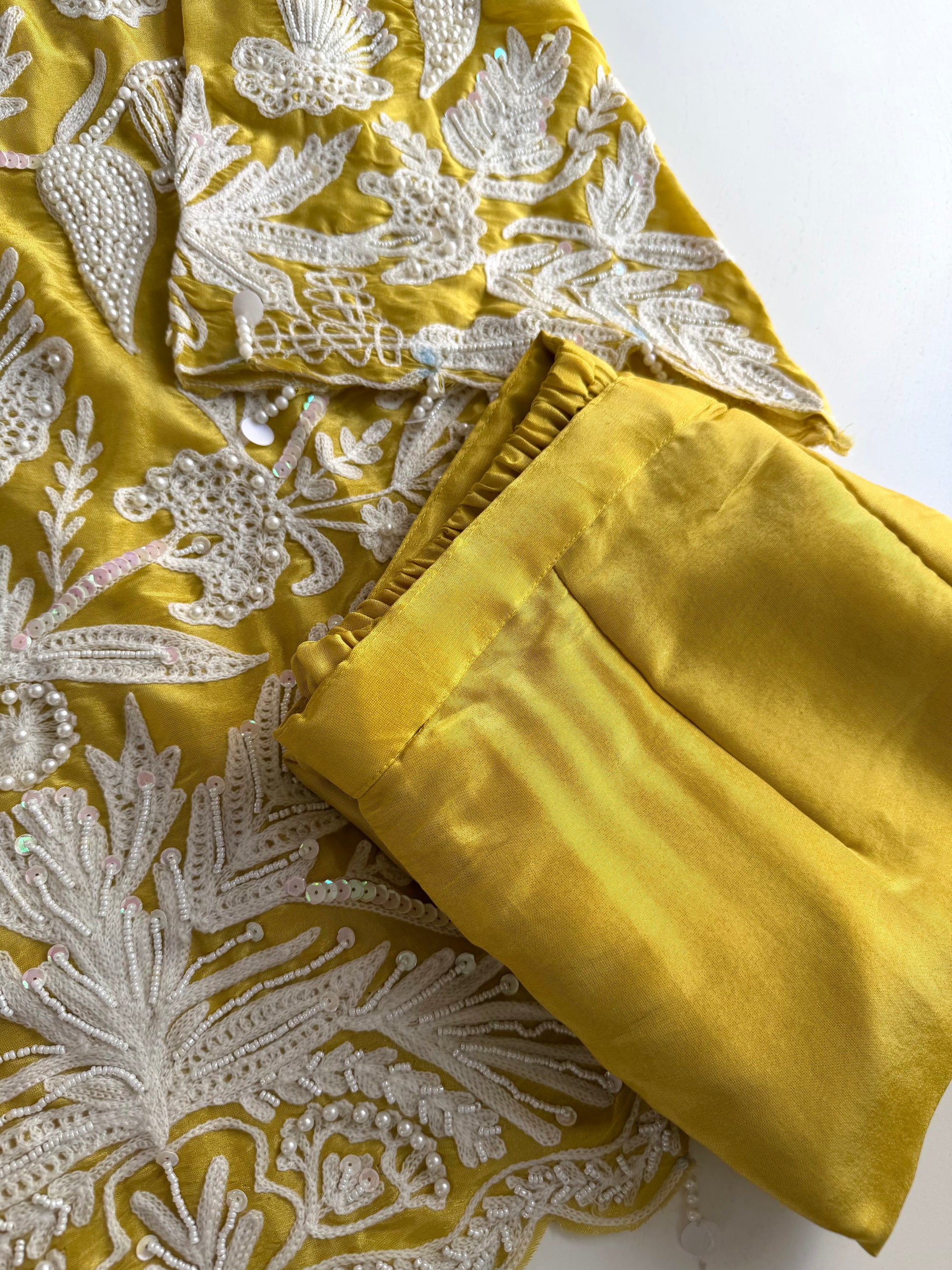This Heavy Handwork Russian Silk Coord Set features exquisite handwork on luxurious Russian silk, offering a timeless and elegant look. Crafted with precision and attention to detail, this set is perfect for special occasions and showcases the expertise of the silk industry. Elevate your wardrobe with this sophisticated and high-quality coord set.